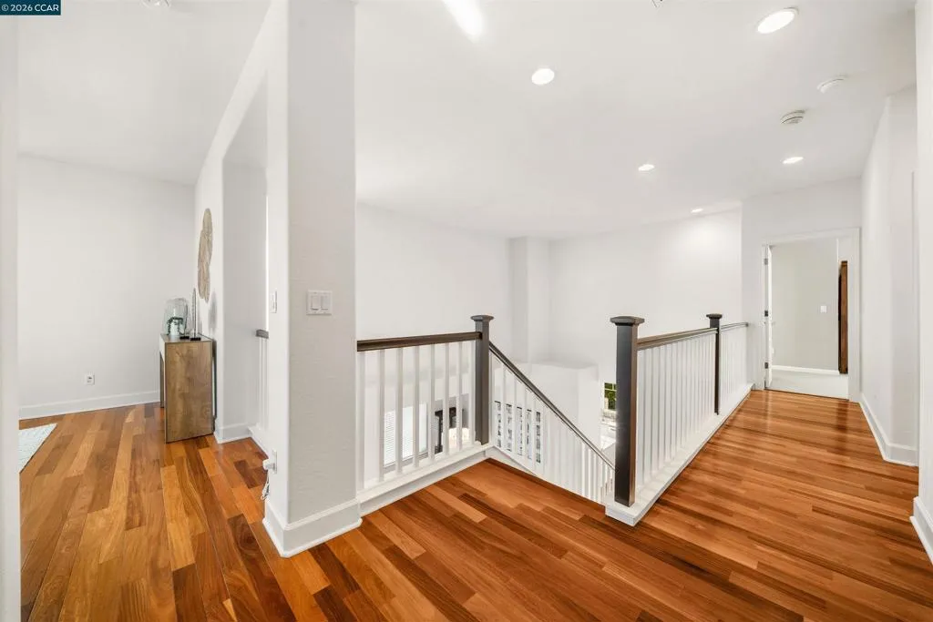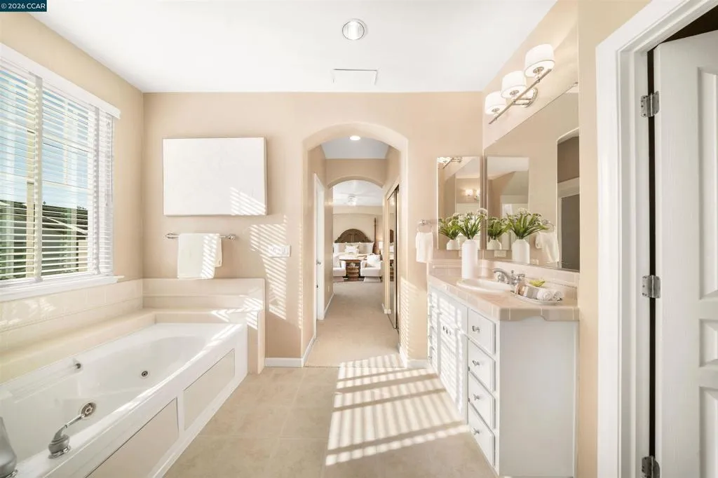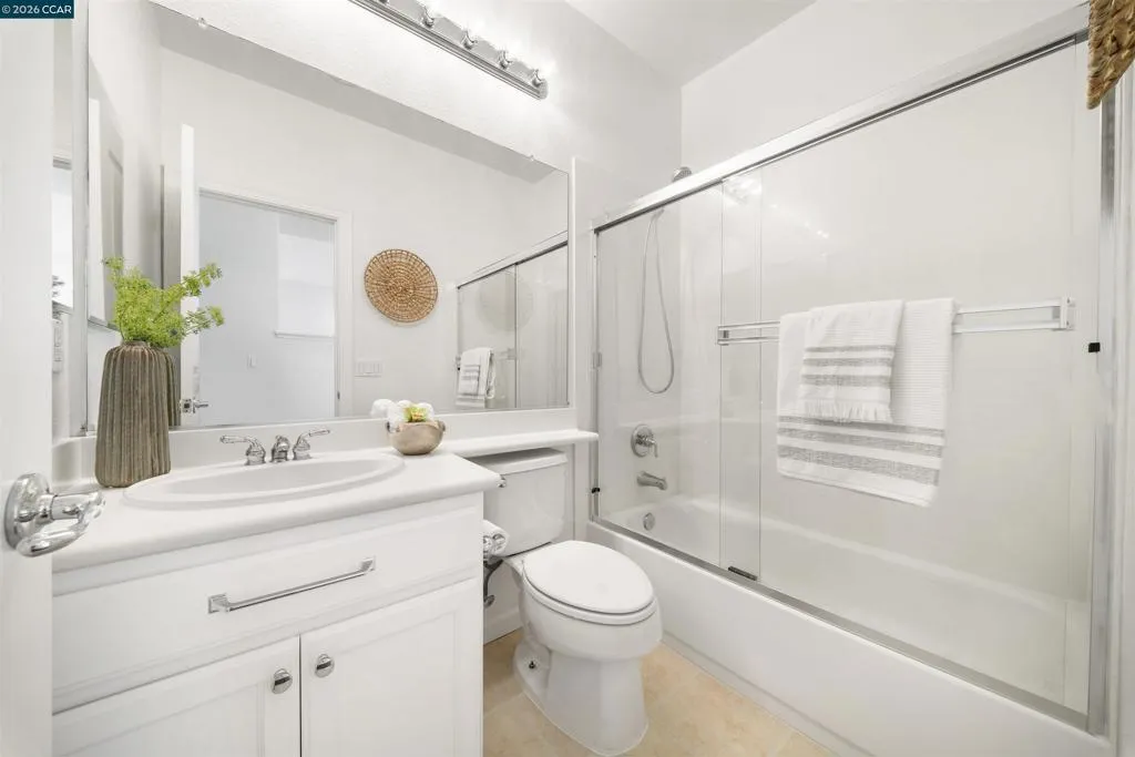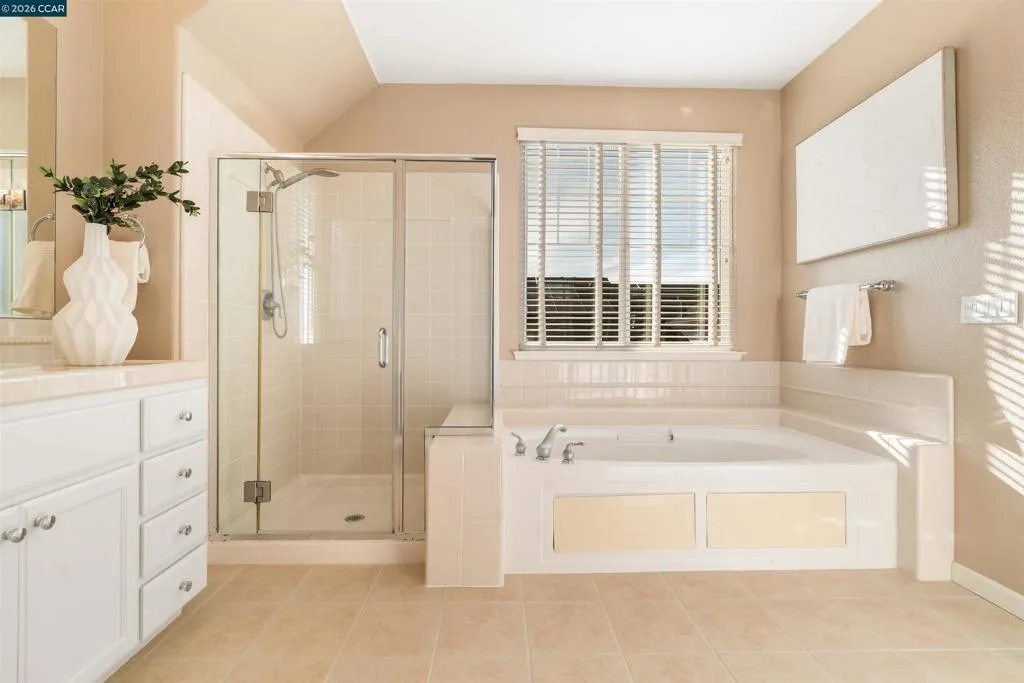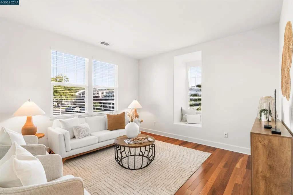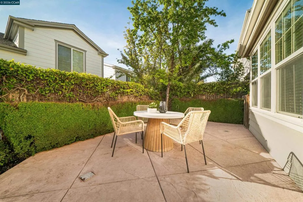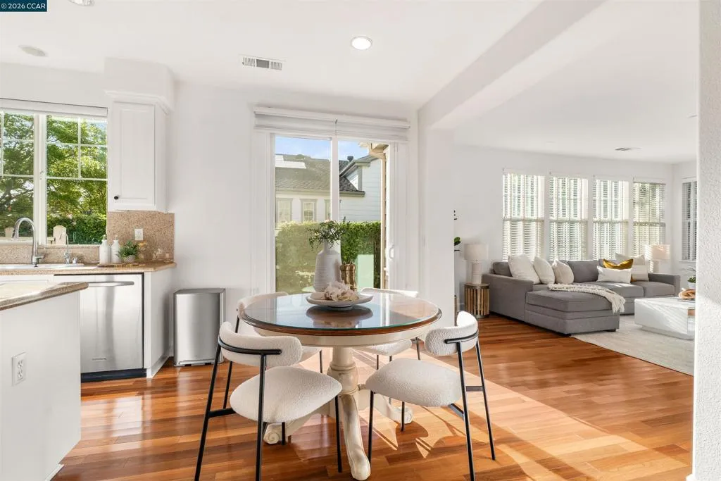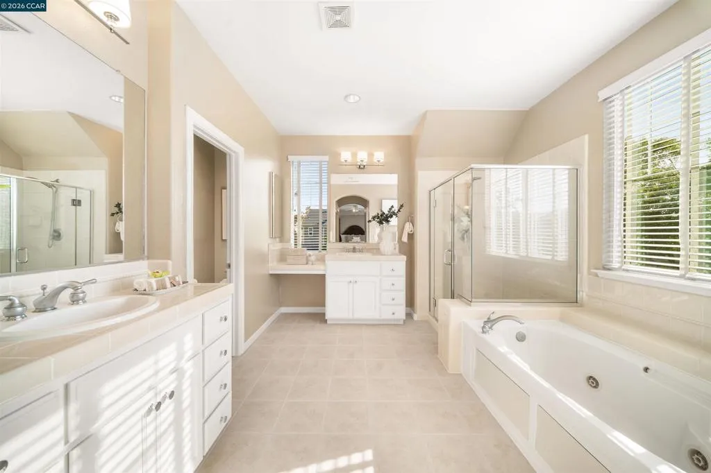 Set on a corner lot in a quiet Windemere cul-de-sac, this charming home features soaring ceilings and bright, inviting interiors throughout. The thoughtful floor plan opens to a versatile formal living room with French doors, and can be used as a home office, sitting room, or flex space. The formal dining room flows easily into the beautifully appointed kitchen, complete with built-in stainless steel appliances, a center island, walk-in pantry, and sunny breakfast nook overlooking the spacious family room. A desirable main-level bedroom and full bath complete the first floor. Upstairs, a bright bonus room offers the perfect setting for a media lounge, study area, playroom, or secondary living space. The light-filled primary suite features two closets, including one walk-in, and an ensuite bath with dual sinks, makeup vanity, soaking tub, and walk-in shower. Two additional secondary bedrooms, a shared bath, and an upstairs laundry room add everyday convenience. The low-maintenance backyard includes a lush lawn and spacious patio, ideal for relaxing or entertaining. Enjoy close proximity to neighborhood parks, top-rated San Ramon Valley schools, and shopping and dining at City Center.