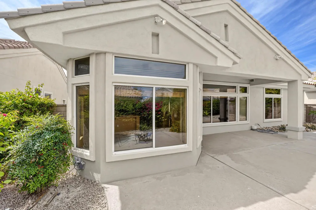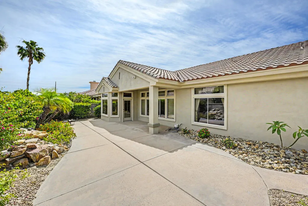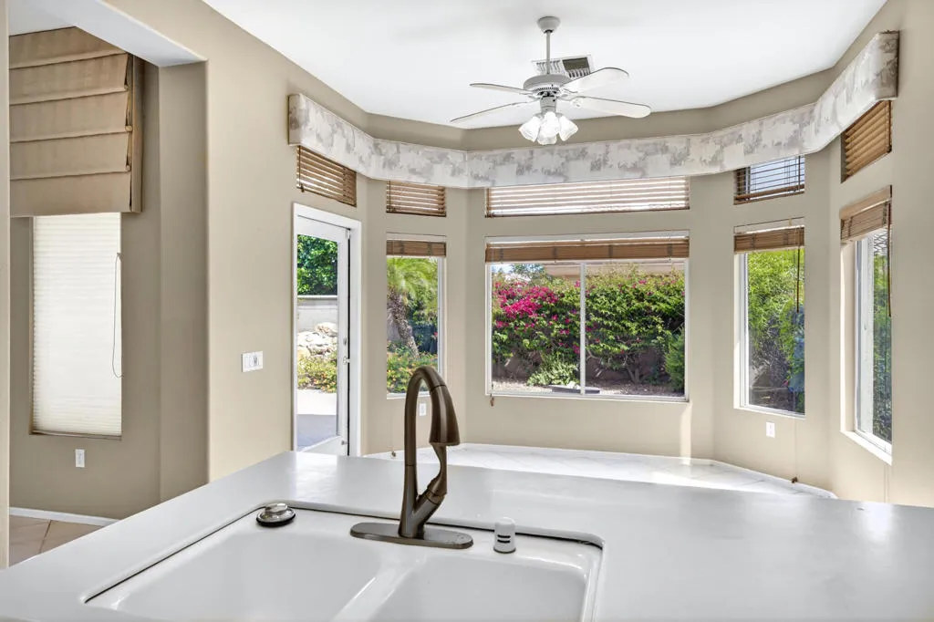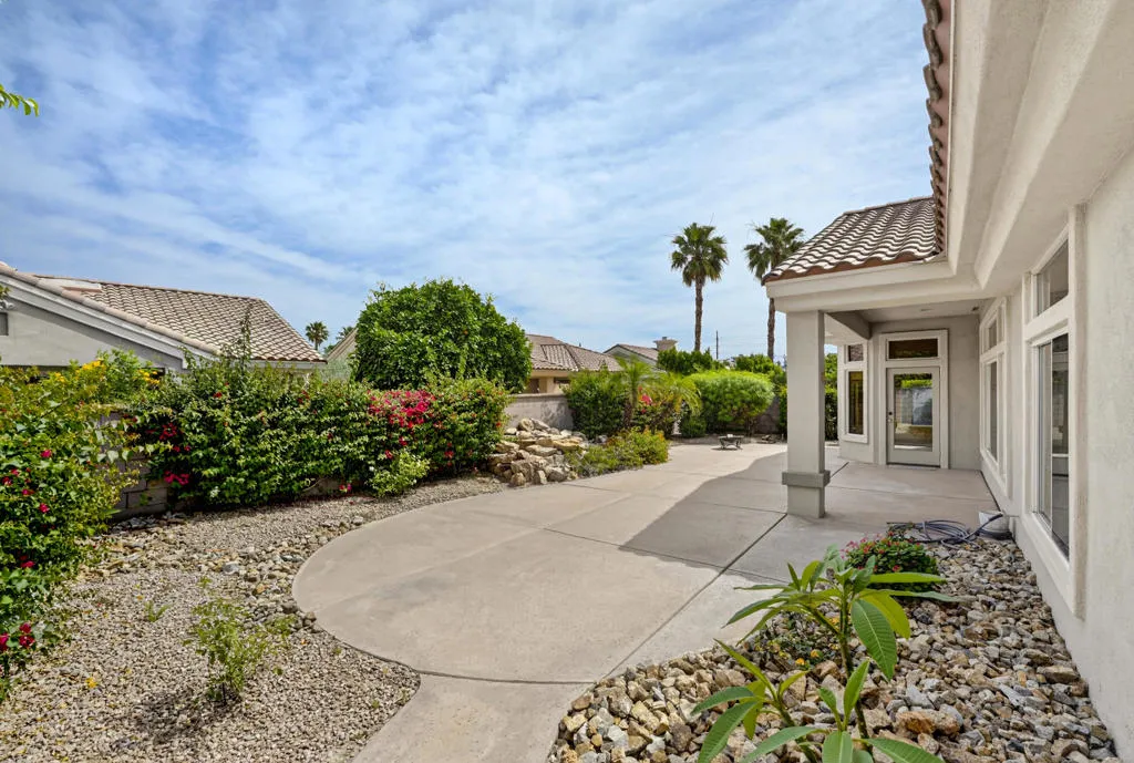 Located within the highly sought-after 55+ community of Sun City Palm Desert, this Lenox floor plan offers a rare opportunity to create your own desert retreat while enjoying a spacious and light-filled layout. With 1,730 square feet, this 2-bedroom, 2-bath home includes a flexible bonus space ideal for a den, office, or additional living area. Upon entry, you're welcomed by an open-concept design that enhances the sense of space throughout. The expansive great room features large-scale tile flooring and a dramatic wall of mirrors, reflecting natural light and creating an airy, inviting atmosphere. Oversized windows and sliding glass doors frame views of the private backyard and bring the outdoors in. The kitchen is bright and functional, complete with abundant cabinetry, generous counter space, a breakfast bar, and a charming dining nook surrounded by windows--perfect for enjoying morning light. The spacious primary bedroom offers a peaceful retreat with ample room, while the ensuite bath features dual vanities, a large walk-in shower enclosure, and plenty of storage. A guest bedroom is well-positioned for privacy and comfort. Step outside to a serene backyard with mature desert landscaping, winding hardscape, and a covered patio--offering a quiet setting for relaxing or entertaining. The front courtyard entry adds charm and curb appeal and easily enjoyable with french doors. Exterior of home was painted in 2023. Priced to sell, this home presents an incredible value and the perfect canvas to update and customize to your personal style. Sun City Palm Desert offers a true resort lifestyle with 3 clubhouses, an indoor pool, multiple outdoor pools, two championship golf courses, tennis, pickleball, bocce ball, and even a softball field. With over 80 clubs and social groups, there's something for everyone, while the HOA includes cable TV and internet--making everyday living both convenient and connected.