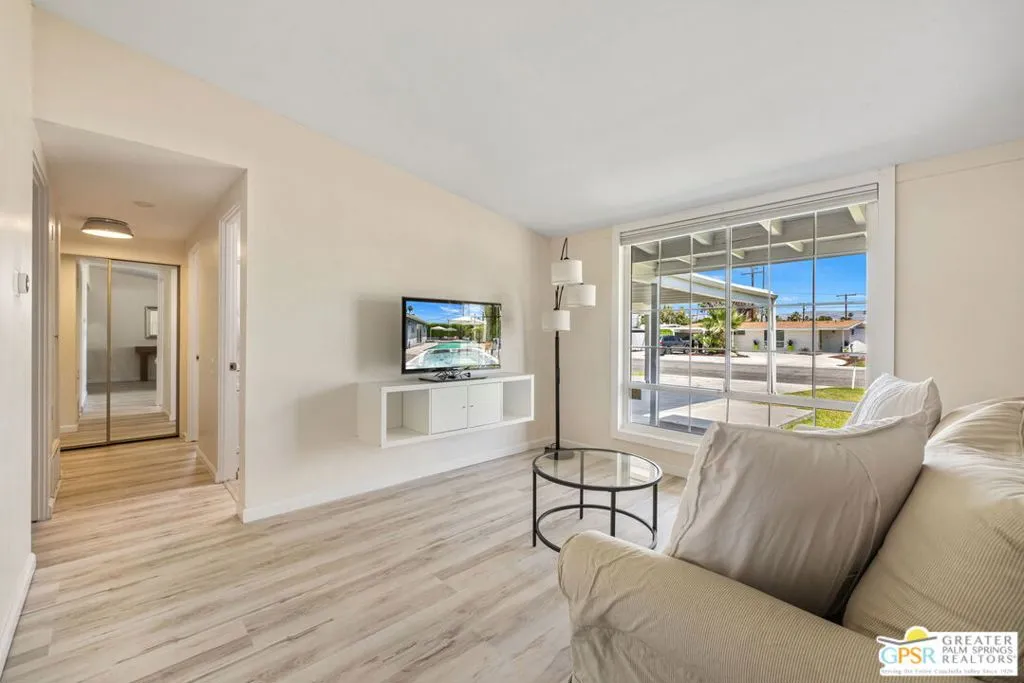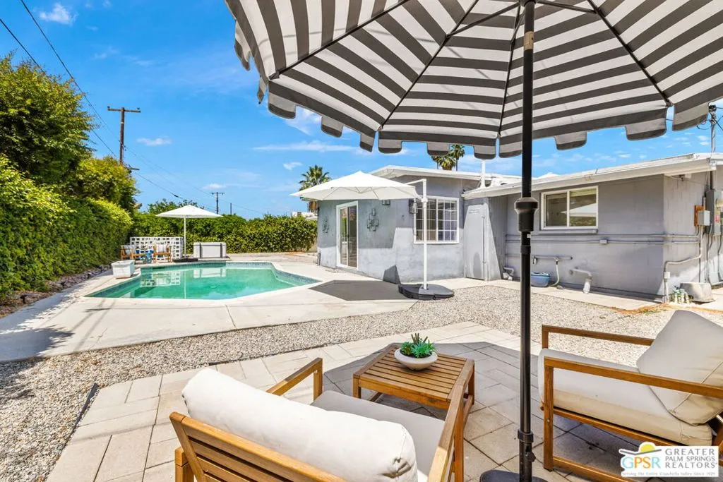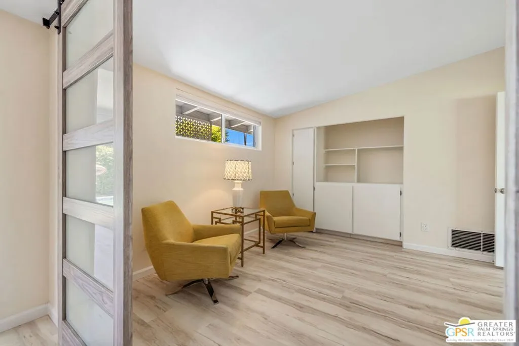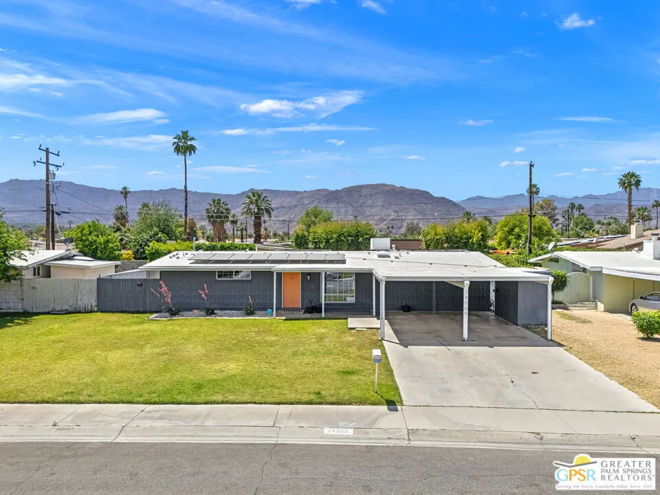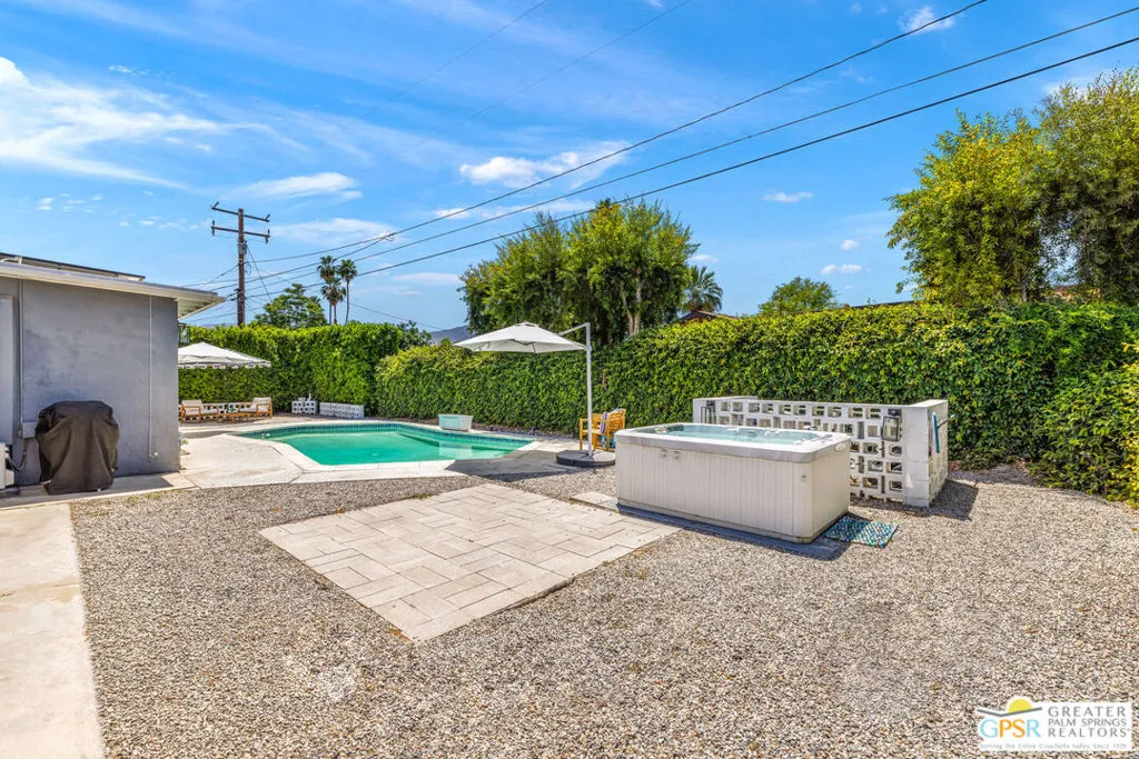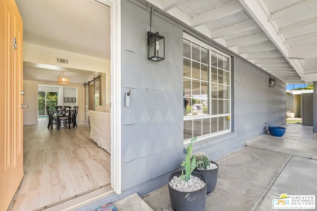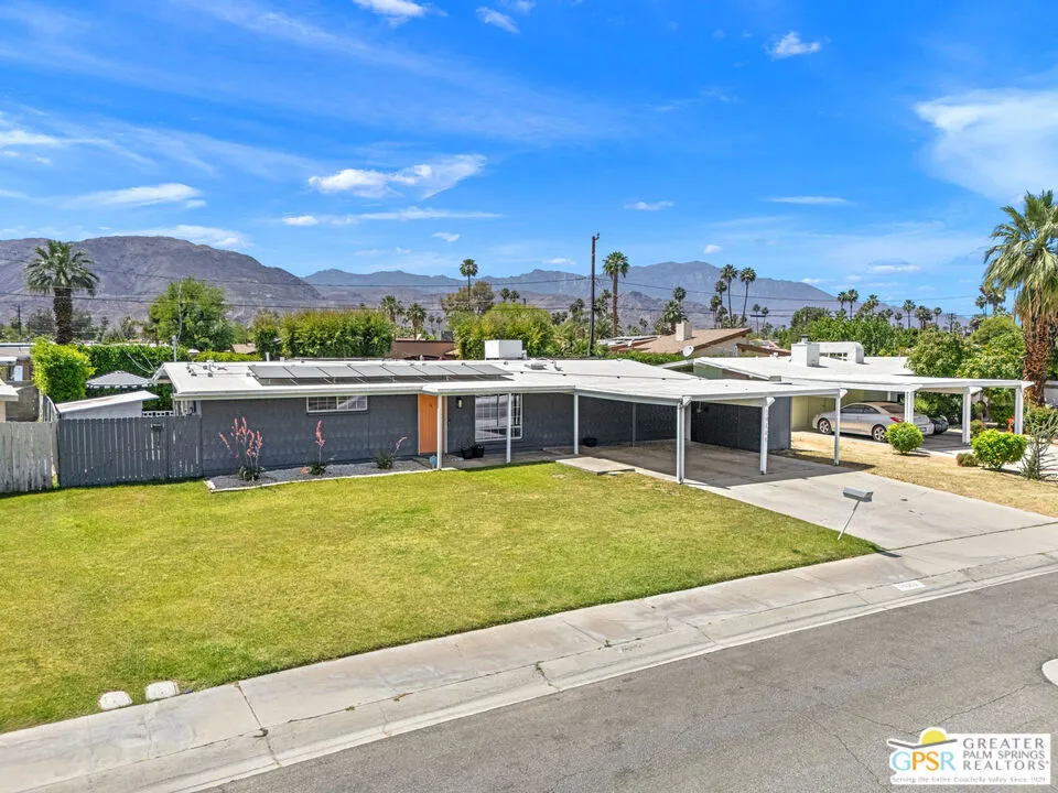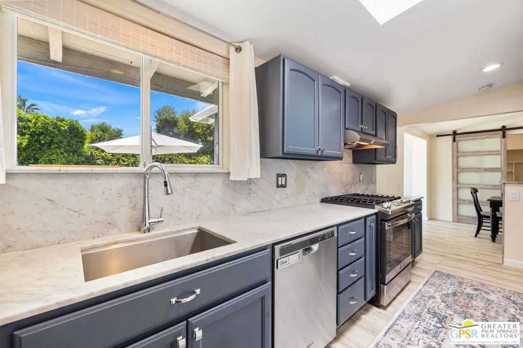 Mid century style. Modern upgrades. Central Palm Desert with no HOA and Fee land you own. This stylish single story residence delivers character, comfort, and privacy. The striking facade with original concrete block detailing sets the tone. Inside, a bright open layout has been thoughtfully reimagined with crisp neutral paint and light wood look flooring running throughout the main living areas. Sliding barn doors with frosted glass panels add a touch of rustic modern style and flexibility of use. The updated galley kitchen stands out with deep blue cabinetry, marble countertops and backsplash, skylight, and stainless appliances. The well designed floor plan offers excellent separation of bedrooms. The primary suite is positioned away from guest rooms for added privacy. Two additional bedrooms plus a versatile den or office easily function as a fourth bedroom. Newer central HVAC and two mini split systems with Nest thermostats allow for efficient climate control. Outdoors, a private hedged yard creates a true retreat with a classic bow tie pool and spa, generous patio space, and desert friendly landscaping. Leased rooftop solar is in place, along with an EV charger and battery backup. A compelling combination of style, upgrades, and value in a central Palm Desert location.