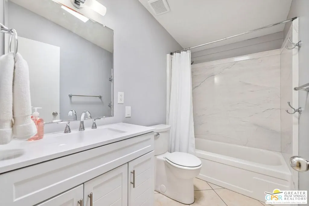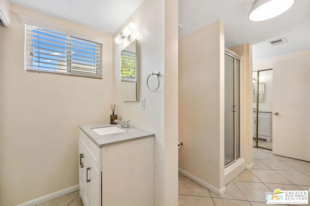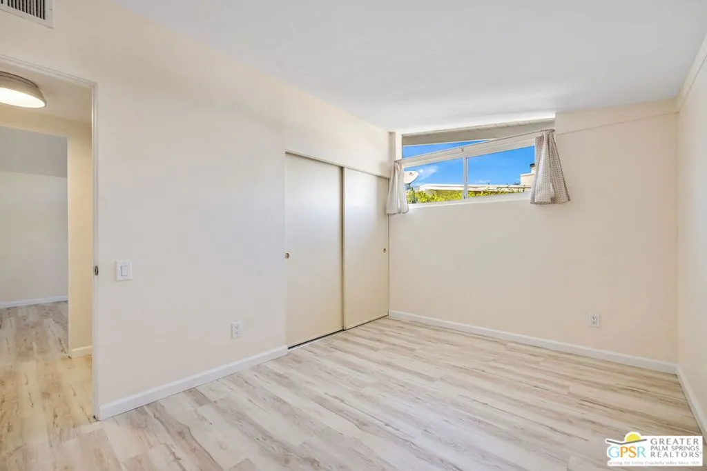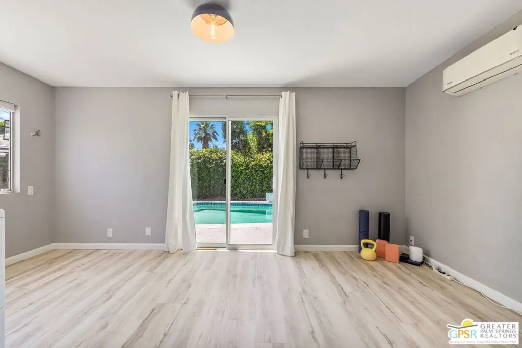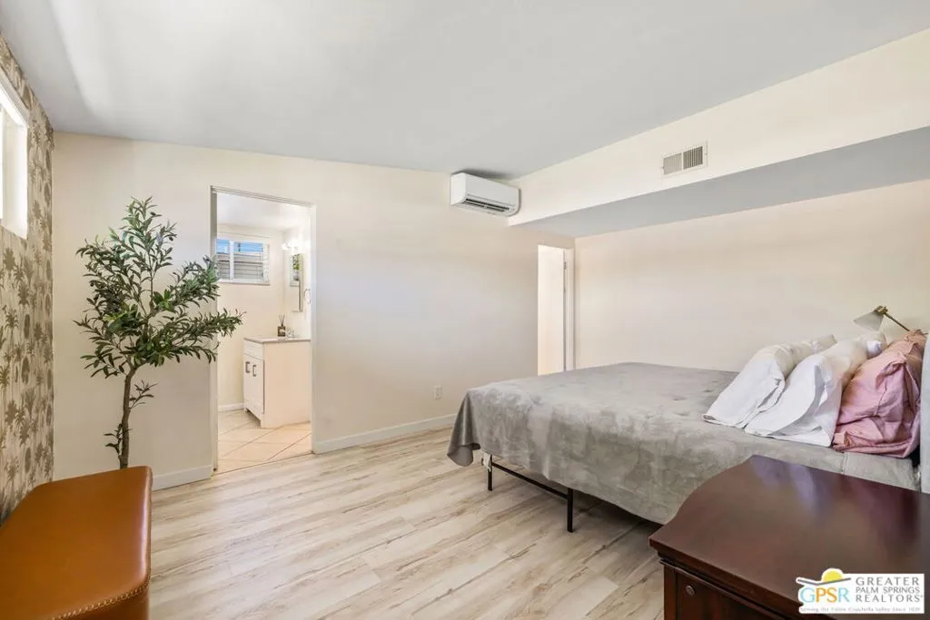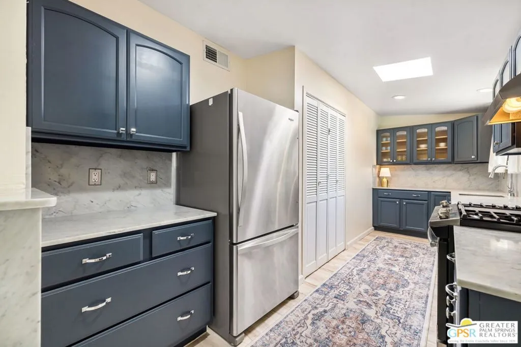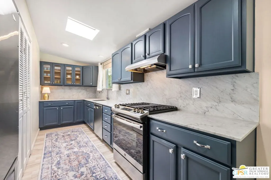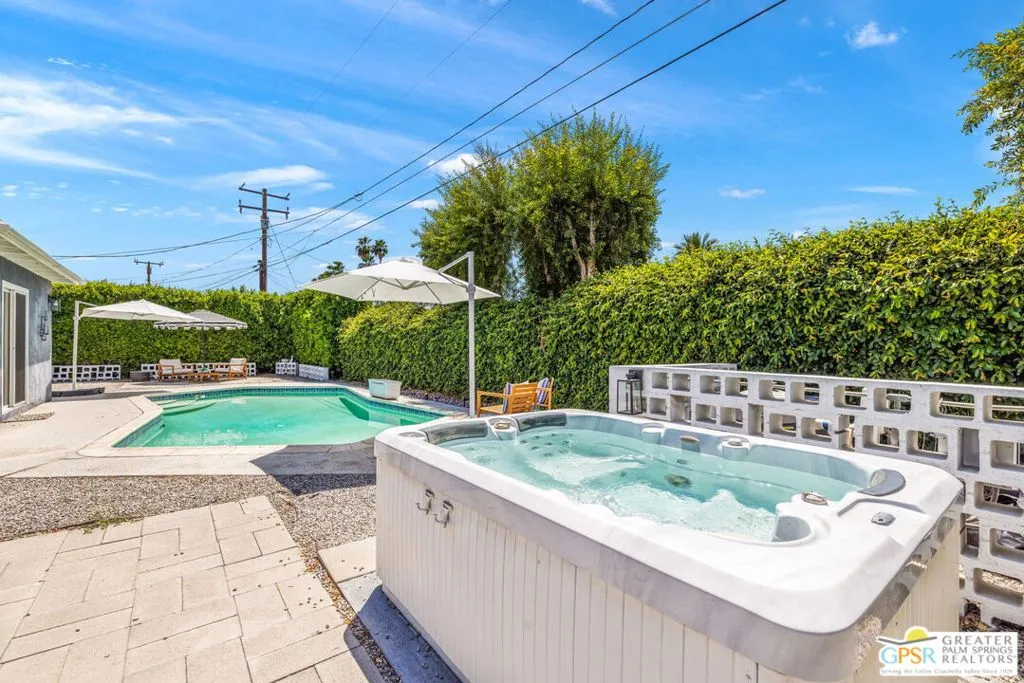 Mid century style. Modern upgrades. Central Palm Desert with no HOA and Fee land you own. This stylish single story residence delivers character, comfort, and privacy. The striking facade with original concrete block detailing sets the tone. Inside, a bright open layout has been thoughtfully reimagined with crisp neutral paint and light wood look flooring running throughout the main living areas. Sliding barn doors with frosted glass panels add a touch of rustic modern style and flexibility of use. The updated galley kitchen stands out with deep blue cabinetry, marble countertops and backsplash, skylight, and stainless appliances. The well designed floor plan offers excellent separation of bedrooms. The primary suite is positioned away from guest rooms for added privacy. Two additional bedrooms plus a versatile den or office easily function as a fourth bedroom. Newer central HVAC and two mini split systems with Nest thermostats allow for efficient climate control. Outdoors, a private hedged yard creates a true retreat with a classic bow tie pool and spa, generous patio space, and desert friendly landscaping. Leased rooftop solar is in place, along with an EV charger and battery backup. A compelling combination of style, upgrades, and value in a central Palm Desert location.