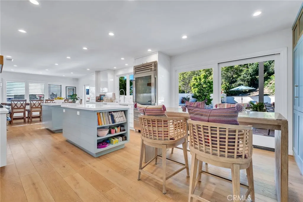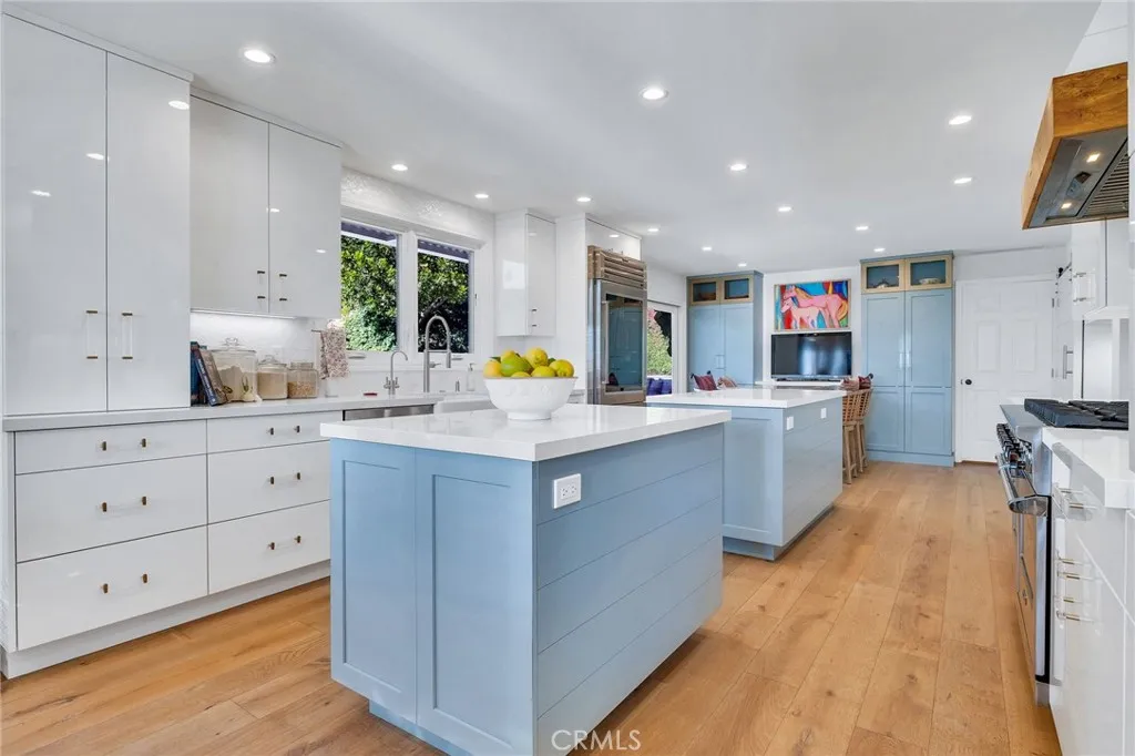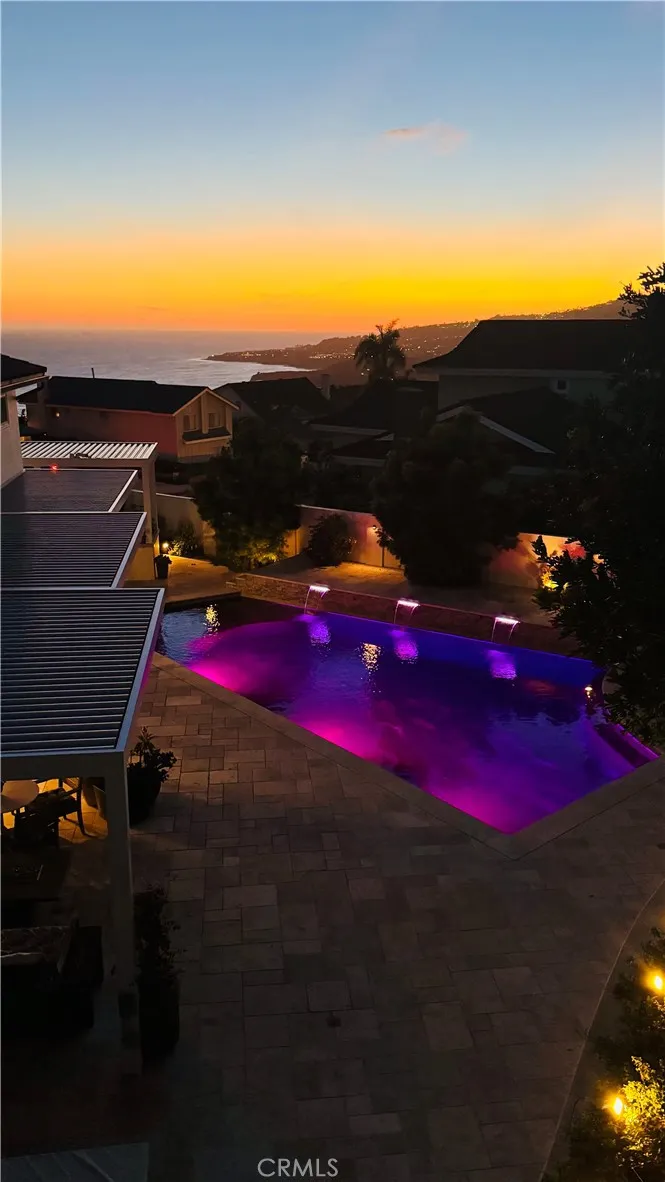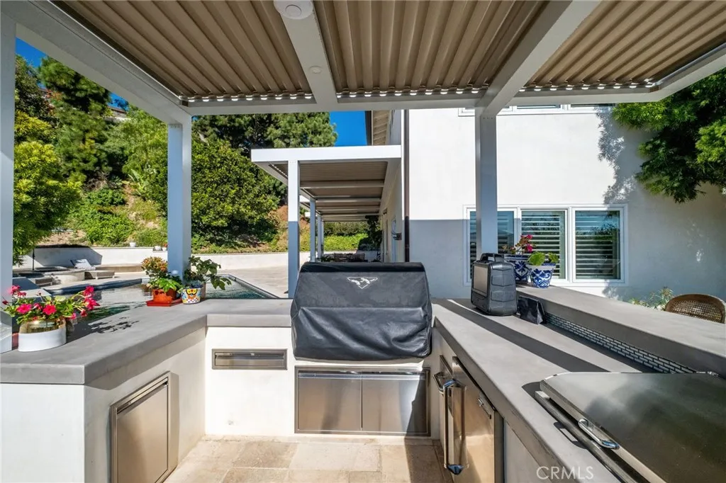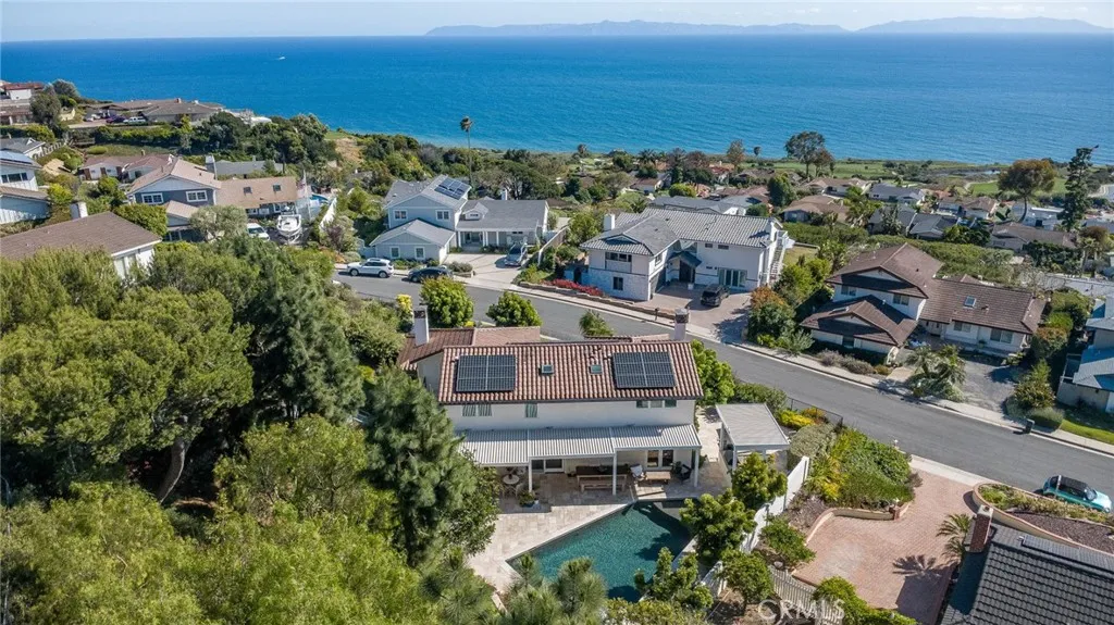 Nestled in the highly sought-after Ladera Linda neighborhood of Rancho Palos Verdes, this extensively remodeled coastal residence offers a seamless blend of luxury, functionality, and resort-style living. Situated on an expansive approximately 15,759-square-foot lot, the home features 4 bedrooms, 3 bathrooms, and approximately 3,359 square feet of thoughtfully curated living space, enhanced with high-end finishes and modern conveniences throughout. The interior showcases a beautifully designed chef’s kitchen with premium appliances, dual islands, and elegant stone surfaces, flowing effortlessly into light-filled living spaces highlighted by European oak flooring, custom shutters, and multiple fireplaces. The spacious primary suite serves as a private retreat, featuring breathtaking ocean and coastline views, a spa-inspired bathroom with a soaking tub and oversized shower, and generous closet space. Designed for both everyday comfort and elevated entertaining, the home is equipped with integrated smart systems including security, lighting, Sonos audio, and whole-home WiFi networking. Additional upgrades include a fully finished garage with drywall, extensive built-in storage, an elevated laundry area for ease of use, and a custom dog-washing station. Outdoor living is exceptional. The backyard showcases a remodeled saltwater pool and spa with water features, an expansive view deck, and a fully equipped outdoor kitchen with BBQ, refrigeration, bar seating, and a newly added hot and cold water sink. Recent enhancements include newly constructed cement steps with railing leading to the viewing deck, as well as an enlarged upstairs balcony with marble flooring and custom iron railings perfect for enjoying the surrounding coastal vistas. The downstairs family room is currently utilized as in-law quarters, offering flexibility for multigenerational living or guest accommodations. The remodeled downstairs bathroom features a dual vanity, zero-threshold walk-in shower, and enclosed bidet toilet. With its layout and separate access, this space offers potential for a private suite or ADU-style use (buyer to verify). Additional highlights include a fully paid solar system, upgraded electrical, smart patio pergolas, irrigation controls, and a variety of app-based home management systems. Ideally located near Terranea Resort, Trump National Golf Course, scenic hiking trails, and within the award-winning PV Peninsula Unified School District. Ideal Coastal Living!
