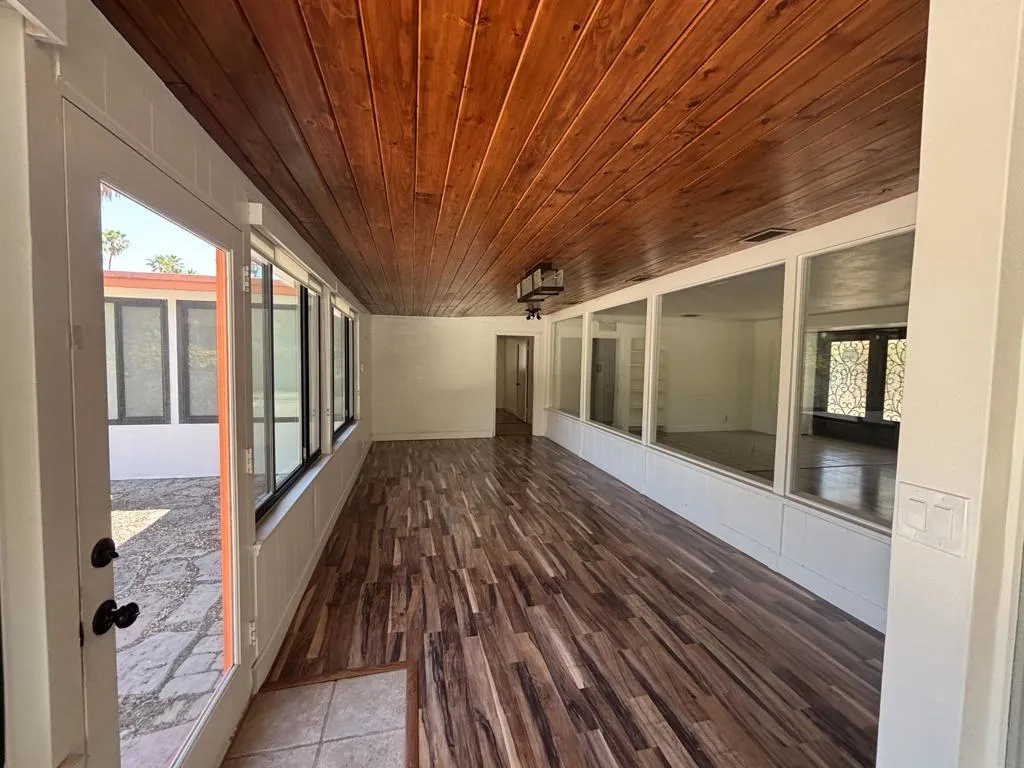 Located in the heart of South Palm Springs, this beautifully restored 1948 Trousdale-inspired residence blends timeless architectural character. True to its roots, the home showcases the signature rustic charm Trousdale homes are known for, including original-style brick accents paired seamlessly with modern luxury finishes.The interior features custom cabinetry throughout, porcelain tile flooring with intricate inlays, and warm custom wood ceilings that add depth and texture. A striking fireplace anchors the living space.Spa-inspired bathrooms have been renovated with oversized walk-in showers, rain heads, and body jets for a true resort-style experience. Additional upgrades include custom iron front doors with glass security panels, new windows and treatments, upgraded hardware throughout, and an insulated steel garage door.Outdoor living is equally impressive, featuring a large, park-like backyard with updated landscaping, newer fencing, and expansive concrete patios and walkways. Enjoy a saltwater pool and spa, perfect for entertaining or relaxing, along with stunning mountain views from both the front and rear of the property.The attached two-car garage adds convenience, while the location offers easy access to hiking trails, biking paths, and dog-friendly areas. Just minutes from downtown Palm Springs, you'll be close to renowned dining, and shopping.