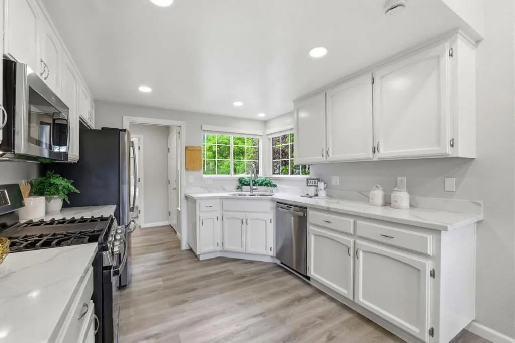 Nestled in the highly sought-after California Ridge community of Almaden Valley, this beautifully updated two-story home offers an exceptional blend of comfort, style, and convenience. Inside, find a light-filled, open floor plan enhanced by brand-new luxury vinyl plank flooring, fresh interior paint, and elegant recessed lighting throughout. The inviting living room features a soaring cathedral ceiling, crown molding, and a cozy fireplace, while sliding glass doors open to a private balcony with picturesque views. The thoughtfully updated kitchen shines with new quartz slab countertops and backsplash, abundant cabinetry, and stainless steel appliances, perfectly positioned to capture serene outdoor vistas. Downstairs, the private primary suite offers a peaceful retreat with its own deck access, generous closet space, and a beautifully appointed en suite bath. Additional highlights include a secondary guest suite, a full laundry room, dual-pane windows, a newer Presidential roof, and multiple Trex decks ideal for entertaining or relaxing. With a two-car garage, HOA-covered exterior maintenance, and close proximity to top-rated schools, parks, trails, dining. Williams, Bret Harte and Leland Schools.