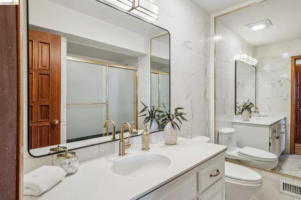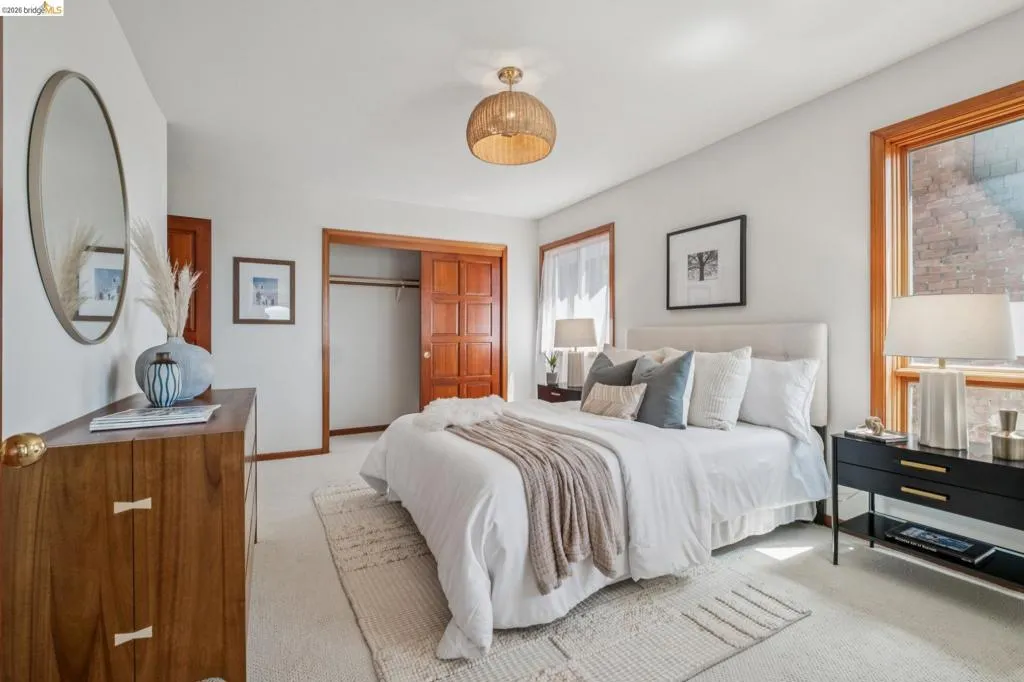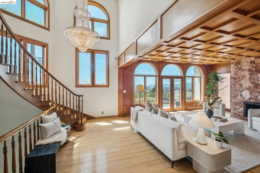 With sweeping views that stretch from downtown Oakland to the San Francisco skyline and beyond, this multi-level Piedmont home enjoys an ideal location just blocks from the center of town. Designed for both comfortable daily living and effortless entertaining, 210 Scenic Ave. offers scale, character, and exceptional function. At its center is a dramatic living room with stately box-beamed ceilings, a striking stone fireplace wall, and a balcony that invites you to step outside and take in the ever-changing vistas. A dedicated curved bar area adds personality and creates a natural place to gather with friends and family. The adjacent dining room is equally memorable, with its graceful curved shape and cathedral ceilings that bring volume and light to the space. Nearby, the eat-in kitchen blends style and practicality with stainless steel appliances, a separate beverage fridge and freezer and a breakfast area. Upstairs, the primary suite is a private retreat, featuring breathtaking views, a cozy fireplace, and thoughtfully integrated built-in shelving. A spacious walk-in closet and en suite bath with a soaking tub complete the space. Three additional bedrooms, a full bath, and a conveniently located laundry area provide flexibility. The lower level includes a guest or au pair suite with its own full bath, offering privacy and comfort for extended stays. Throughout the home, curved staircases add architectural interest, while tile and gleaming wood floors bring warmth and polish. A two-car garage completes this exceptional Piedmont residence.