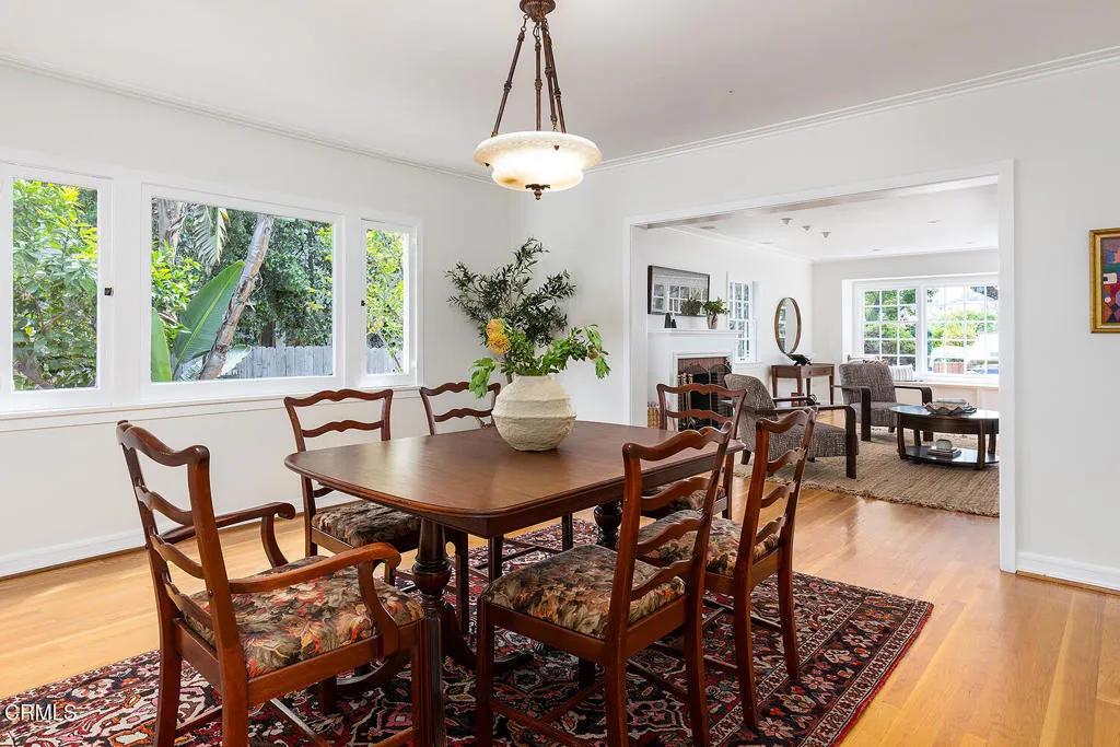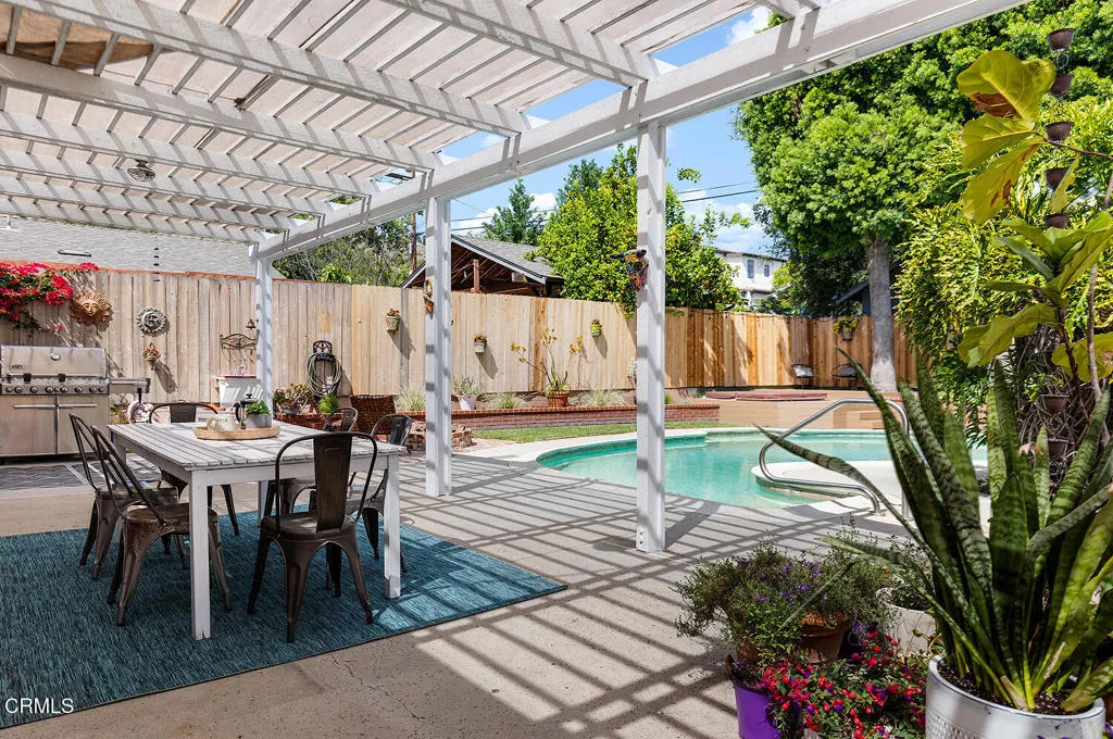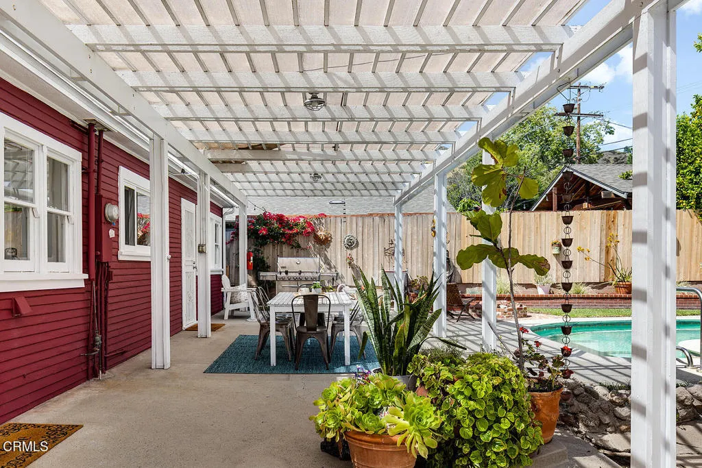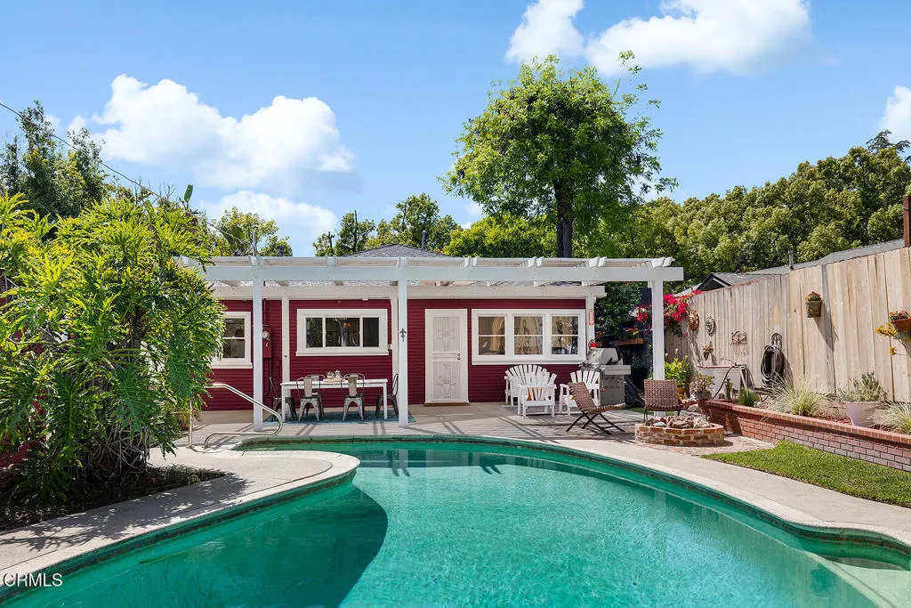 Set on one of Eagle Rock's most picturesque streets - lined with mature camphor trees and just north of Colorado Boulevard - this classic 1920 traditional bungalow offers the kind of setting and soul that's increasingly hard to find.A welcoming front porch sets the tone, leading into a home rich with original character: wood-frame windows, hardwood floors, a spacious living room anchored by a decorative fireplace, and a formal dining room with a built-in buffet. The updated kitchen blends seamlessly with the home's classic style and overlooks the backyard, while a separate laundry room adds everyday convenience.The layout offers flexibility, with two front bedrooms sharing a full hall bath, a third bedroom off the dining room, and a light-filled fourth room - currently used as a home office - lined with windows. A three-quarter bath off the laundry room serves the rear of the home.Out back, the large, flat lot unfolds into a private retreat, complete with a covered patio, pool, separate hot tub, and garden beds. A long driveway leads to a detached two-car garage with additional workshop and storage space.Lovingly cared for by its current owners since 2001, this home has been a true gathering place - host to front yard movie nights, crab boils, and years of connection within the neighborhood. Located within the sought-after Eagle Rock Elementary district and moments from the neighborhood's favorite shops and restaurants, this is a rare opportunity to step into a home that offers both character and the kind of everyday lifestyle that makes Eagle Rock so special.