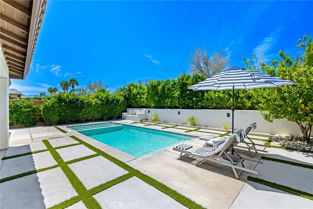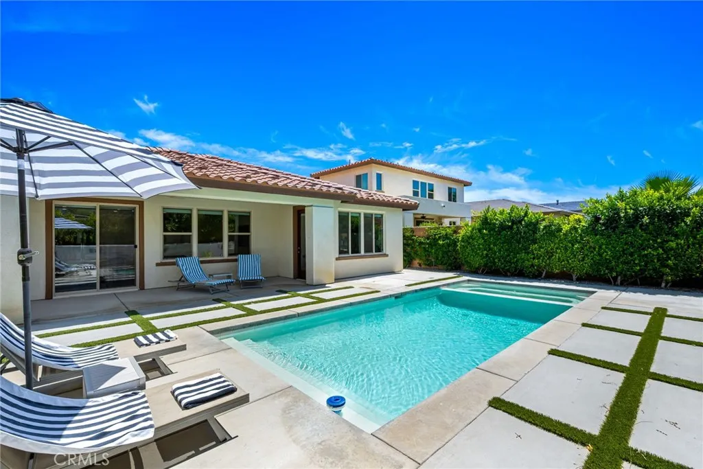 Discover refined desert living in this charming & bright residence located within the exclusive gated community of Genesis in Palm Desert. Built in 2020 this contemporary home offers 2020 sq.ft. of thoughtfully designed space with comfort and privacy in mind. The floor plan includes 3 bedrooms, 3 bathrooms and a versatile den/office with wall to wall glass doors. The master suite offers large dressing area, En-suite large walk in shower and a large walk in closet. Open concept living, dining, kitchen, large center island with breakfast bar all designed to look out to the inviting back yard, while cooking, watching TV, or simply relaxing. Step outside to your own sanctuary, with private pool, spa and covered patio for extended outdoor enjoyment & entertainment with family & friends. Whether you are seeking a primary residence or a refined second home retreat, this property delivers it with style.