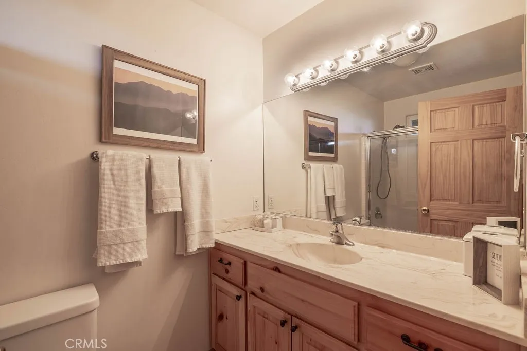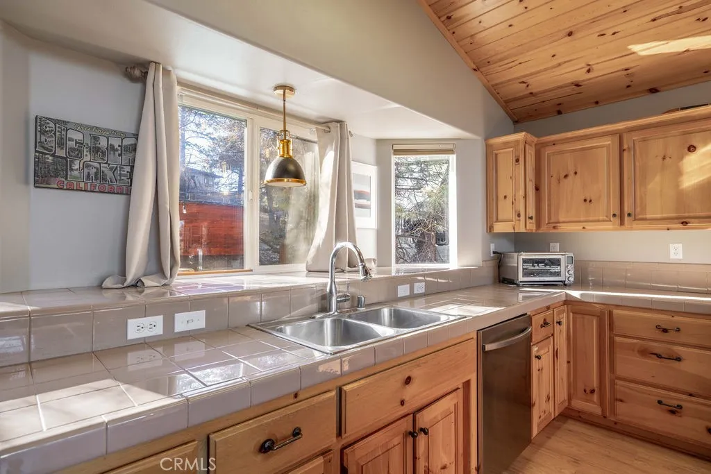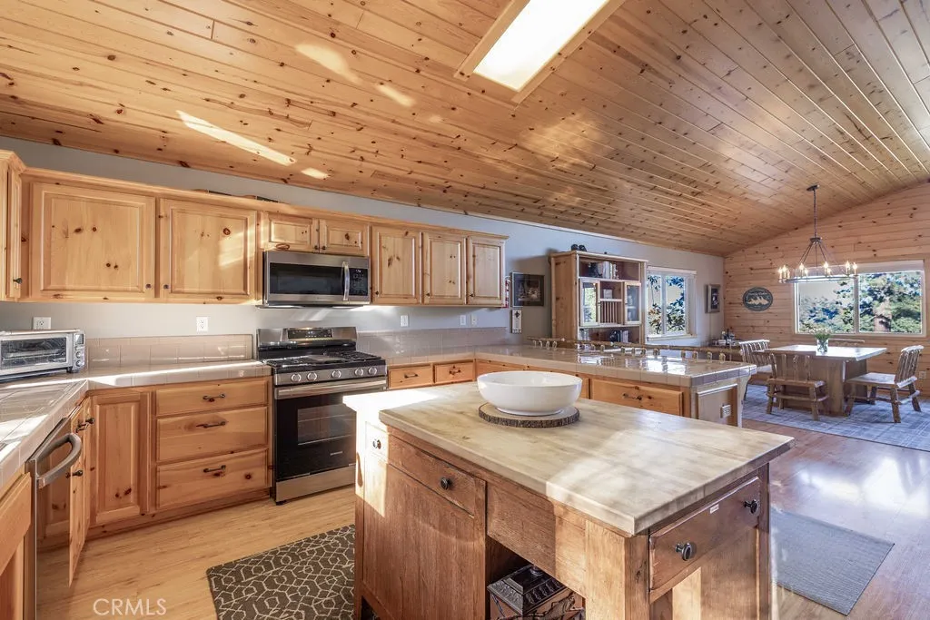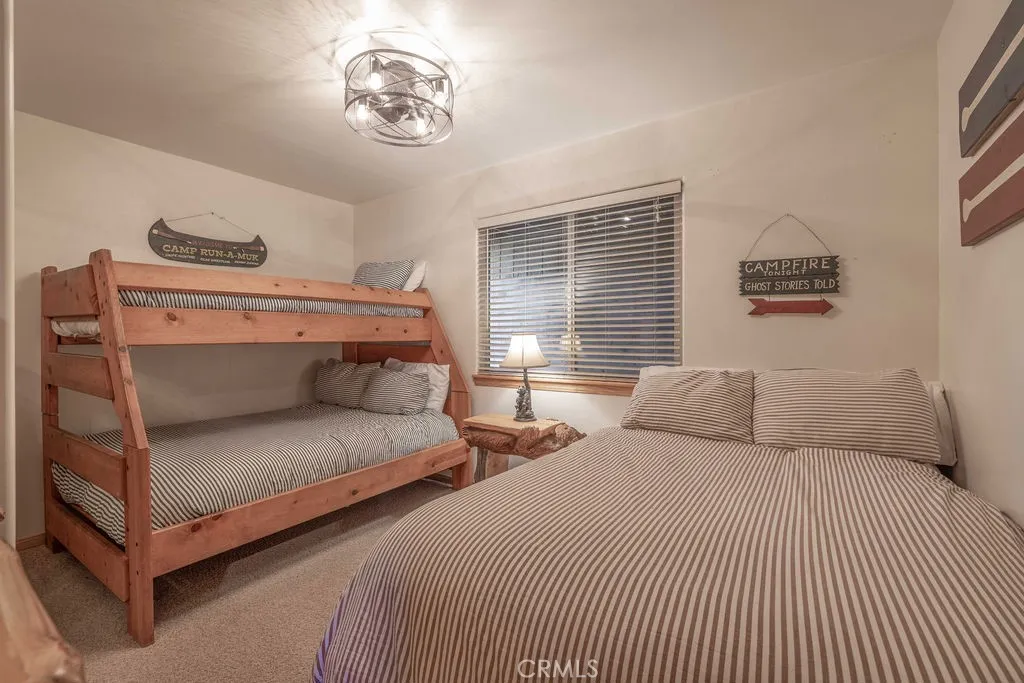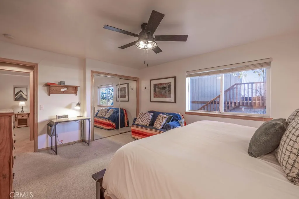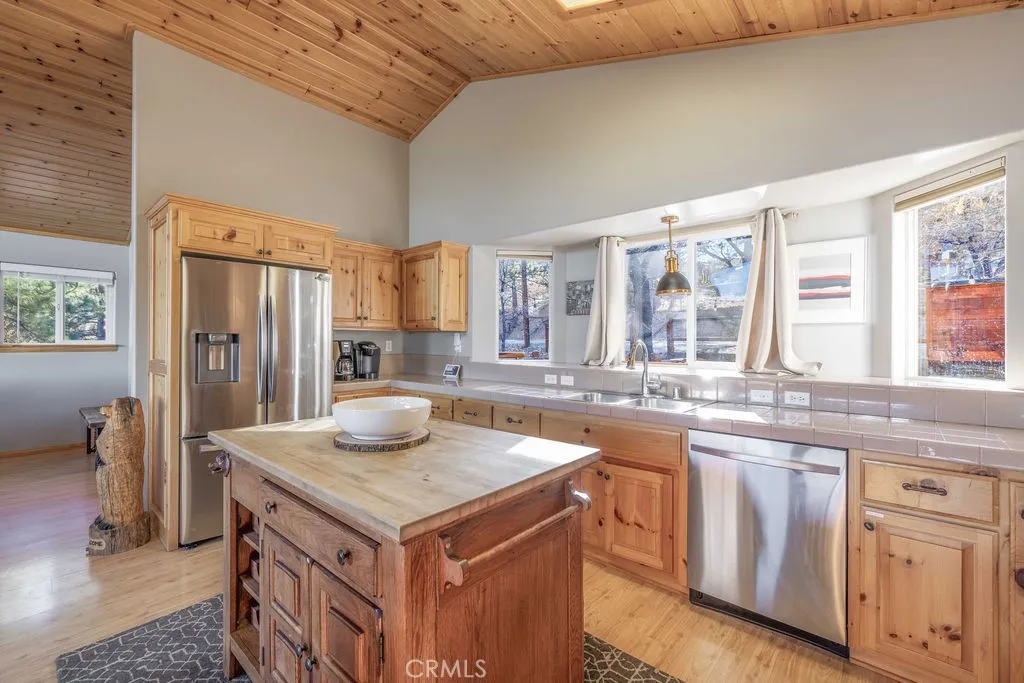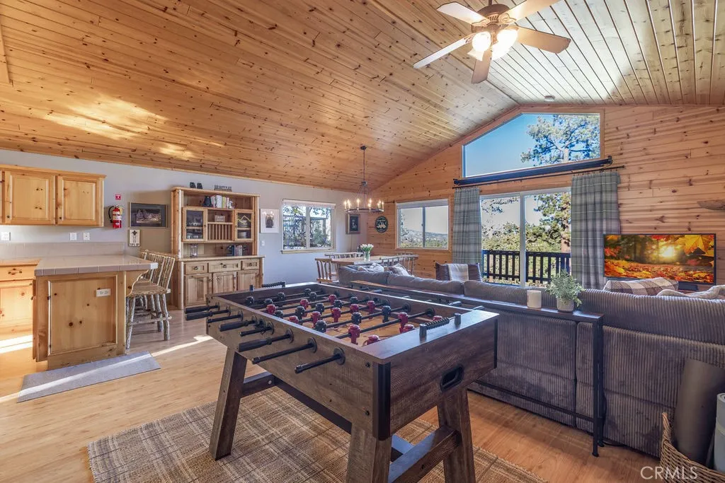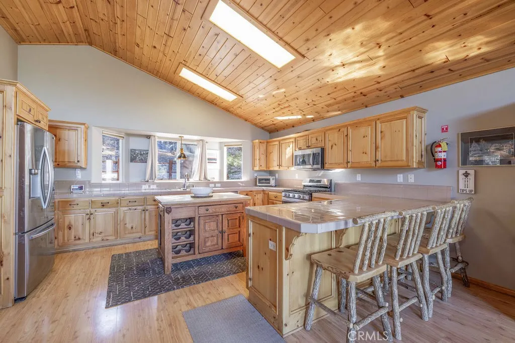 Perched in the desirable Moonridge area of Big Bear, this gem offers a serene mountain retreat with breathtaking views of the surrounding treetops and majestic peaks! Perfect for outdoor enthusiasts and nature lovers, this oasis is just a few minutes drive to both Bear ski resorts, the lake and the vibrant Moonridge Corridor with easy access to local attractions and scenic hiking trails. Once inside, you’ll discover a finely designed open floor plan featuring wood tongue-and-groove vaulted ceilings and floor-to-ceiling glass, bathing the main entry level with gorgeous natural light. The spacious great room is anchored by a rock fireplace, which invites everyone for cozy evenings by the fire. The kitchen will dazzle any level chef with new stainless appliances, ample cabinetry, generous counter space, a center island, windows and lighting that immerse the space in warm light. Downstairs you’ll find 3 bedrooms, including a serene primary with en suite bathroom. Each room invites you to the space for rest and relaxation, and offers its own fan for added comfort. Outside, a large front patio is adorned with string lights and a hot tub that begs for leisurely evenings under the stars, while the expansive back balcony offers multiple lounge areas to take in the stunning mountain views. This move-in ready retreat is not one to miss and priced to move for buyers or investors alike. Schedule your showing today to make memories immediately!