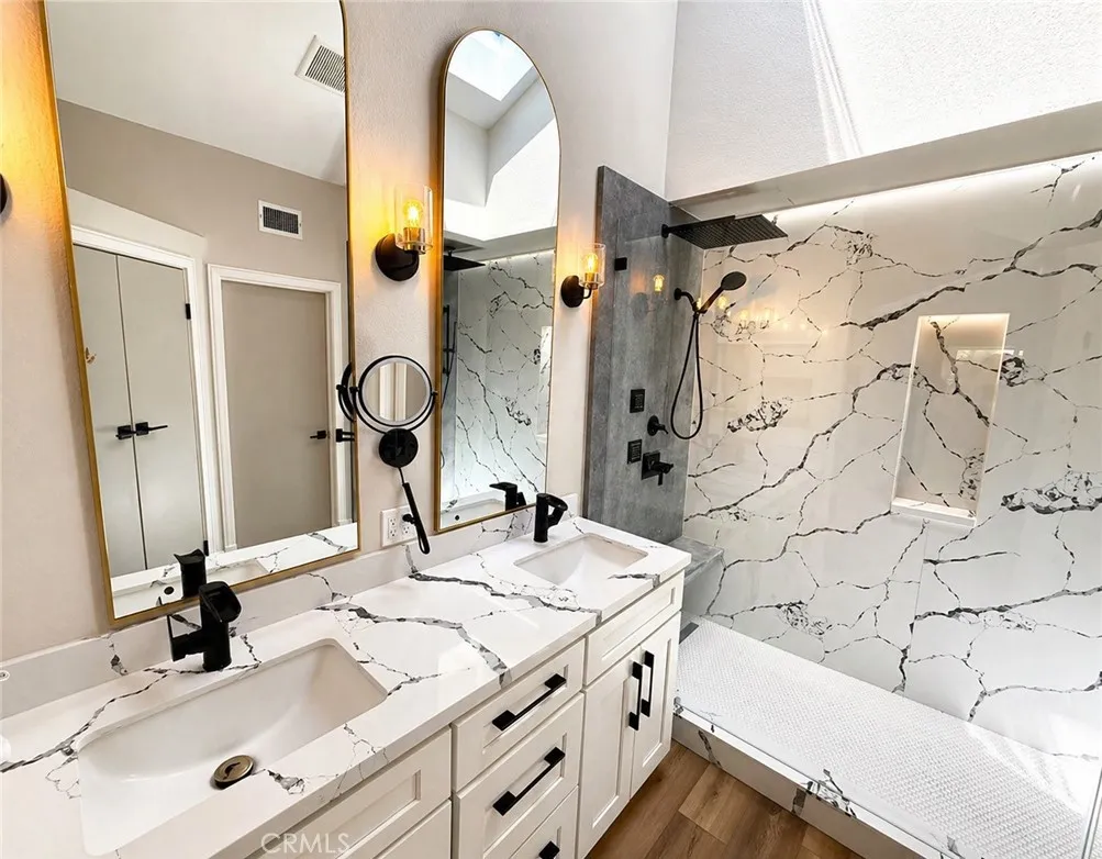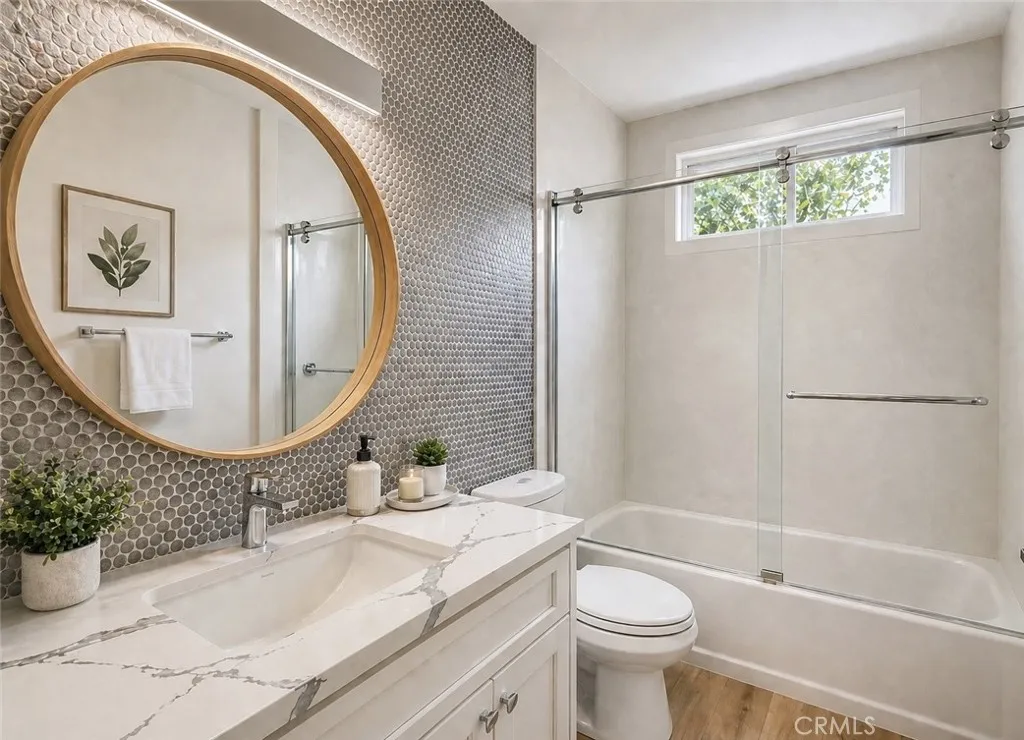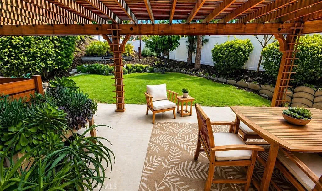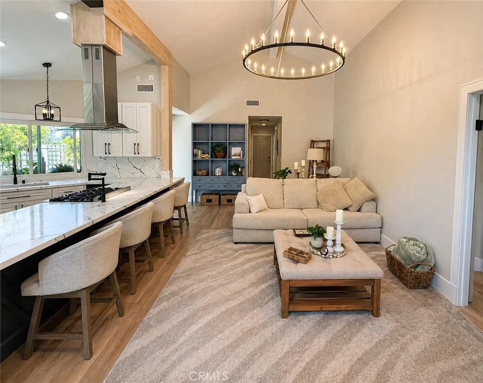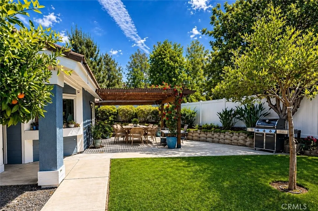 Beautifully renovated 3 bed, 2 bath Temecula home offering an exceptional sense of privacy, refined finishes, and a seamless indoor-outdoor living experience. Positioned on a corner lot with a private gated entrance and zero lot line placement, the home lives with a rare sense of seclusion. The outdoor spaces have been intentionally designed as a retreat, featuring custom pergolas, smart landscape lighting, and mature fruit trees including orange, grapefruit, apple, and Eureka lemon, creating a quiet, private setting that feels both inviting and serene. Inside, vaulted ceilings and luxury vinyl plank flooring carry throughout, creating an open, airy feel. The kitchen is a true centerpiece, anchored by a dramatic 12 foot quartz waterfall island, white shaker cabinetry with bar pulls, and a custom hood over the range. Andersen windows throughout bring in soft natural light, enhancing the home’s calm, cohesive aesthetic. The living area is centered around a modern updated fireplace with a quartz surround, serving as a striking focal point and adding warmth and character to the space. Both bathrooms have been thoughtfully updated with quality finishes. The secondary bath features refined tile detail, while the primary bath offers a spacious, spa like experience with an oversized two person walk-in shower, complete with rainfall fixtures and floor-to-ceiling quartz for a clean, elevated look. The second bedroom also features access to a private atrium, offering a quiet, tucked away outdoor space. Additional upgrades include owned solar, whole home water filtration, and integrated smart home features including Kasa switches, a smart thermostat, Ring doorbell, three cameras, and a Rachio sprinkler controller. Outdoor lighting is also connected to the smart system, adding both ambiance and convenience. Ideally located in central Temecula, this home is just minutes from award winning schools, shopping, dining, and Temecula’s renowned wine country, offering both everyday convenience and lifestyle appeal in one of the area’s most established and desirable neighborhoods.