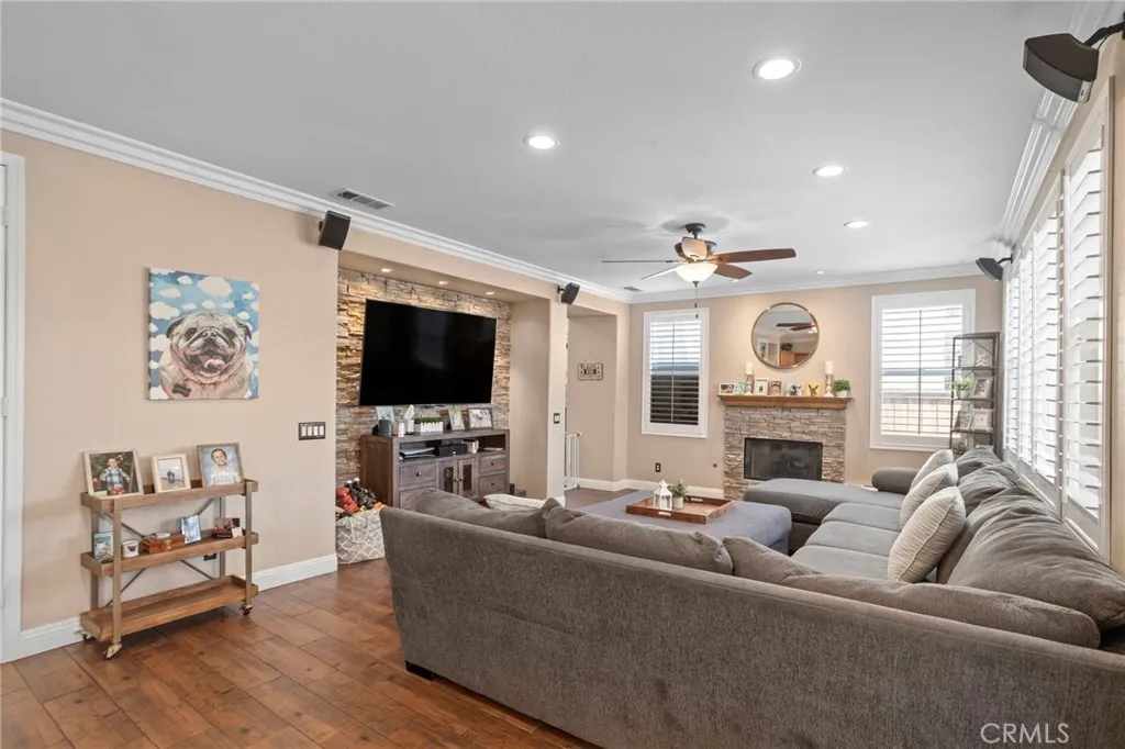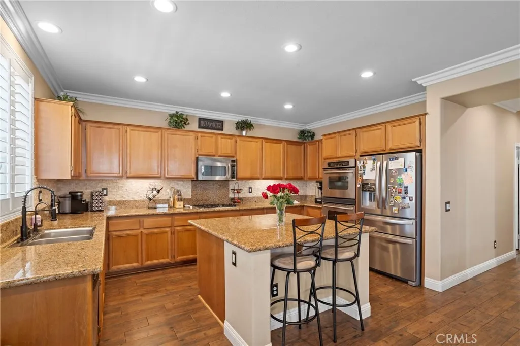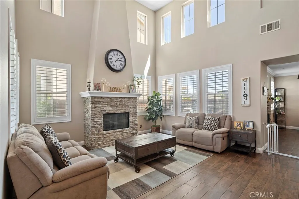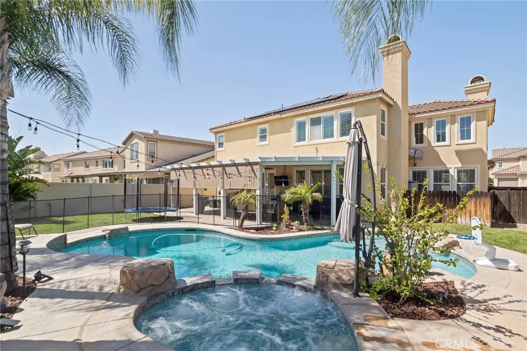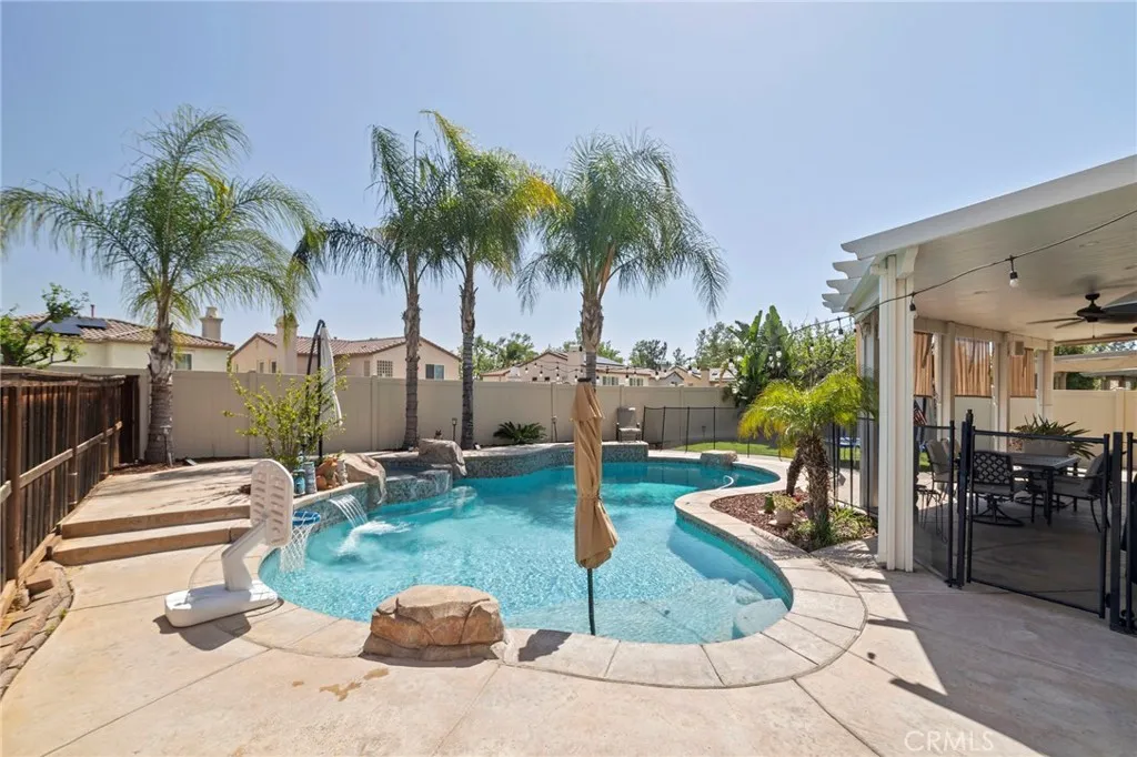 Tournament Hills Home — Beaumont’s Premier Gated Community Located in one of Beaumont’s most desirable neighborhoods, this spacious residence in Tournament Hills offers exceptional comfort, style, and privacy. The property features an inviting in-ground saltwater pool and spa, perfect for year-round relaxation. Recent updates and renovations include designer interior paint, new baseboards, upgraded master bath, and elegant porcelain and wood flooring throughout. The formal dining and living rooms welcome you with abundant natural light, while the custom fireplace and built-in media center create a seamless flow to the open-concept kitchen and family room. The kitchen showcases ample cabinetry, upgraded granite countertops, a center island with bar seating, stainless steel appliances, built-in microwave, and double oven—ideal for both everyday living and entertaining. All bedrooms feature wood flooring, ceiling fans, and granite counters in the bathrooms. The primary suite is enhanced by generous natural light, a spacious closet, and a luxurious en-suite bath with a walk-in shower. Additional highlights include a downstairs guest bedroom, a large upstairs loft perfect for a media or game room, and an attached three-car garage with epoxy flooring. Enjoy the beautifully landscaped front and back yards, complete with a large Aluma wood patio cover equipped with ceiling fans and lighting. Set on a quiet cul-de-sac, this home is just steps from the community lake, offering a peaceful and private retreat in a prestigious setting.
