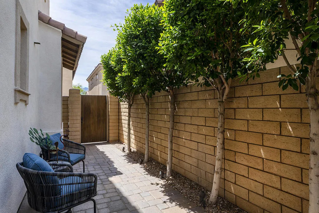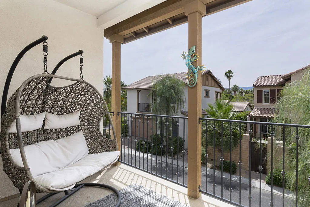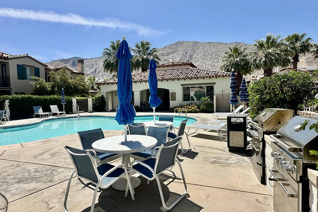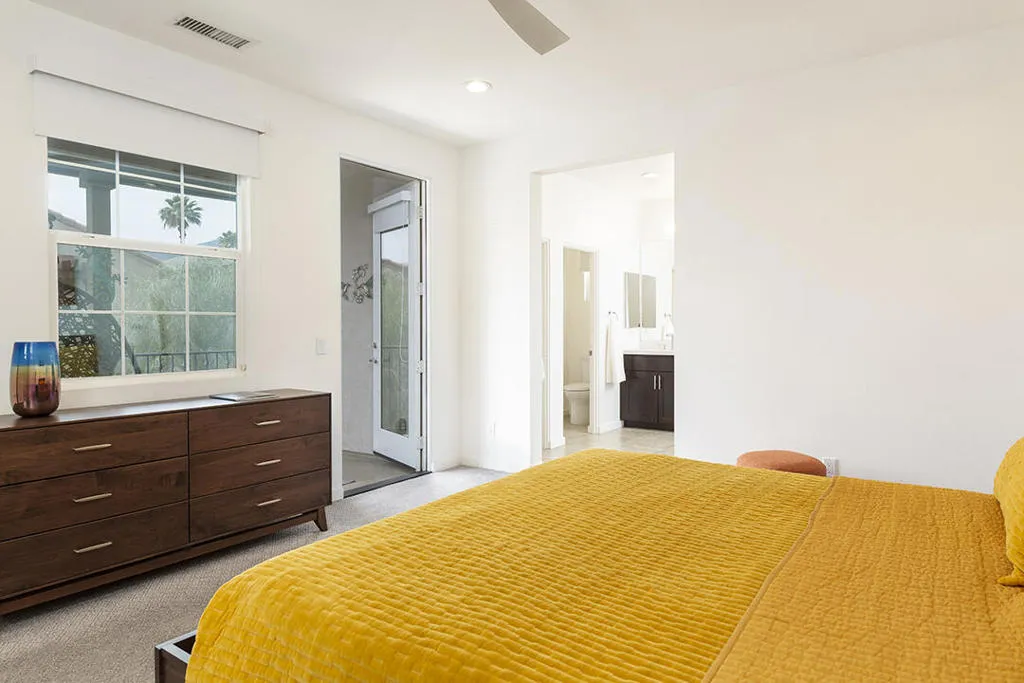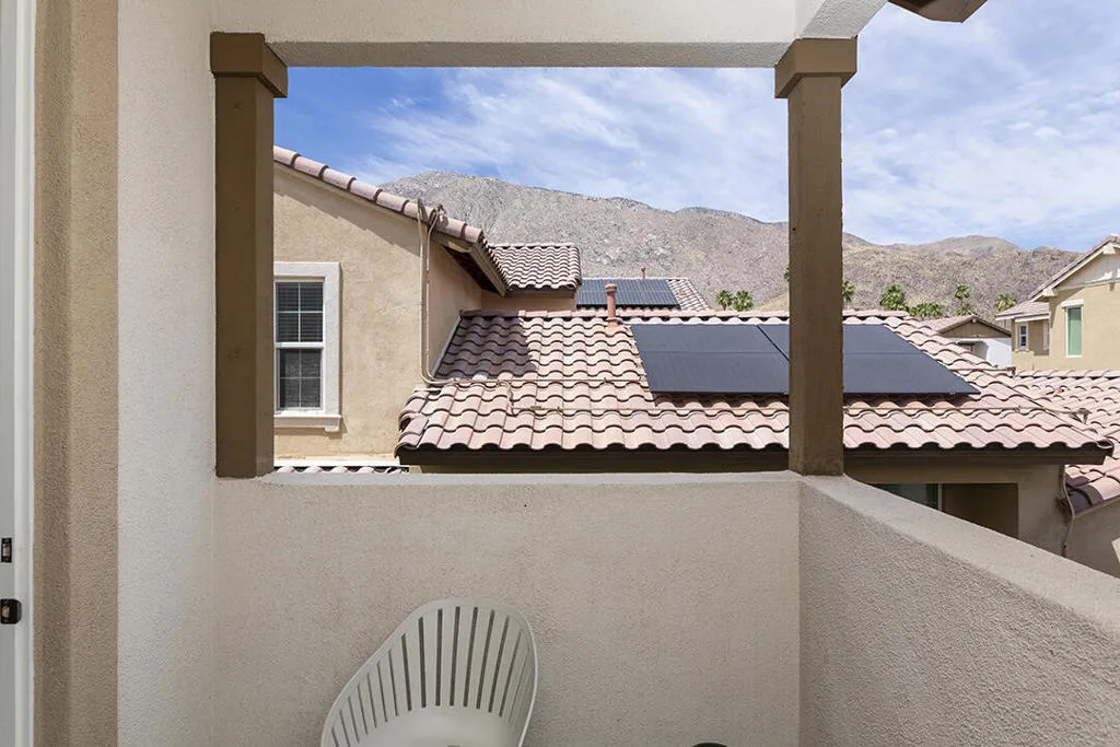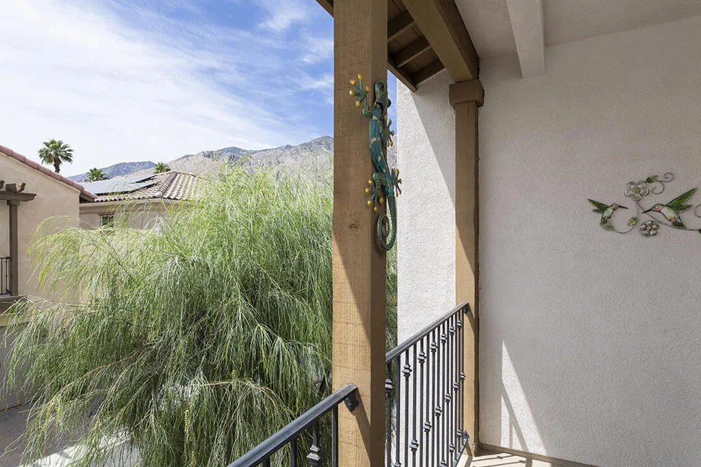 A detached 3-bedroom, 3-bath home just blocks from downtown Palm Springs for under $1 million is a rare find, and this free-standing condo in Village Traditions delivers. Blending contemporary design with traditional styling, the home features a soaring vaulted living space, dual primary suites on separate levels, and quality finishes throughout.A gated front entry leads to a private courtyard with a trellis-covered sitting area, accessible from the living room and main-floor primary suite. Inside, the open floor plan connects the living area, dining space, and chef's kitchen with prep island, while a dramatic staircase lines one wall, all beneath a two-story ceiling with upper windows that bring in natural light and mountain views.The kitchen offers dark wood cabinetry, stainless steel appliances, wine refrigerator, and granite countertops, with a nearby laundry room for convenience. The main-level primary suite opens to the entry courtyard and includes a spacious en-suite bath with soaking tub, glass-enclosed shower, dual vanities, separate water closet, and a large walk-in closet. A second bedroom and adjacent 3/4 bath on the main floor provide flexible space for guests or a home office.Upstairs, a loft overlooks the main living area, creating an ideal office or lounge. The second primary suite features two walk-in closets, dual patios with south and west mountain views, and a well-appointed en-suite bath.Village Traditions offers a clubhouse, fitness center, resort-style pool and spa, and beautifully maintained grounds with mature landscaping and a neighborhood park. Its close proximity to downtown Palm Springs makes it perfect as a full-time residence or seasonal retreat.Additional Items and Amenities Carpet replaced, bathroom fixtures and toilets upgraded, installed ceiling fans | 2021-2022 Front entry walkway and patio expanded | 2021-2022 All canister lighting was replaced with energy-efficient LED, dining room and bathroom lighting fixtures upgraded. Dimmer switches added | 2021-2022 Electric and remote shades added to upper windows, manual roller shades added upstairs in office and bathroom. | 2021-2022 Garage updates 2023 | Insulated garage door installed, epoxy floor finish, added lighting and HVAC In-line air purifier added to the main HVAC | 2023 | Air compressor upgrades in 2025 Entry courtyard pergola installed by Valley Patio | 2023, Wind cooler in 2023, W/D upgraded 2024, Dishwasher replaced 2025