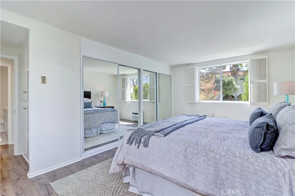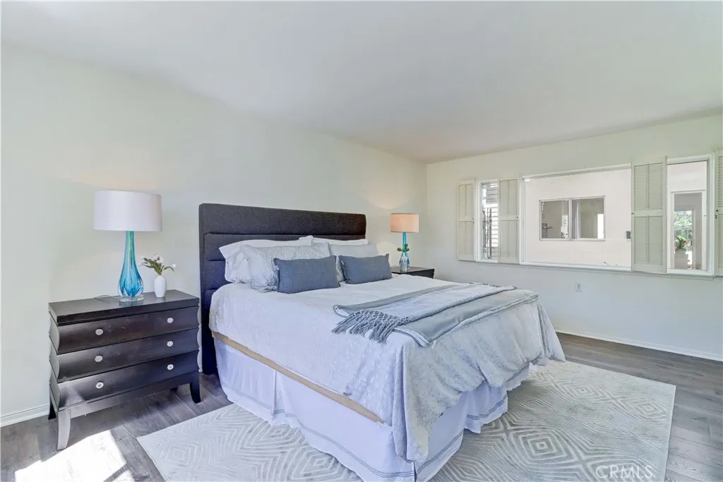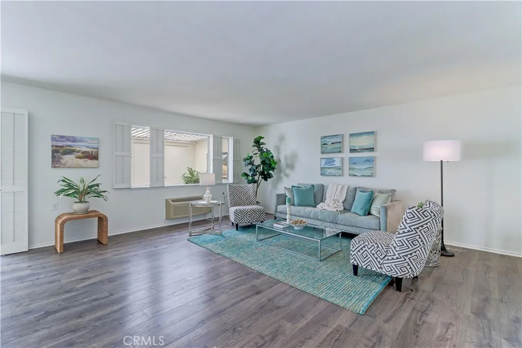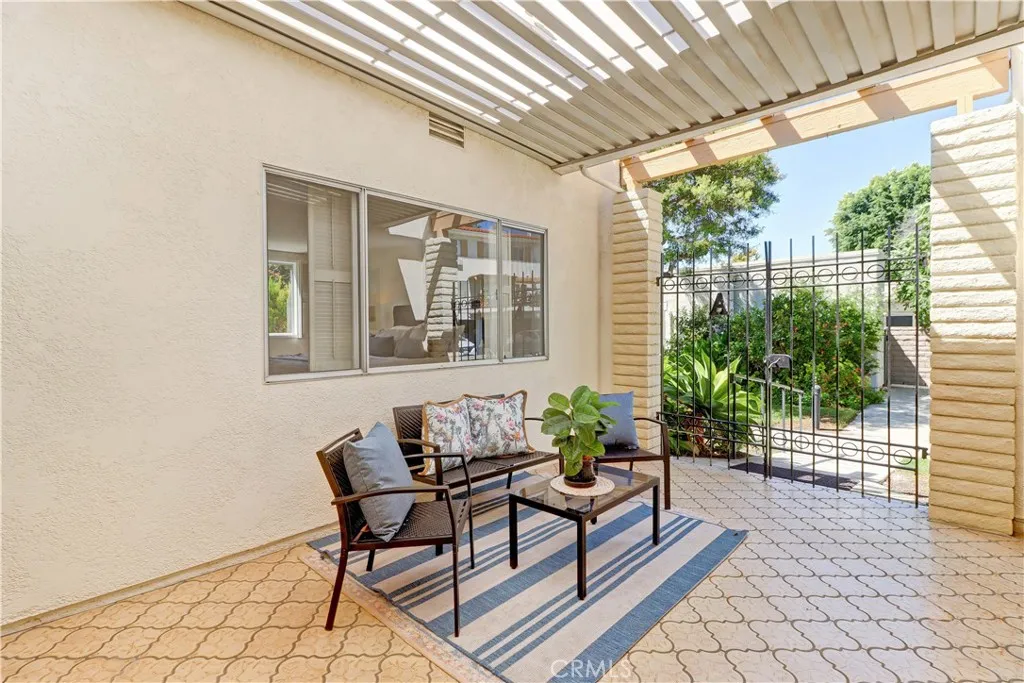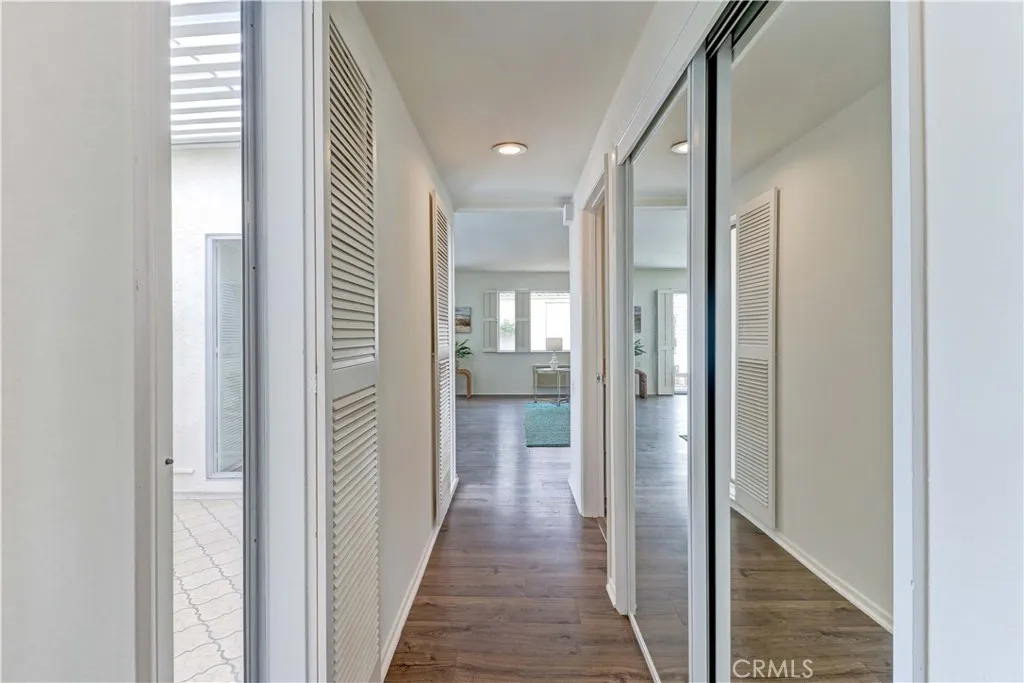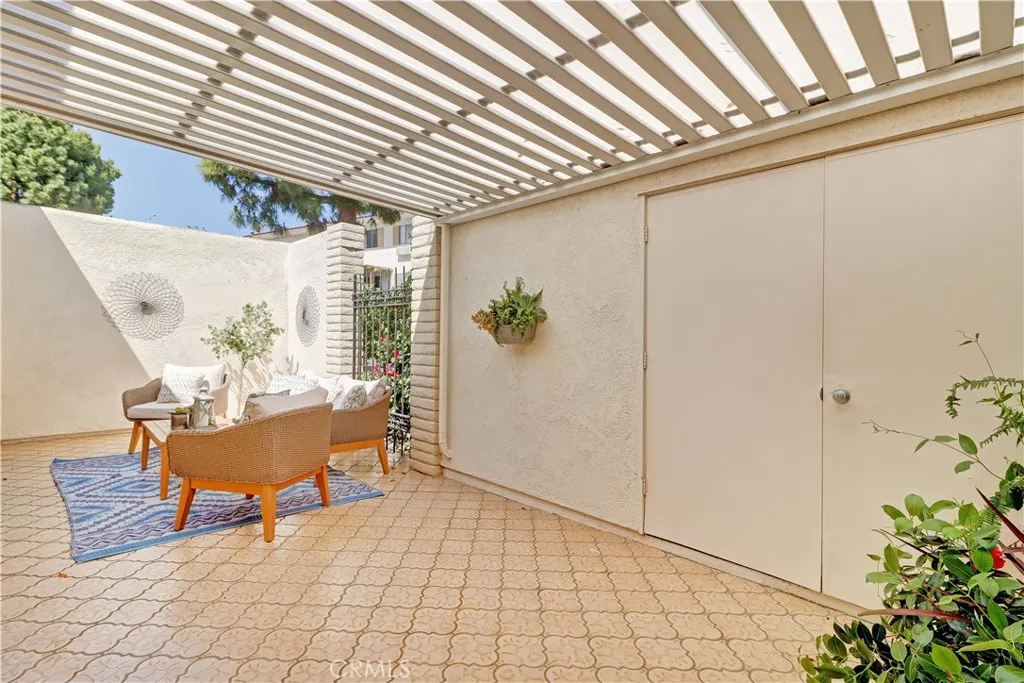 2BD/2BA updated, end unit "Cordoba" CONDO conveniently located in a quiet area on the western side of Gate 5/6 with easy access to the gates and Clubhouse 4 - the arts and crafts center of Laguna Woods with its own pool/spa. This is one of the largest single level cottage-type floorplans with room to expand into 2 patio areas. Enter through the partially covered front patio with rod iron gate. Interior features smooth ceilings, laminate flooring, fresh paint and shutters on most windows. Spacious living room and adjacent dining area lead out to the large, partially covered back patio with nice sized storage closets - plenty of room for outdoor living, gardening bench and BBQ. Living/dining and kitchen windows all face onto private patios so no neighbors walking by. Back inside, the kitchen has brand new quartz counters and window that looks out to the front patio area. 2 remodeled bathrooms with newer vanities and fixtures. Guest bathroom has tub/shower combo with tiled surround and curved glass enclosure. Primary bath houses tiled walk-in shower. 2 good sized bedrooms with lots of closet space behind the mirrored closet doors and west-facing windows for afternoon sun. The primary bedroom also has a window facing into the front patio. Comfortable home with space to spread out plus 2 patios! Carport and guest parking right in front. Residents enjoy access to an unparalleled array of amenities, including championship and executive golf courses, multiple swimming pools, fitness centers, pickleball and tennis courts, lawn bowling, equestrian facilities, gardening centers, art studios, computer labs, classes, and over 200 clubs and social organizations. See Virtual walk-through tour!