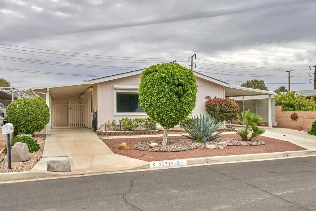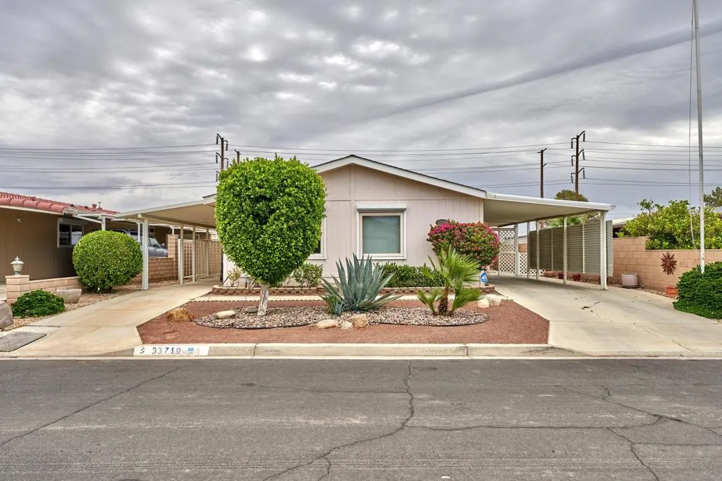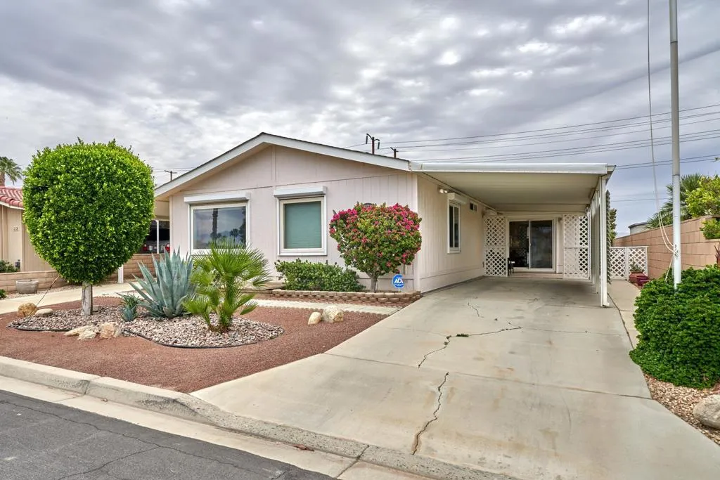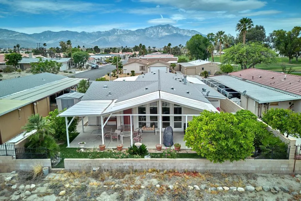 Contemporary, updated golf course home in Tri Palm Estates & Country Club! Perfectly positioned on the 6th fairway of the 18-hole course, this spacious newer triple-wide home offers stunning panoramic mountain and fairway views from its prime location on quiet Bell Rd in one of the community's newest sections. Inside, you'll find a bright, open ''great room'' layout with vaulted ceilings and expansive picture windows that capture the scenery. The inviting living area features a cozy gas fireplace with a stone hearth, while the updated kitchen showcases quartz countertops, newer cabinetry, and stainless steel appliances--ideal for both everyday living and entertaining. This home offers 3 bedrooms, 2 beautifully remodeled bathrooms with step-in showers, plus a versatile bonus room perfect for an office, hobby space, or guest overflow. Updated flooring throughout includes luxury vinyl plank and carpet. Additional features include central vacuum and electric security shutters on all windows. Enjoy outdoor living on the wrap-around covered deck, perfect for relaxing or hosting guests. Covered parking includes two carports, one with secure gated space for your golf cart. And the best part? THIS HOME MAY QUALIFY FOR THE INSTALLATION OF THE PERMANENT FOUNDATION AND FORM 433A REQUIRED BY MOST LENDERS FOR EASE OF FINANCING!Located in Tri Palm Estates & Country Club, a vibrant 55+ community where you own the land. Ownership includes unlimited golf for two on both the 18-hole and 9-hole courses, plus access to pools, spas, tennis, pickleball, shuffleboard, clubhouse, restaurant, and more. Conveniently located near shopping, dining, entertainment, and medical facilities, with easy access to I-10 and just minutes from Rancho Mirage, Palm Desert, and Palm Springs. Don't miss this opportunity--schedule your private showing today and start enjoying the desert lifestyle at its finest!