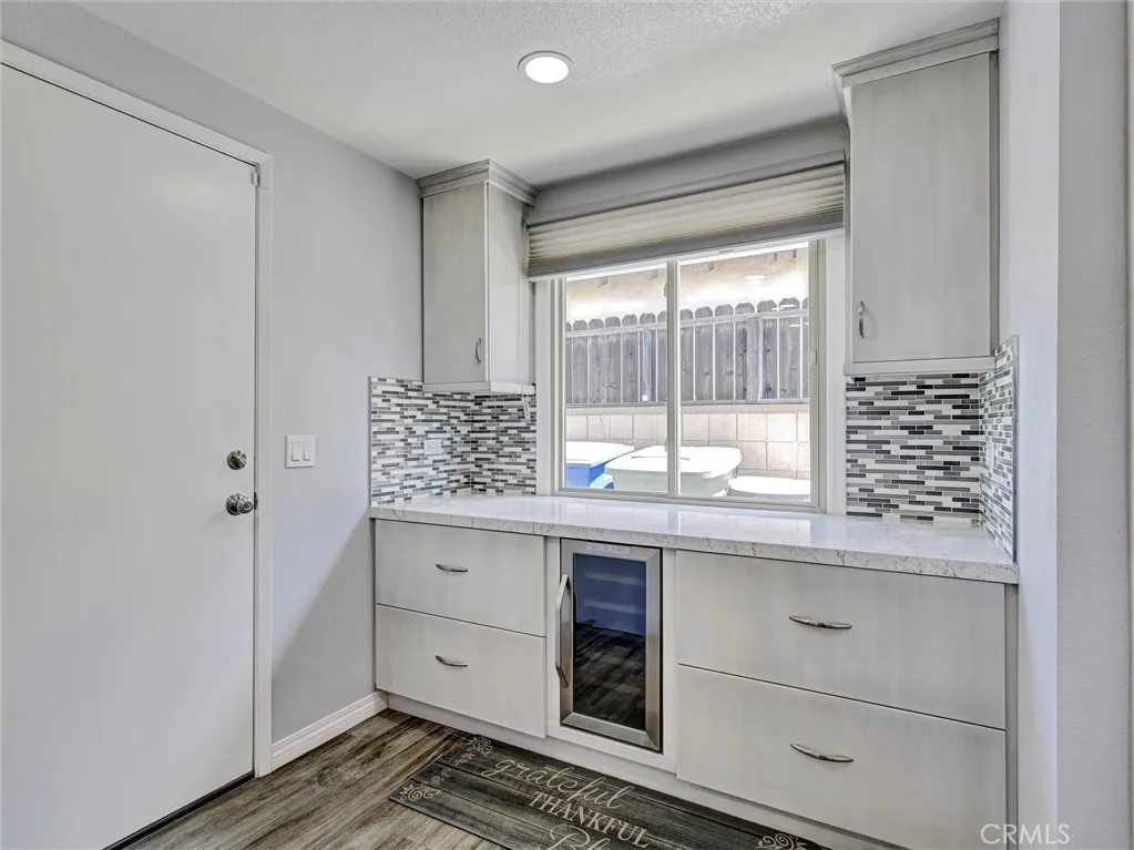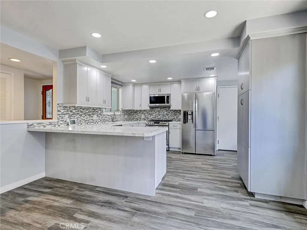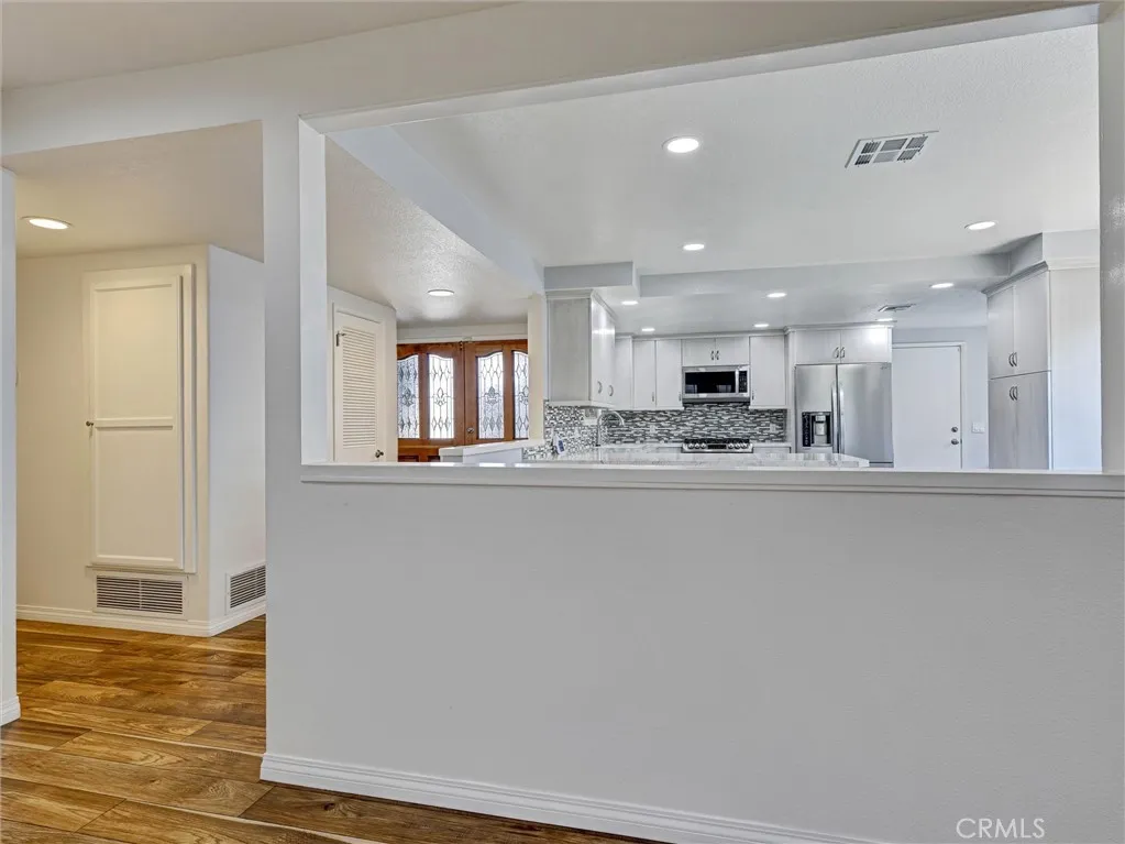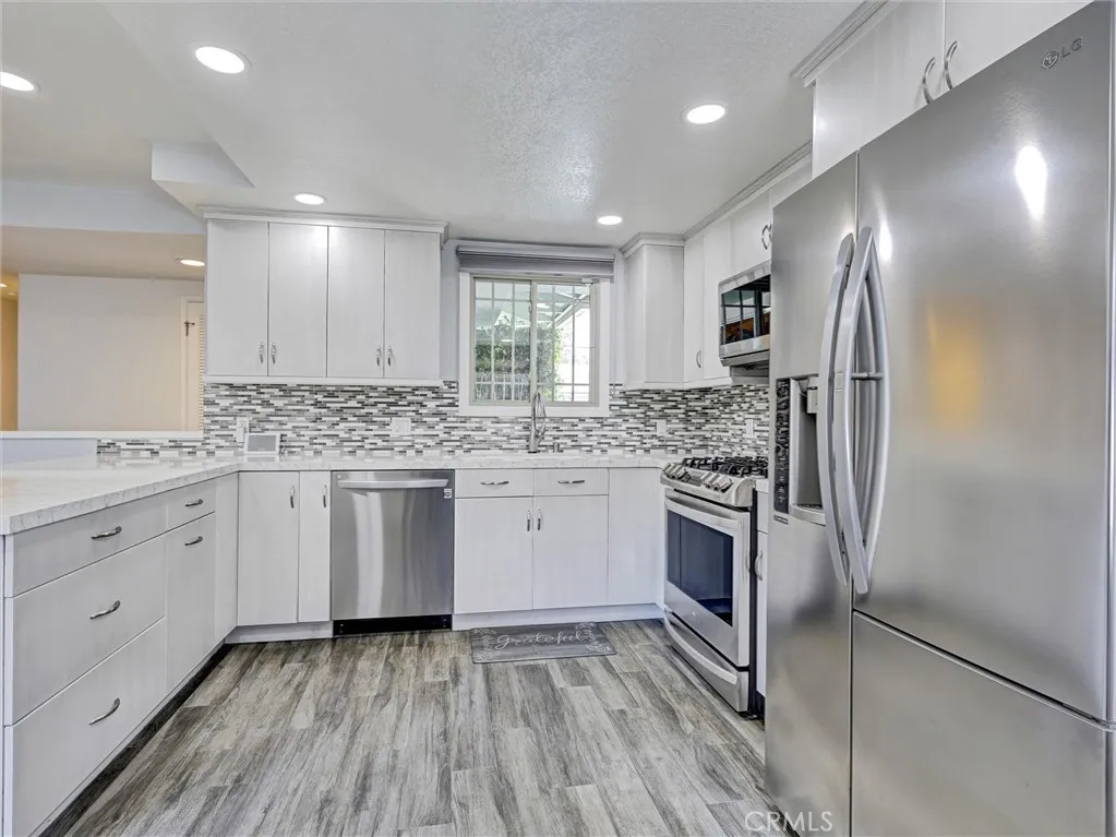 Welcome to this beautifully remodeled single-story home in the heart of La Habra! Offering 3 bedrooms and 2 bathrooms, this residence has been thoughtfully updated throughout and is truly move-in ready. Enjoy durable and stylish hickory laminate flooring that runs seamlessly through the main living & bedroom areas, gray ceramic tile in the kitchen/dining area, with tile flooring in both bathrooms for added convenience. The kitchen was fully remodeled in 2023 and features updated cabinetry, sleek quartz countertops, a tasteful tile backsplash, soft close doors and drawers, pull out shelves in the pantry and two convenient lazy susans for added functionality. All LG stainless steel kitchen appliances are included, along with a small wine refrigerator, making this space both practical and perfect for entertaining. Additional improvements over the years include updated dual-pane windows with hidden screens, stucco, and roof, providing peace of mind for the next owner. The HVAC system is also under 10 years old. Inside, you'll find charming louvered doors throughout, two linen cabinets with soft close doors in the hallway offering extra storage, and a jetted tub in the hall bathroom. A water softener and wireless home alarm system are also included. The garage adds even more value, with a washer and dryer included, as well as an additional second (white) refrigerator, laundry sink, plus a garage door opener and shelving. An attached patio room provides extra space and potential, just waiting for your personal touch and a little TLC. The backyard features a white vinyl gate divider—ideal for creating separate spaces or accommodating future pets. Don’t miss this great opportunity to own an updated home in a desirable La Habra location!