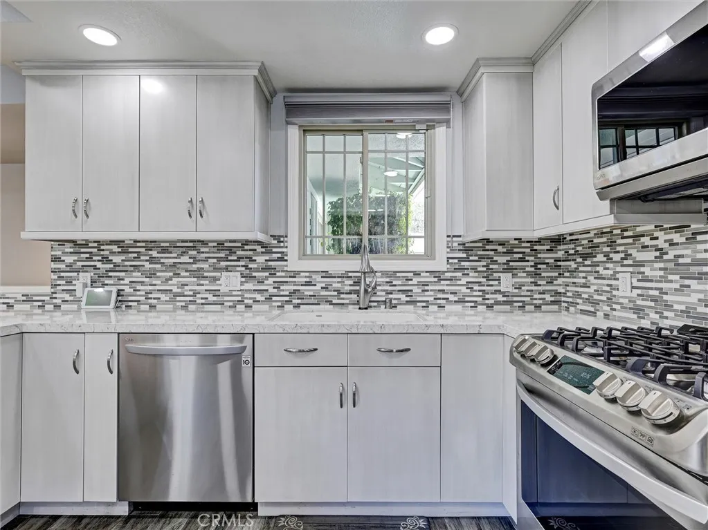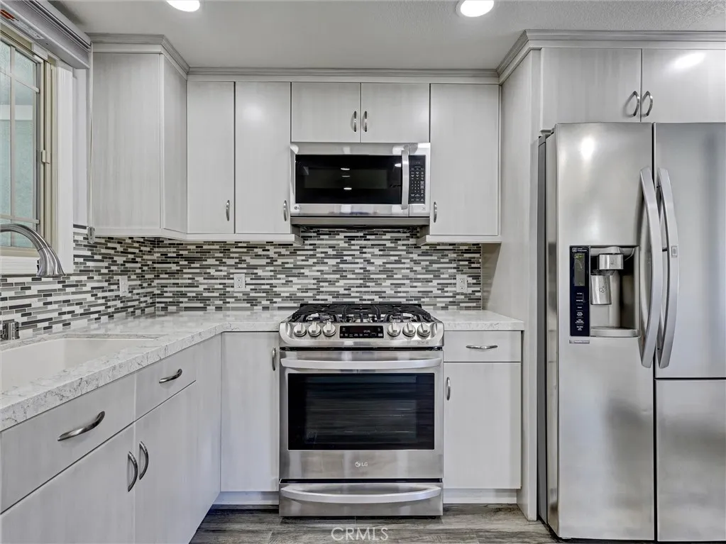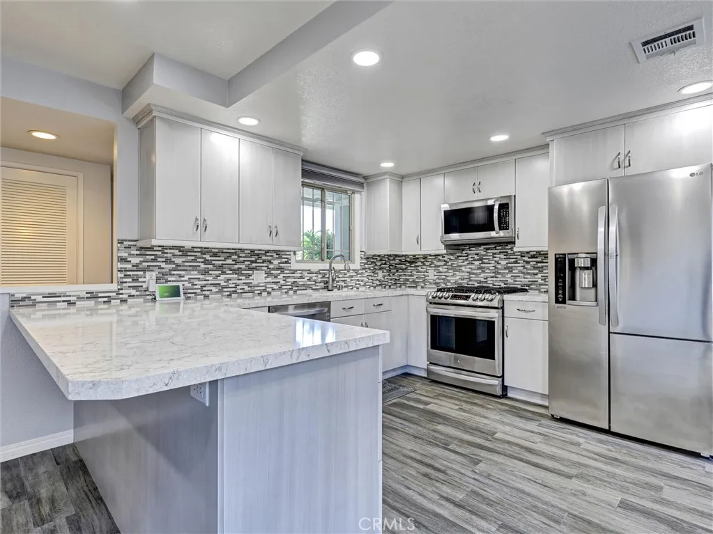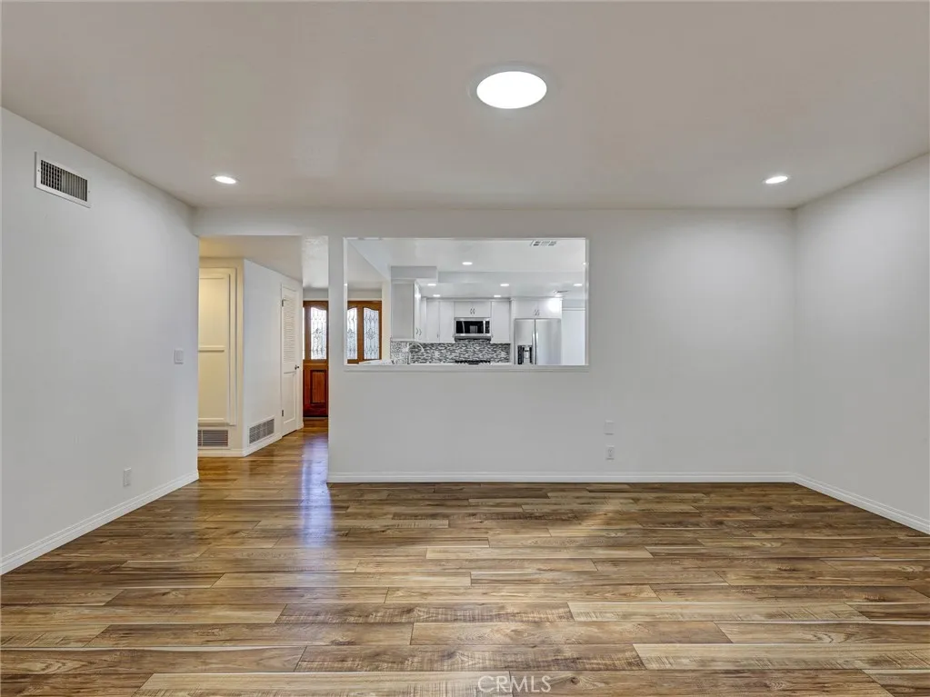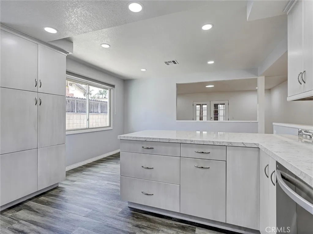 Welcome to this beautifully remodeled single-story home in the heart of La Habra! Offering 3 bedrooms and 2 bathrooms, this residence has been thoughtfully updated throughout and is truly move-in ready. Enjoy durable and stylish hickory laminate flooring that runs seamlessly through the main living & bedroom areas, gray ceramic tile in the kitchen/dining area, with tile flooring in both bathrooms for added convenience. The kitchen was fully remodeled in 2023 and features updated cabinetry, sleek quartz countertops, a tasteful tile backsplash, soft close doors and drawers, pull out shelves in the pantry and two convenient lazy susans for added functionality. All LG stainless steel kitchen appliances are included, along with a small wine refrigerator, making this space both practical and perfect for entertaining. Additional improvements over the years include updated dual-pane windows with hidden screens, stucco, and roof, providing peace of mind for the next owner. The HVAC system is also under 10 years old. Inside, you'll find charming louvered doors throughout, two linen cabinets with soft close doors in the hallway offering extra storage, and a jetted tub in the hall bathroom. A water softener and wireless home alarm system are also included. The garage adds even more value, with a washer and dryer included, as well as an additional second (white) refrigerator, laundry sink, plus a garage door opener and shelving. An attached patio room provides extra space and potential, just waiting for your personal touch and a little TLC. The backyard features a white vinyl gate divider—ideal for creating separate spaces or accommodating future pets. Don’t miss this great opportunity to own an updated home in a desirable La Habra location!