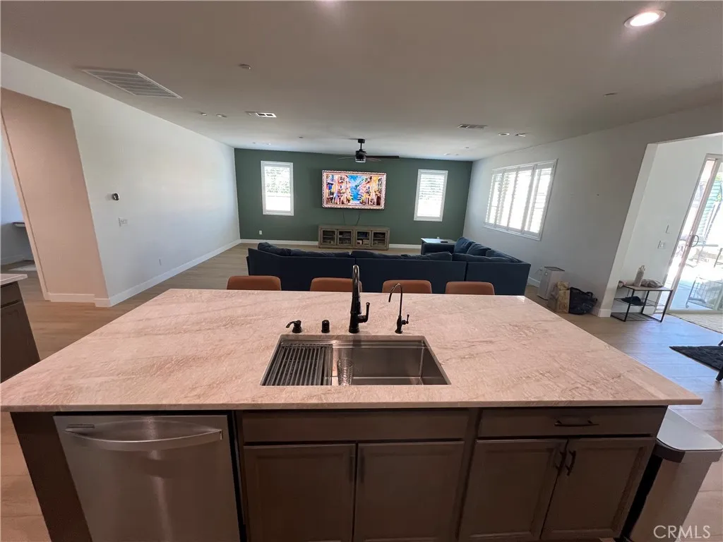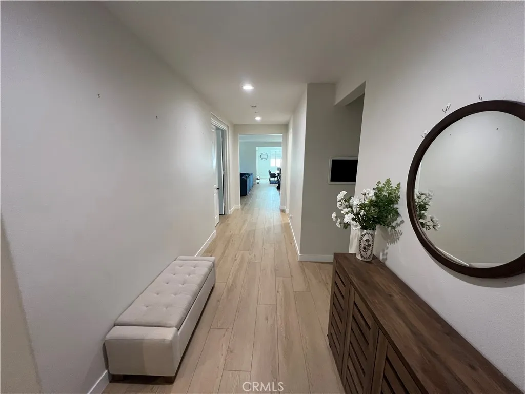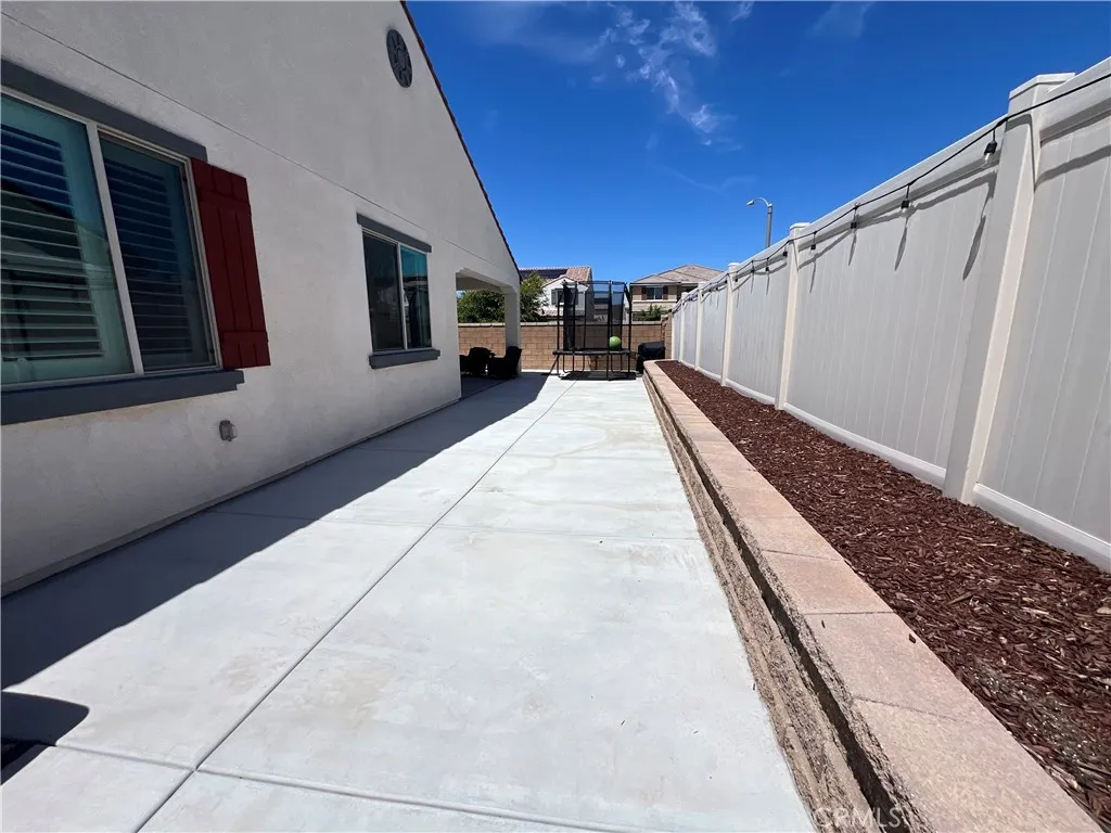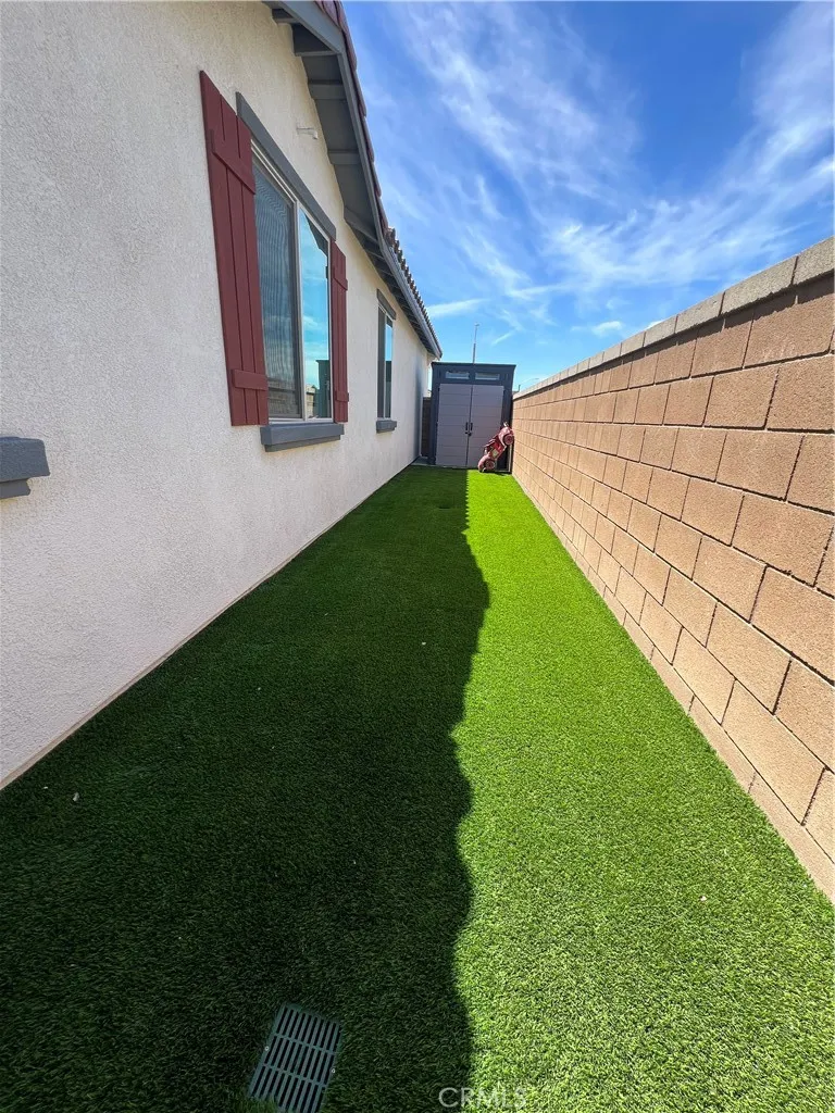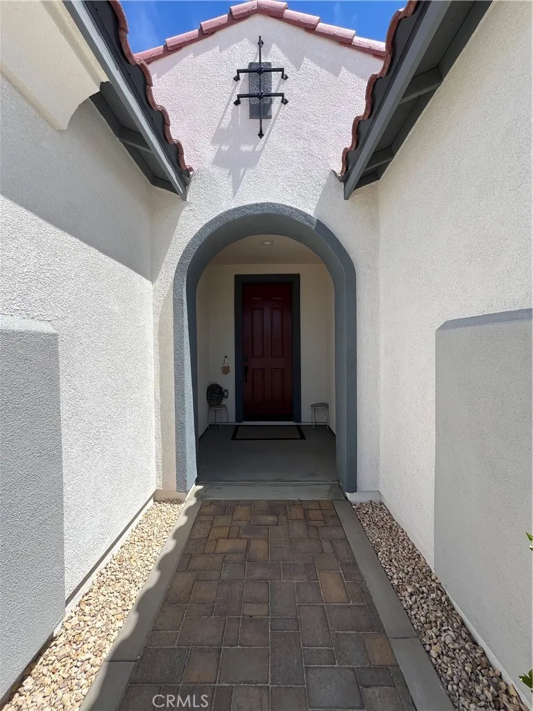 Beautiful single-story home for lease in a newer Menifee neighborhood, ideally located near Menifee Lakes Golf Course. Situated on a desirable corner lot within a quiet cul-de-sac, this property offers excellent curb appeal with low-maintenance landscaping, including artificial turf, decorative concrete, and drip-irrigated planters. A charming paver walkway leads to the inviting front entrance. Inside, the home features 9-foot ceilings, creating a spacious and open feel. Upon entry, two guest bedrooms and a full bathroom are conveniently located to the left. Further down the hallway, an additional en-suite bedroom offers its own private bathroom—perfect for guests or multigenerational living. A dedicated office with double doors provides a functional workspace, along with a nearby powder room for added convenience. The rear of the home opens to a bright and expansive great room with an open-concept layout, ideal for everyday living and entertaining. The oversized kitchen is equipped with a large center island, stainless steel appliances, ample cabinetry, and upgraded wood flooring that flows throughout the home. Plantation shutters enhance both style and privacy in every room. The primary suite offers a relaxing retreat with a double vanity, walk-in shower, and an oversized walk-in closet. Step outside to enjoy a private backyard designed for entertaining, featuring a covered patio, extensive concrete hardscaping, and artificial turf for easy upkeep. Additional highlights include a solar system for energy efficiency, proximity to multiple parks, and convenient access to the 215 freeway via Newport Road. Located near shopping, dining, and within a family-friendly community, this home combines comfort, functionality, and a prime Menifee location.