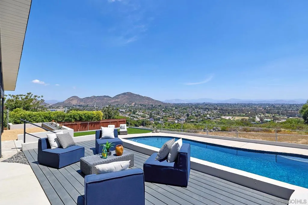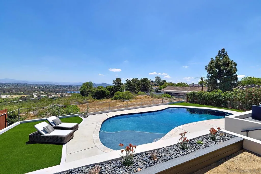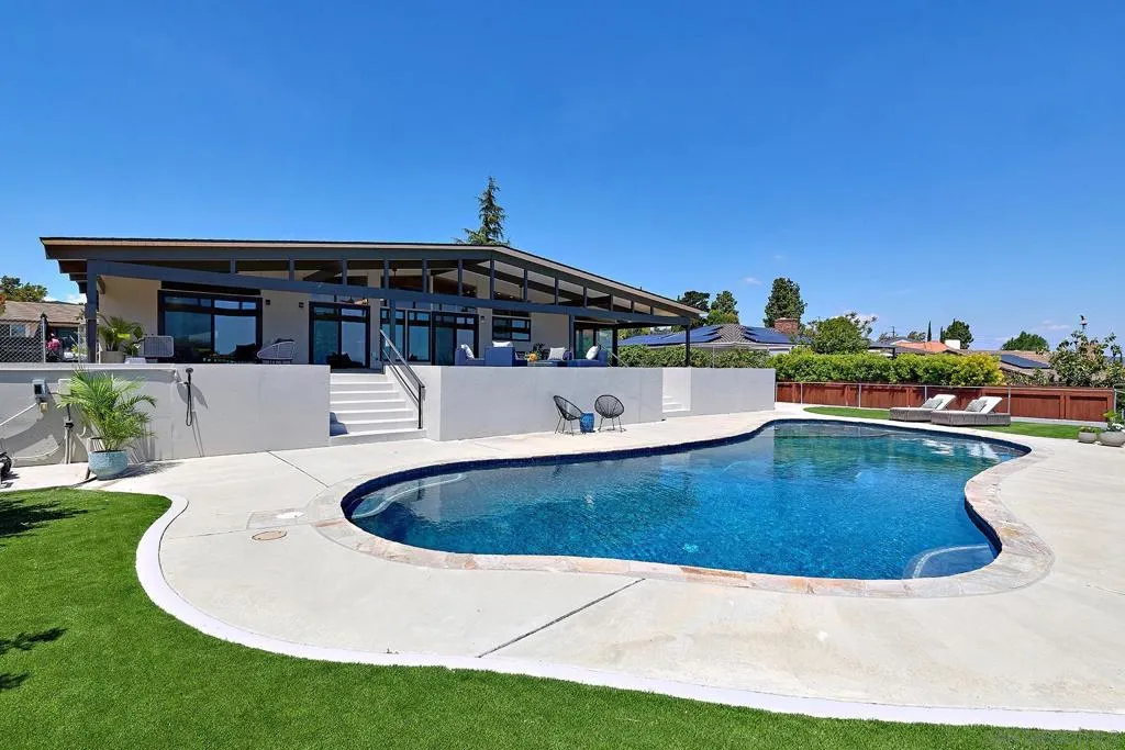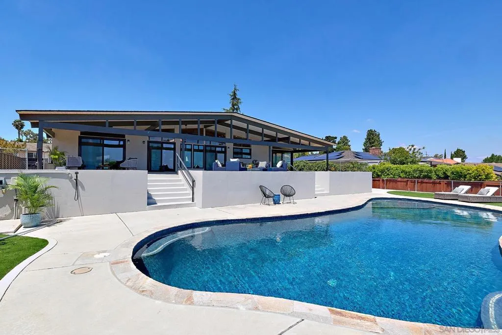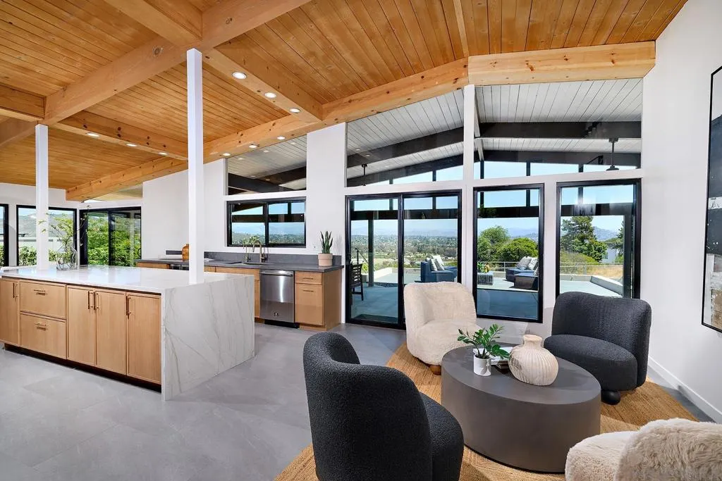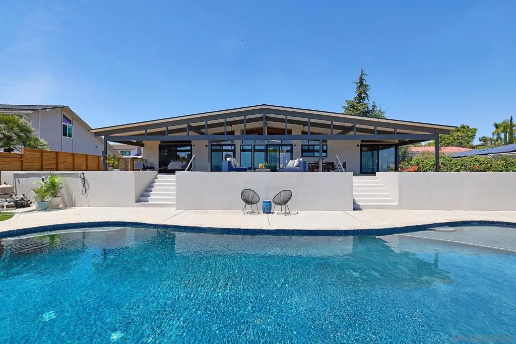 Iconic Krisel Mid-Century home with pool, views, and serious entertaining space. This single-level 4 bed, 3 bath home has been thoughtfully reimagined to honor its architectural roots while delivering today's modern comforts. Expansive indoor-outdoor living includes a private pool and over 1,000 sq ft of covered entertaining space. A rare opportunity to own a true piece of California modernism. Architecturally significant mid-century modern residence designed by William Krisel, showcasing iconic design paired with a complete modern reimagining. This single-level home offers 4 bedrooms, 3 bathrooms, and approximately 2,700 square feet of open, expansive living space. Signature mid-century elements are on full display, including dramatic vaulted ceilings with exposed wood beams, clean architectural lines, and walls of dual-pane floor-to-ceiling glass that flood the home with natural light while framing sweeping lake and mountain views. The thoughtfully designed open floor plan creates seamless flow between living, dining, and kitchen spaces—ideal for both everyday living and entertaining. The chef’s kitchen is a true centerpiece, featuring slim shaker wood cabinetry, high-end appliances, champagne bronze hardware, and a striking 10-foot quartzite waterfall island with eat-at seating. Additional highlights include a wine/beverage refrigerator and a dedicated water filtration system at the sink. The primary suite offers a private retreat, complete with vaulted ceilings, a spacious walk-in closet, and a spa-inspired bathroom featuring a walk-in marble shower and dual floating vanity with designer finishes. Indoor-outdoor living is elevated by the continuation of the roofline into an expansive covered entertaining space offering over 1,000 square feet of outdoor living. Complete with ceiling fans and integrated lighting, this space is designed for year-round enjoyment. A view deck, hard-piped for gas, is ready for a fire feature or outdoor kitchen to complete the experience. Just steps below, the backyard retreat features a beautifully designed pool with Baja shelf, surrounding lounge areas, and low-maintenance turf—all set against a stunning backdrop of panoramic lake and mountain views. Situated on a large, flat, and highly usable lot, the property also offers generous side yard space with endless potential for additional entertaining, play, or customization. Recent upgrades include a new roof, new dual-zoned A/C system, tankless water heater, and new windows and sliders—providing both comfort and peace of mind. A rare opportunity to own a true piece of California modernism, blending timeless architecture with today’s most desirable finishes and lifestyle amenities.