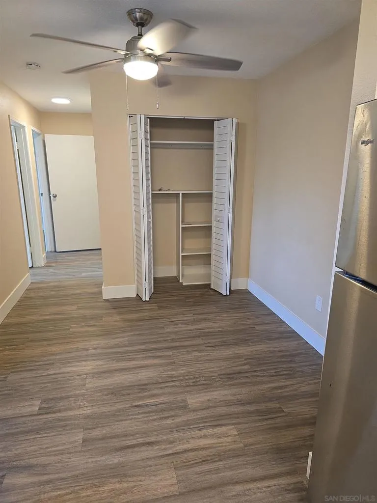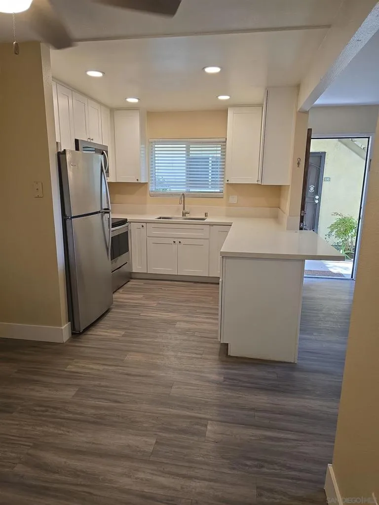 Beautifully updated first-floor unit featuring modern finishes and a functional open layout. The upgraded kitchen offers white shaker cabinetry, light quartz countertops, stainless steel appliances, recessed lighting, and a convenient peninsula for additional seating. Living and dining areas flow seamlessly with wood laminate flooring throughout and abundant natural light from the sliding glass door leading to a private patio, which includes a dedicated laundry closet with hookups for added convenience. The unit offers two well-sized bedrooms with mirrored closet doors, including a spacious primary bedroom with an additional closet and a separate vanity area. The bathroom features updated cabinetry, matching quartz countertops, and updated vanity lighting, along with a versatile Jack-and-Jill layout accessible from both the hallway and primary bedroom. Additional highlights include dual-pane windows, a ceiling fan in the dining area, and a dining area storage closet with custom built-in shelving, providing excellent organization and functionality. The unit includes one assigned parking space (#109) plus an additional permitted parking option and is located in a well-maintained community with greenbelt views, making this move-in-ready home ideal for both homeowners and investors alike.