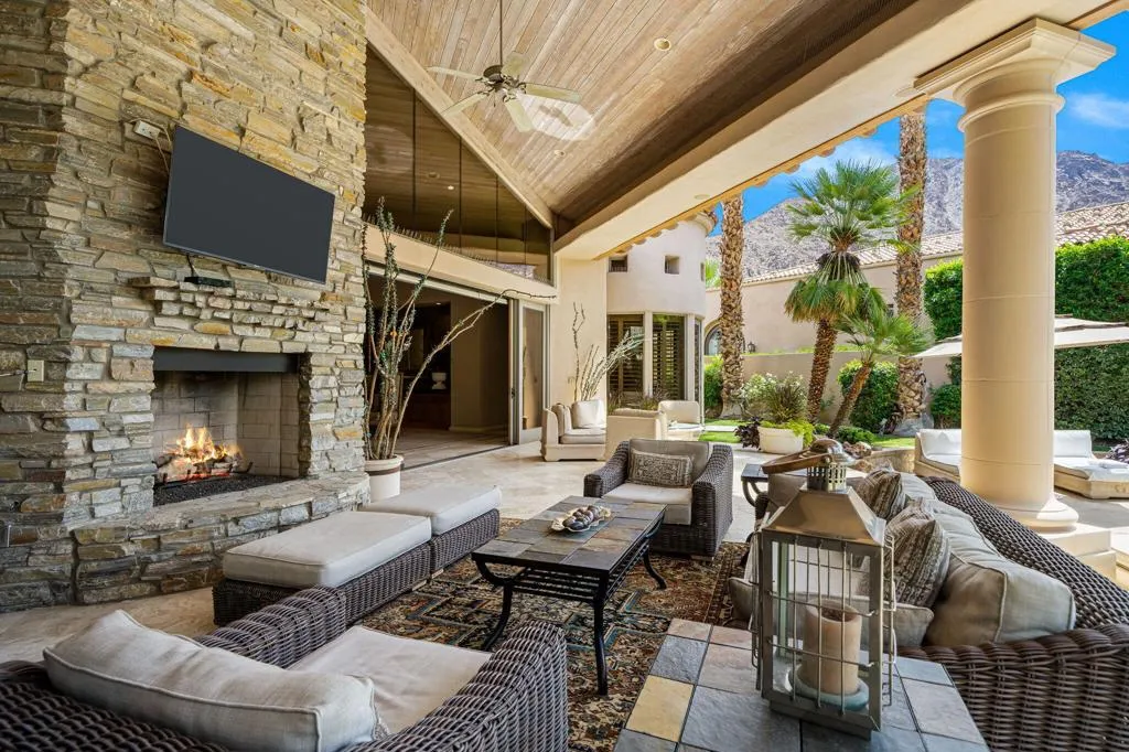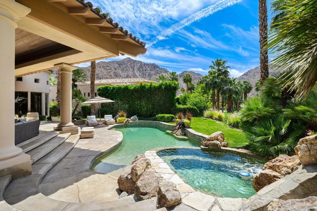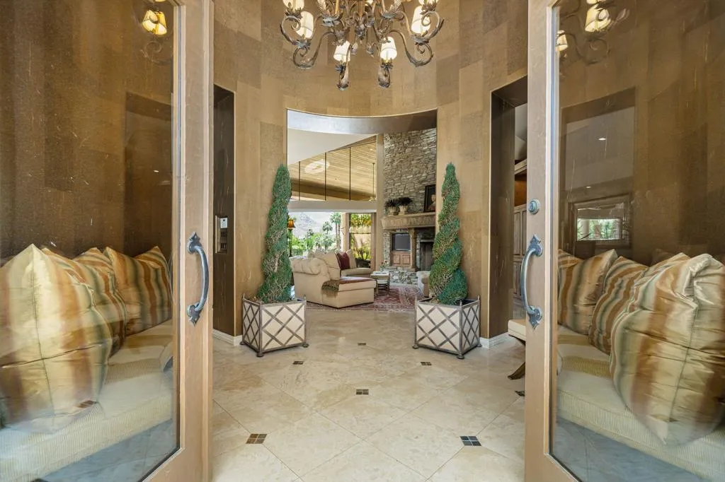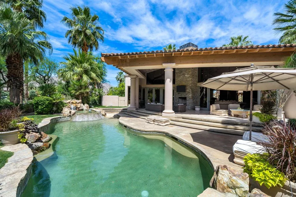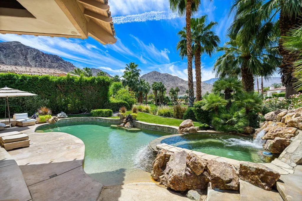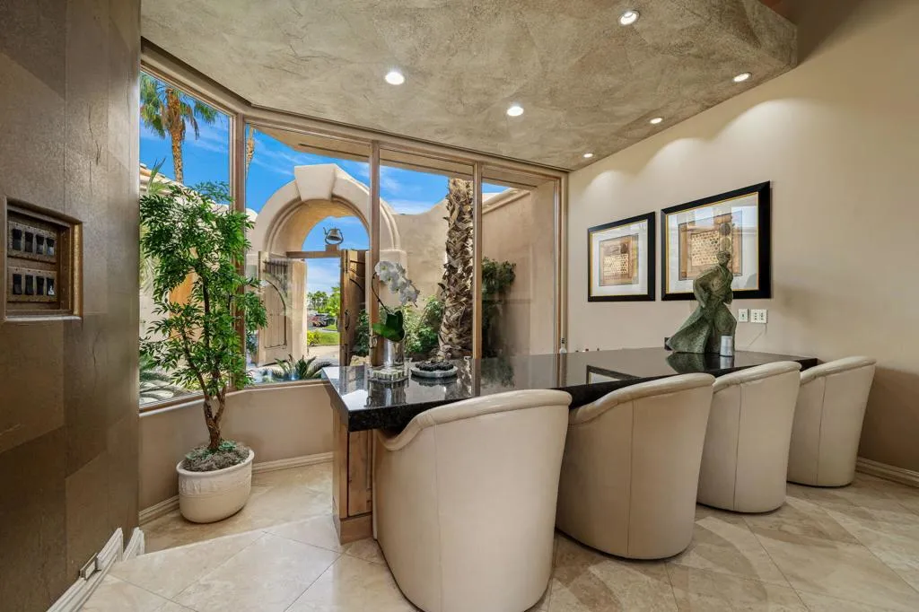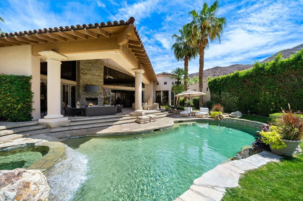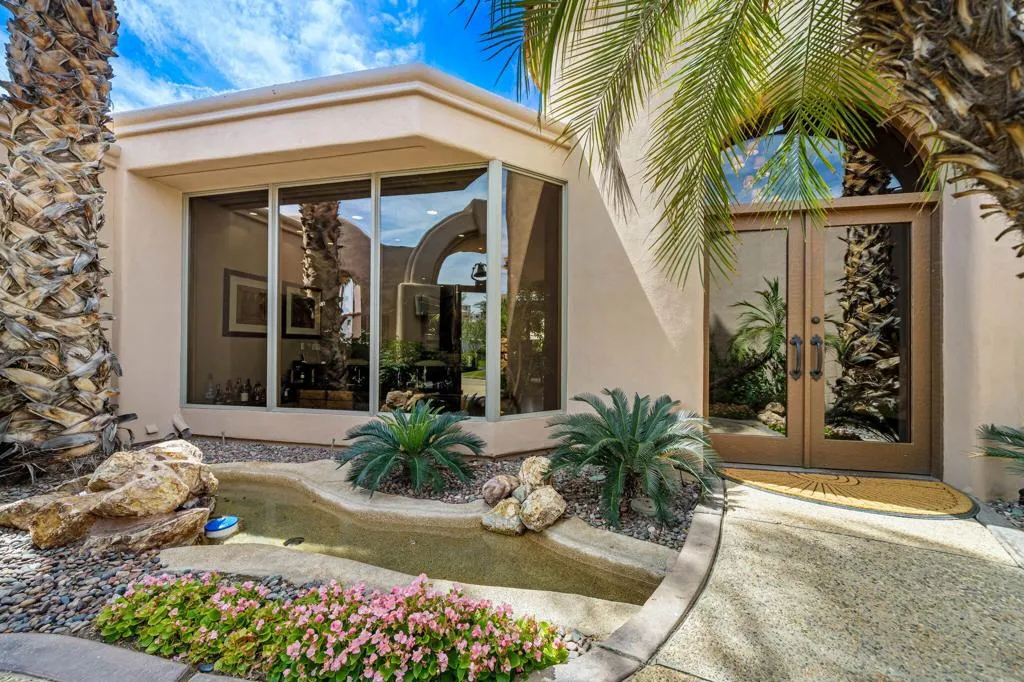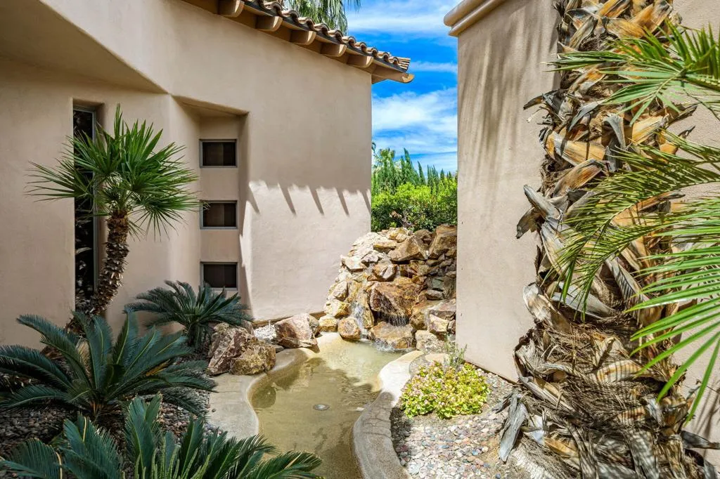 Designed by renowned architect Narendra Patel, this exceptional custom residence in Tradition offers timeless architecture, refined finishes, and breathtaking lakefront mountain views. Privately situated behind lush landscaping and dramatic water features, the home welcomes you through an elegant entry courtyard where cascading rock waterfalls create a true sense of arrival. Pocketing walls of glass seamlessly blend indoor and outdoor living, opening to expansive entertaining spaces with travertine flooring that continues throughout the patios. The stunning backyard is a private resort featuring a pebble-finish pool with swim-up jets, elevated spa, outdoor fireplace, and tranquil waterfalls flowing into the sparkling lake, all framed by panoramic southern mountain vistas. Inside, soaring ceilings and grand-scale rooms create an impressive yet inviting atmosphere. The great room features custom built-ins, a statement fireplace, and effortless connection to the outdoors. Formal dining, two powder rooms, and a stylish wet bar make entertaining easy. The gourmet kitchen is designed for both everyday living and hosting, complete with premium appliances, multiple prep stations, breakfast bar seating, and a sunny morning room overlooking the water and mountains. The luxurious primary suite is a private retreat with a separate office, dual custom closets, and a spa-inspired marble bath with soaking tub. A detached guest casita offers two spacious bedroom suites, two baths, refreshment bar, and added privacy for family or guests. Offered furnished per inventory, this extraordinary home captures the very best of Tradition living with privacy, craftsmanship, and unforgettable views.