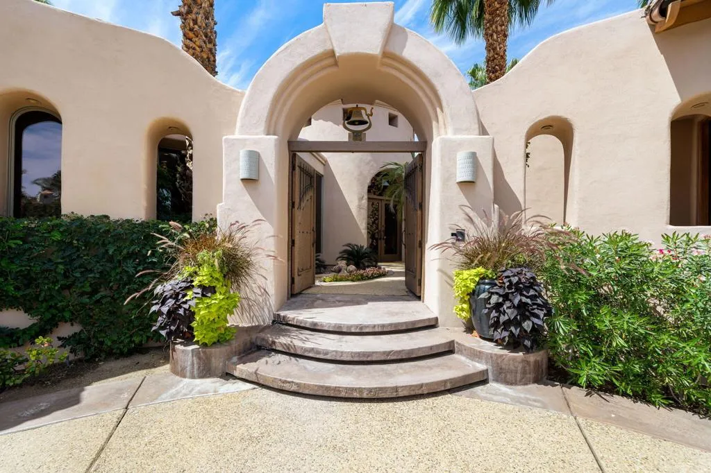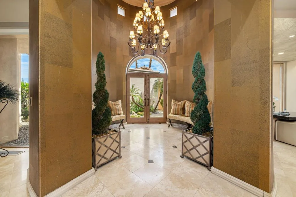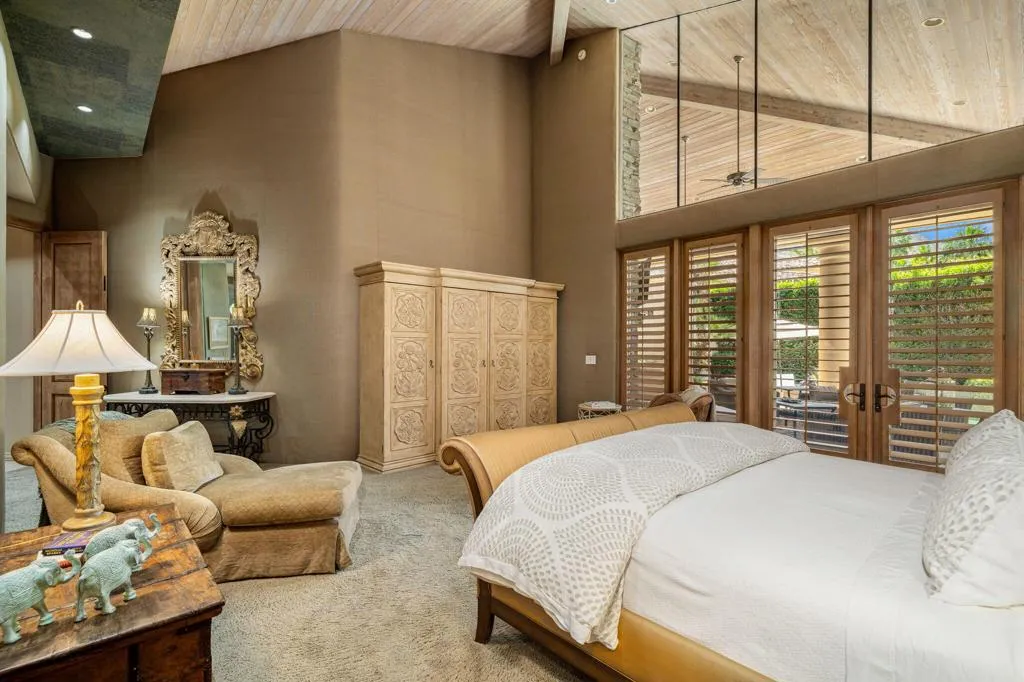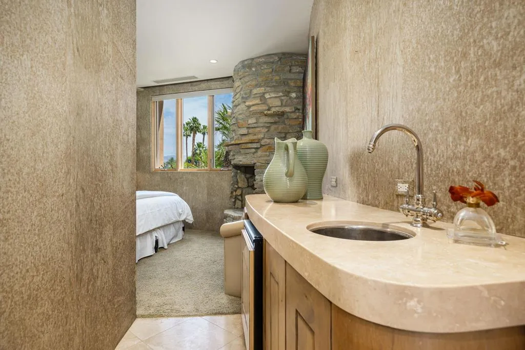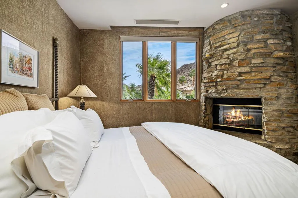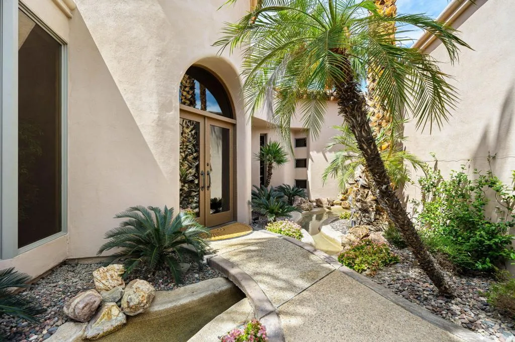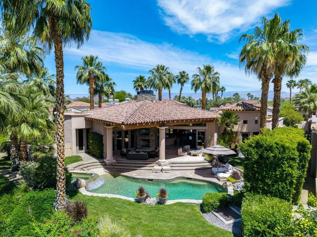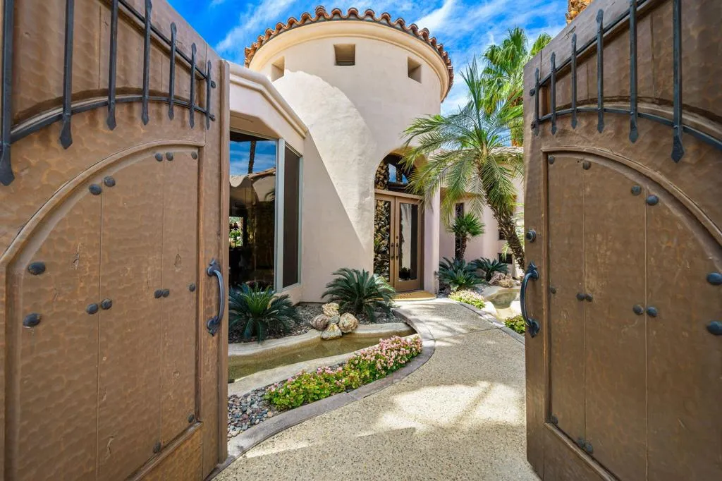 Designed by renowned architect Narendra Patel, this exceptional custom residence in Tradition offers timeless architecture, refined finishes, and breathtaking lakefront mountain views. Privately situated behind lush landscaping and dramatic water features, the home welcomes you through an elegant entry courtyard where cascading rock waterfalls create a true sense of arrival. Pocketing walls of glass seamlessly blend indoor and outdoor living, opening to expansive entertaining spaces with travertine flooring that continues throughout the patios. The stunning backyard is a private resort featuring a pebble-finish pool with swim-up jets, elevated spa, outdoor fireplace, and tranquil waterfalls flowing into the sparkling lake, all framed by panoramic southern mountain vistas. Inside, soaring ceilings and grand-scale rooms create an impressive yet inviting atmosphere. The great room features custom built-ins, a statement fireplace, and effortless connection to the outdoors. Formal dining, two powder rooms, and a stylish wet bar make entertaining easy. The gourmet kitchen is designed for both everyday living and hosting, complete with premium appliances, multiple prep stations, breakfast bar seating, and a sunny morning room overlooking the water and mountains. The luxurious primary suite is a private retreat with a separate office, dual custom closets, and a spa-inspired marble bath with soaking tub. A detached guest casita offers two spacious bedroom suites, two baths, refreshment bar, and added privacy for family or guests. Offered furnished per inventory, this extraordinary home captures the very best of Tradition living with privacy, craftsmanship, and unforgettable views.