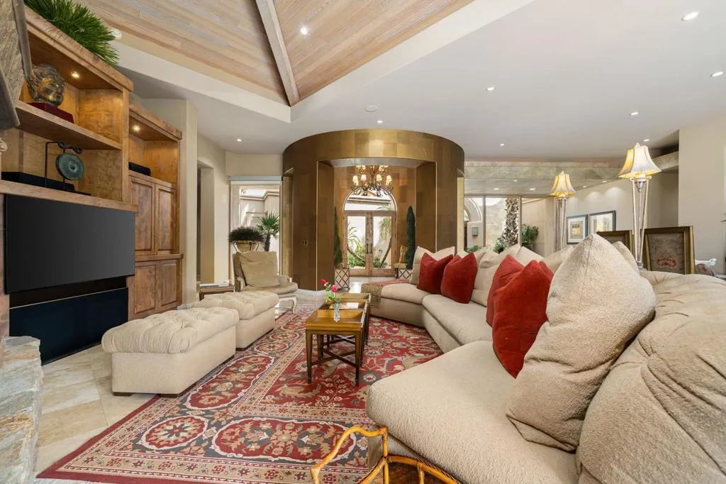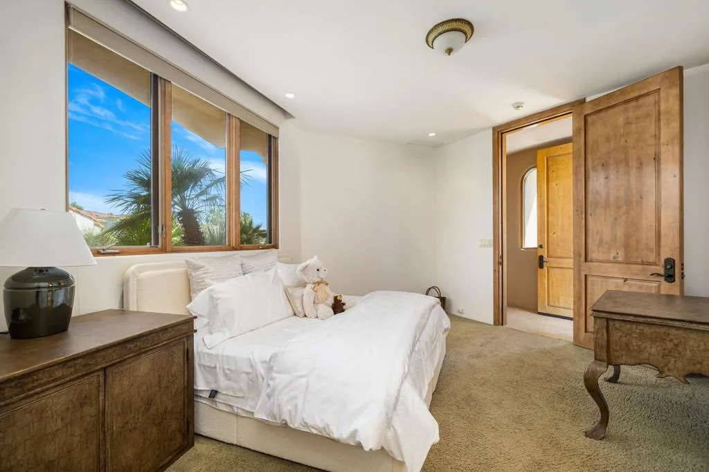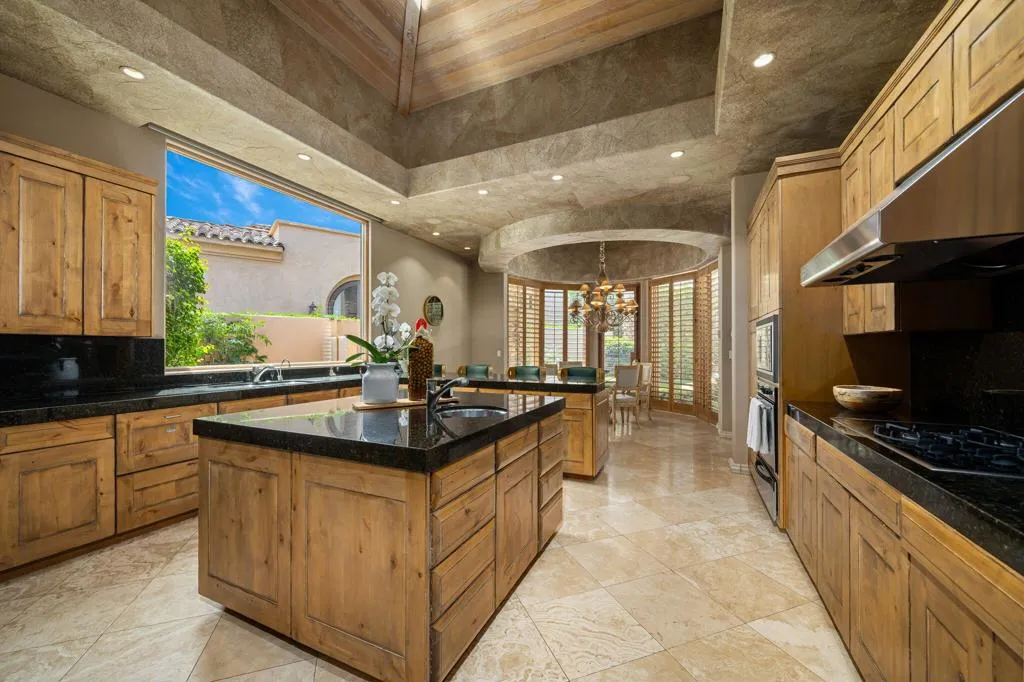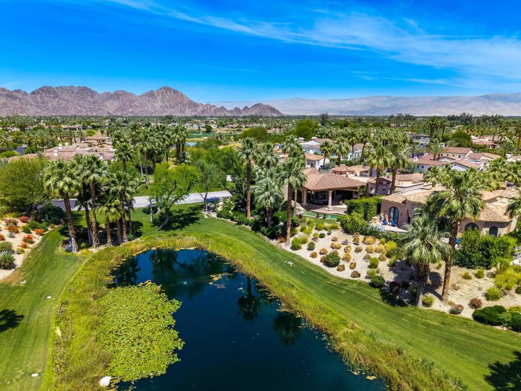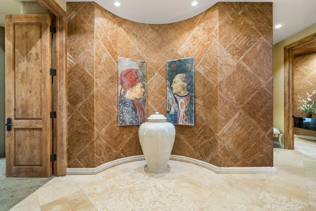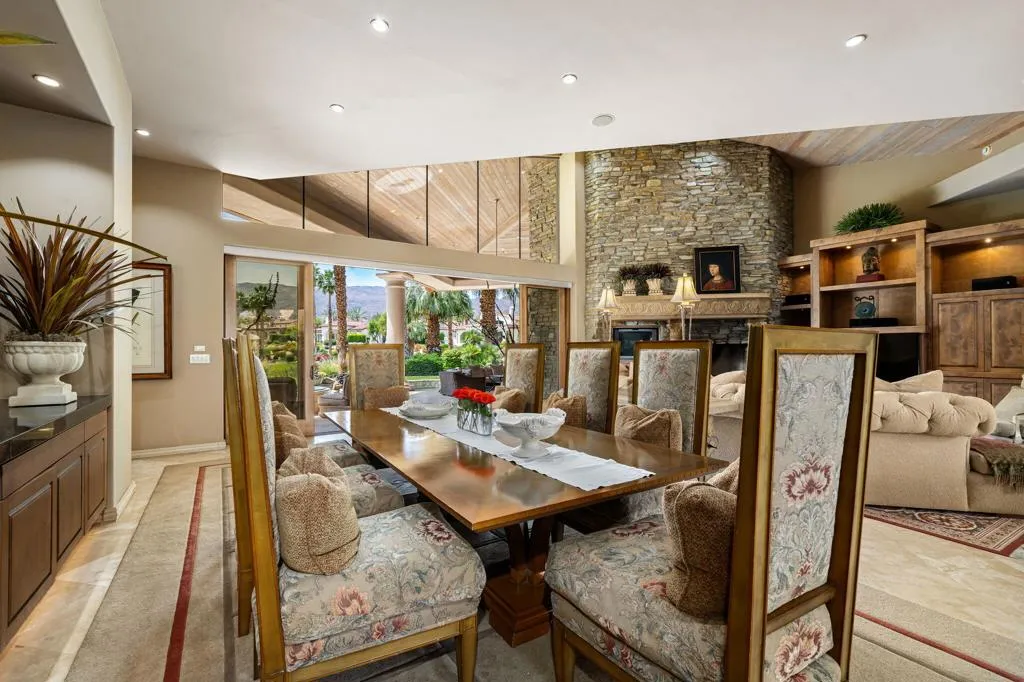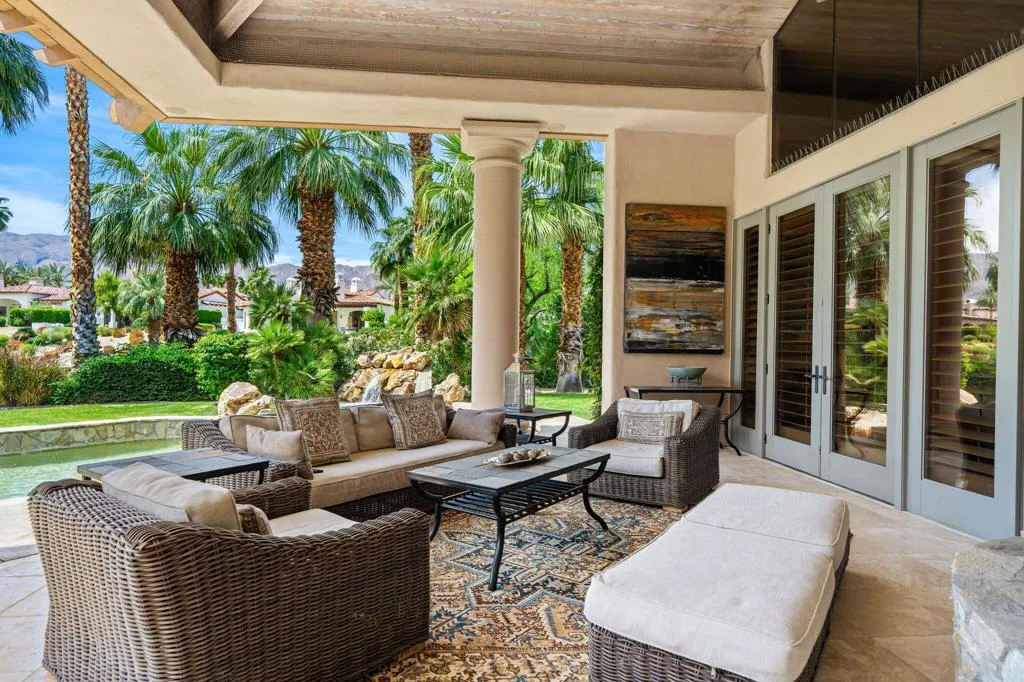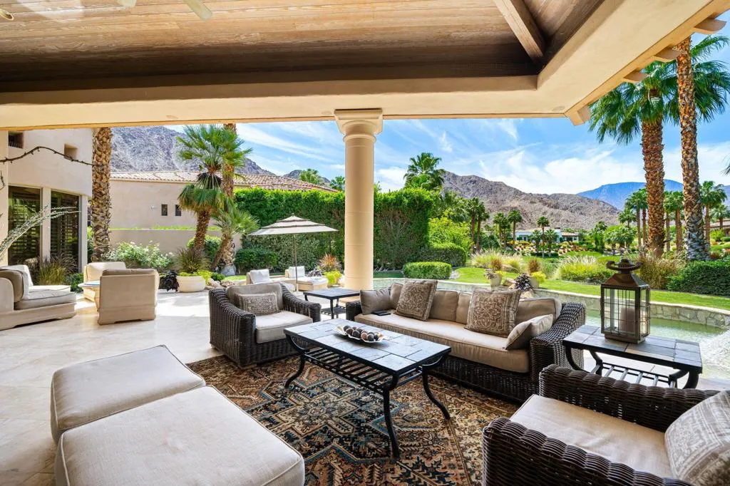 Designed by renowned architect Narendra Patel, this exceptional custom residence in Tradition offers timeless architecture, refined finishes, and breathtaking lakefront mountain views. Privately situated behind lush landscaping and dramatic water features, the home welcomes you through an elegant entry courtyard where cascading rock waterfalls create a true sense of arrival. Pocketing walls of glass seamlessly blend indoor and outdoor living, opening to expansive entertaining spaces with travertine flooring that continues throughout the patios. The stunning backyard is a private resort featuring a pebble-finish pool with swim-up jets, elevated spa, outdoor fireplace, and tranquil waterfalls flowing into the sparkling lake, all framed by panoramic southern mountain vistas. Inside, soaring ceilings and grand-scale rooms create an impressive yet inviting atmosphere. The great room features custom built-ins, a statement fireplace, and effortless connection to the outdoors. Formal dining, two powder rooms, and a stylish wet bar make entertaining easy. The gourmet kitchen is designed for both everyday living and hosting, complete with premium appliances, multiple prep stations, breakfast bar seating, and a sunny morning room overlooking the water and mountains. The luxurious primary suite is a private retreat with a separate office, dual custom closets, and a spa-inspired marble bath with soaking tub. A detached guest casita offers two spacious bedroom suites, two baths, refreshment bar, and added privacy for family or guests. Offered furnished per inventory, this extraordinary home captures the very best of Tradition living with privacy, craftsmanship, and unforgettable views.