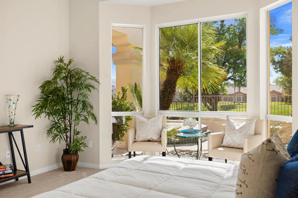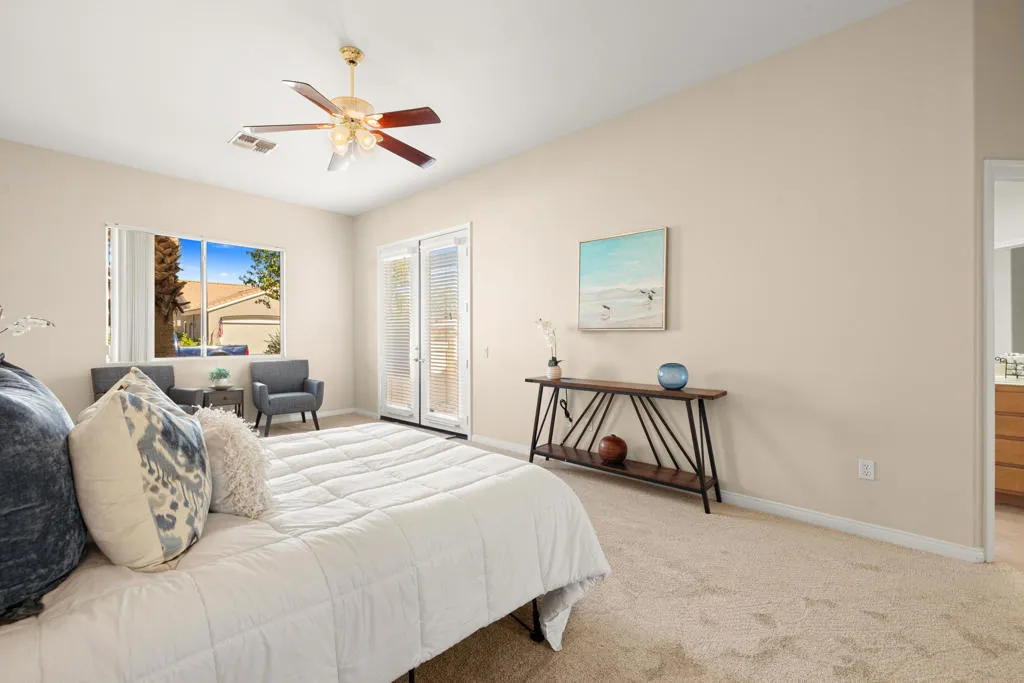 55+ Sun City Palm Desert--Fully Extended Monaco model with 3 bedrooms plus an office area, 3 full baths with all new carpet and new paint. Fantastic location on the 13th tee of the Santa Rosa Golf Course with expansive golf course and mountain views, a cool east facing covered patio perfect for your morning coffee and afternoon entertaining. Beautiful curb appeal with painted concrete, private gated courtyard leading to the impressive double doors with glass panels. Inside, an inviting dining area and living room boasts high ceilings and a wall of windows and sliding doors filling the room with natural light. A gourmet kitchen opens up to a casual family room and kitchen nook with a view. The kitchen features a 10 foot-long chef's island, vegetable sink, Corian counters, and black appliances. The master suite features a bay window, large master bath with dual vanities, separate tub and shower and spacious walk-in closet. The two extended guest suites are considered 'attached' casitas as they both have French doors that open to the courtyard and both have en-suite full bathrooms. The laundry doubles as an office space and the washer, dryer and sink are in the garage. The 2-car plus golf cart garage is extended. The patio has built-in BBQ and hot tub (both will be included 'As Is') This home is being sold by the executor of the estate and will be sold 'As Is'.Sun City has so much to offer...3 clubhouses, two 18-hole golf courses, 4 salt water pools (one indoor), tennis, pickleball, softball, bocce ball, 18-hole putting course, 2 restaurants and 70 social and art clubs all convenienly located near gorcery shopping, dining, and medical services. 'Buy Where You Love to Play....Sun City Palm Desert!'