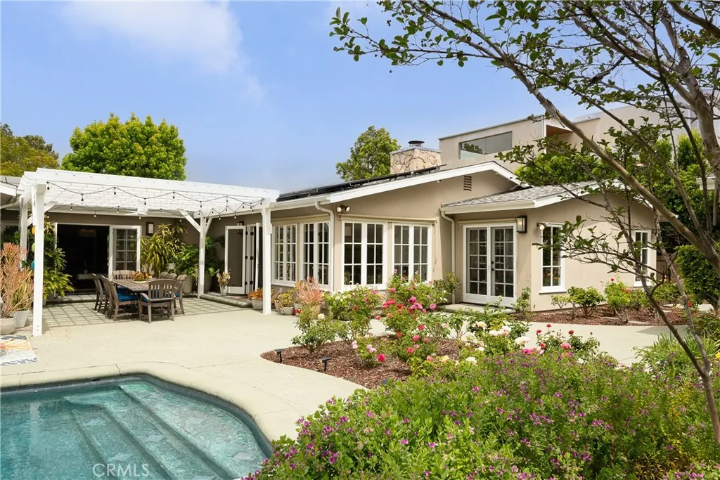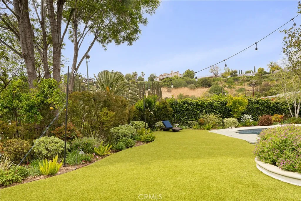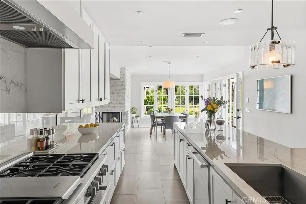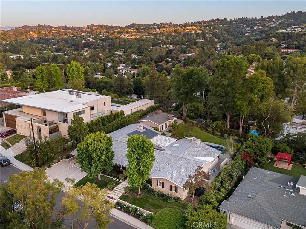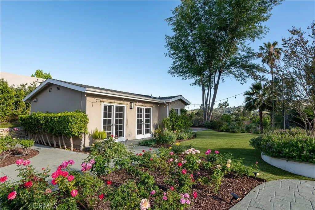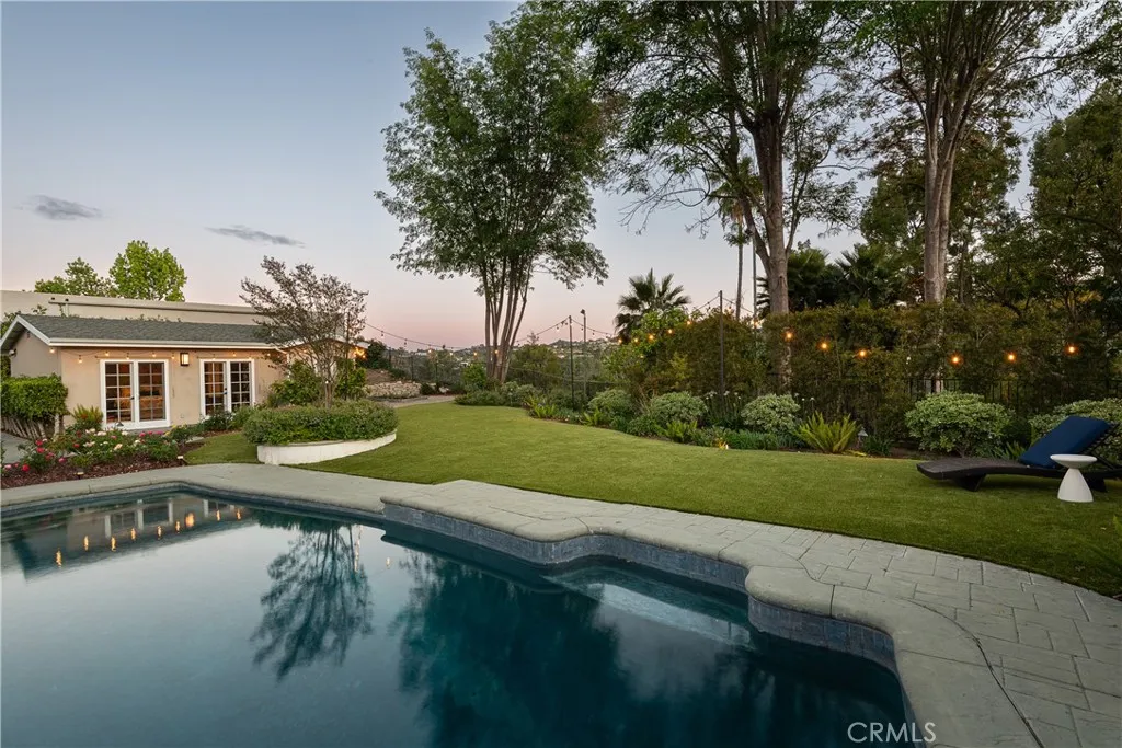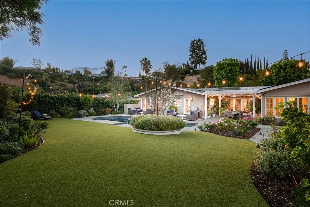 Set on a quiet Encino street, this expansive single-story estate offers approximately 4,600 sq ft including a 584 sq ft detached guest house. Positioned on a rare, flat lot of nearly 18,000 sq ft, the property offers privacy and hillside views. Light-filled interiors feature skylights and French doors that open directly to the backyard, creating a natural connection between indoor and outdoor spaces. Formal living and dining rooms flow into an open kitchen and family room centered around a double-sided fireplace, making the layout especially well suited for both everyday living and entertaining. The kitchen is updated with quartzite waterfall countertops and backsplash, custom cabinetry, a large island, and a full suite of Miele appliances. The primary bedroom suite includes a sitting area, fireplace, and direct outdoor access, along with a spacious bath featuring a soaking tub, dual vanities, and custom closets. Additional bedrooms offer en-suite baths. The backyard is a highlight of the property, private and well laid out, with a pool and spa, grassy yard, pergola-covered patio, and multiple seating areas. The detached guest house offers added flexibility, complete with a kitchenette, its own HVAC, and space well suited for guests, a home office, or extended living. Additional features include a solar system, newly installed roof (2026), dual-zone HVAC, integrated Sonos audio, a monitored security system, and a well-equipped guest house with updated systems. Located just minutes from Ventura Blvd dining and shopping, and close to award winning and highly coveted private and public schools.