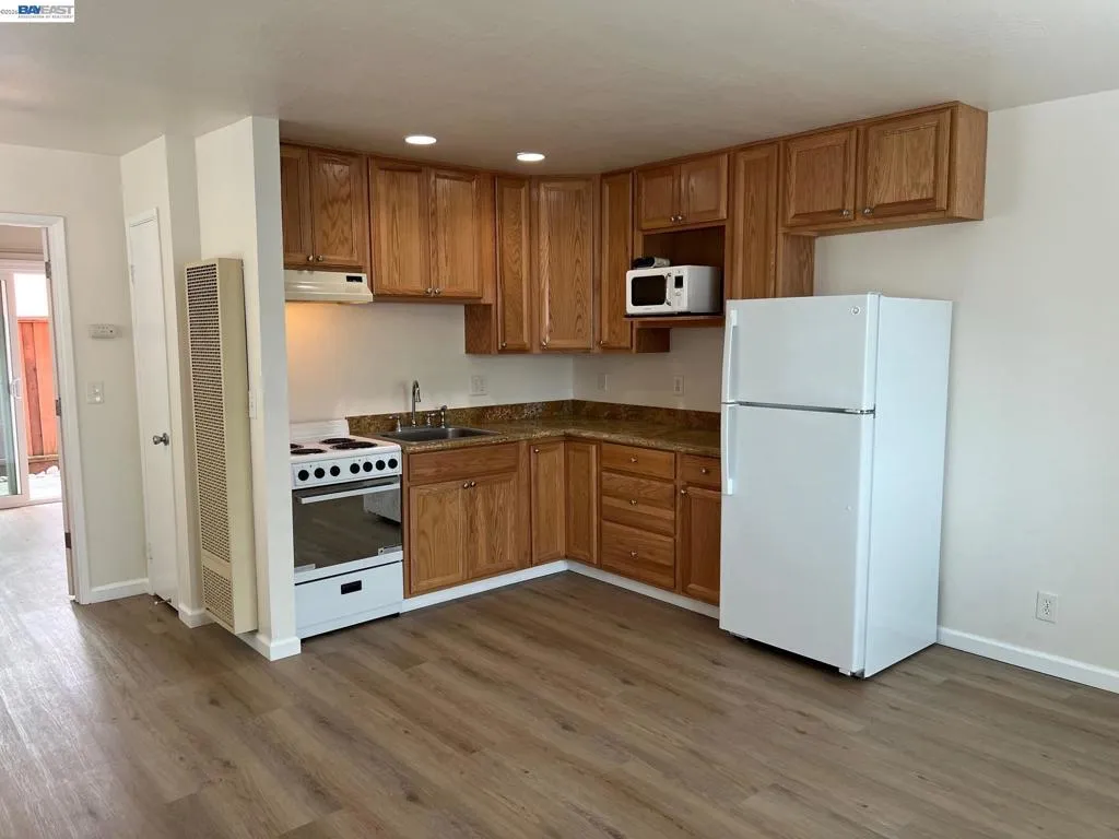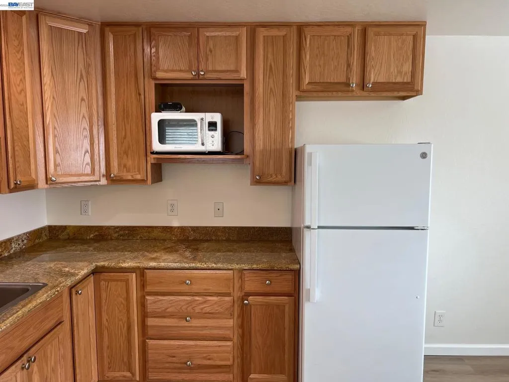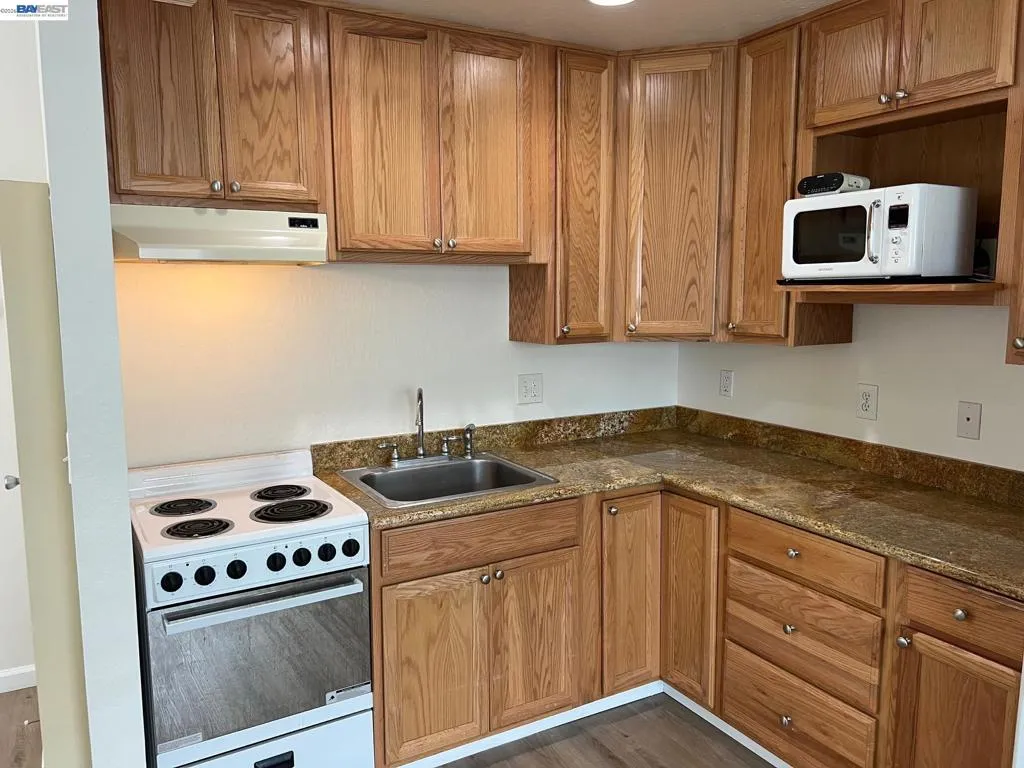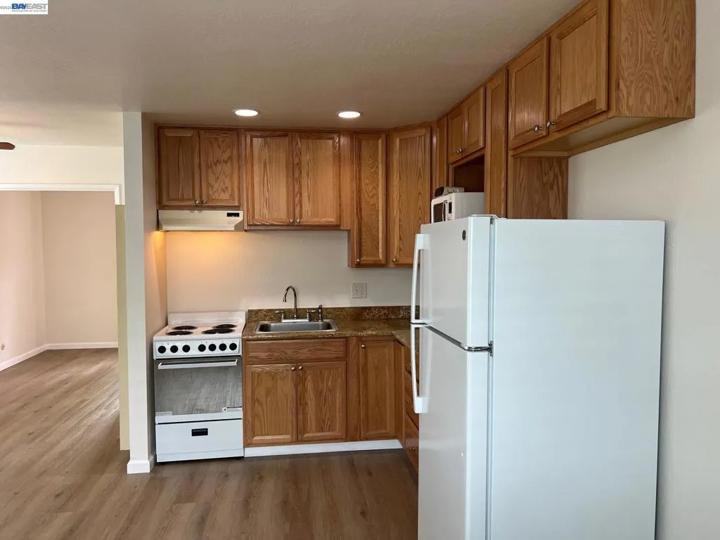 Updated One Bedroom Apartment in Pleasanton's Vintage Hills! Sunny, first floor unit, kitchen/living area with plank floors, ample kitchen cabinets, granite counters, dining area with lighted ceiling fan, double door access to bedroom suite featuring, bathroom with granite counter, large walk-in closer, slider access to private patio. One covered parking space. Water & Garbage included in the rent. On-site laundry. Walking distance to shopping, dining, services and community parks.