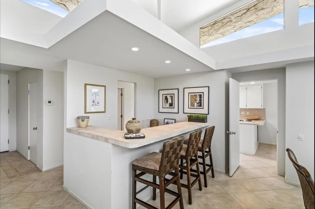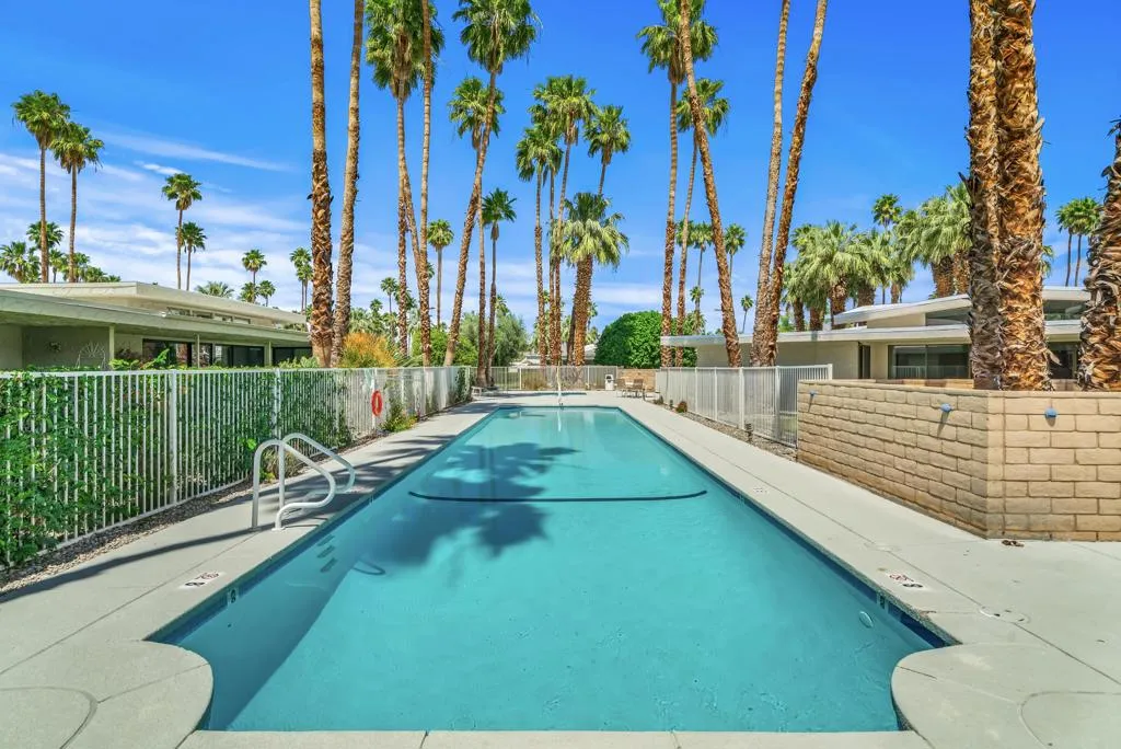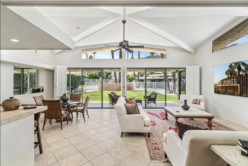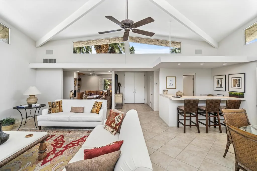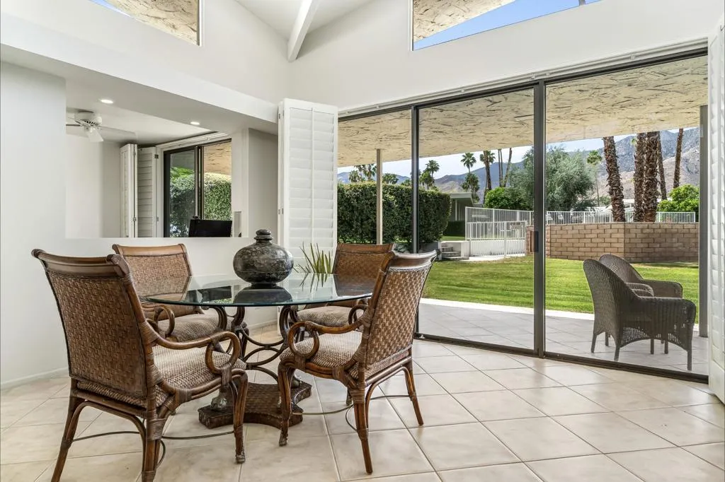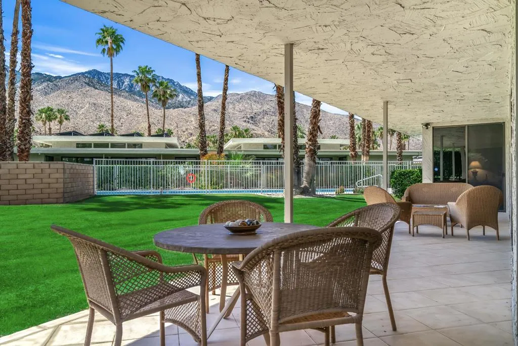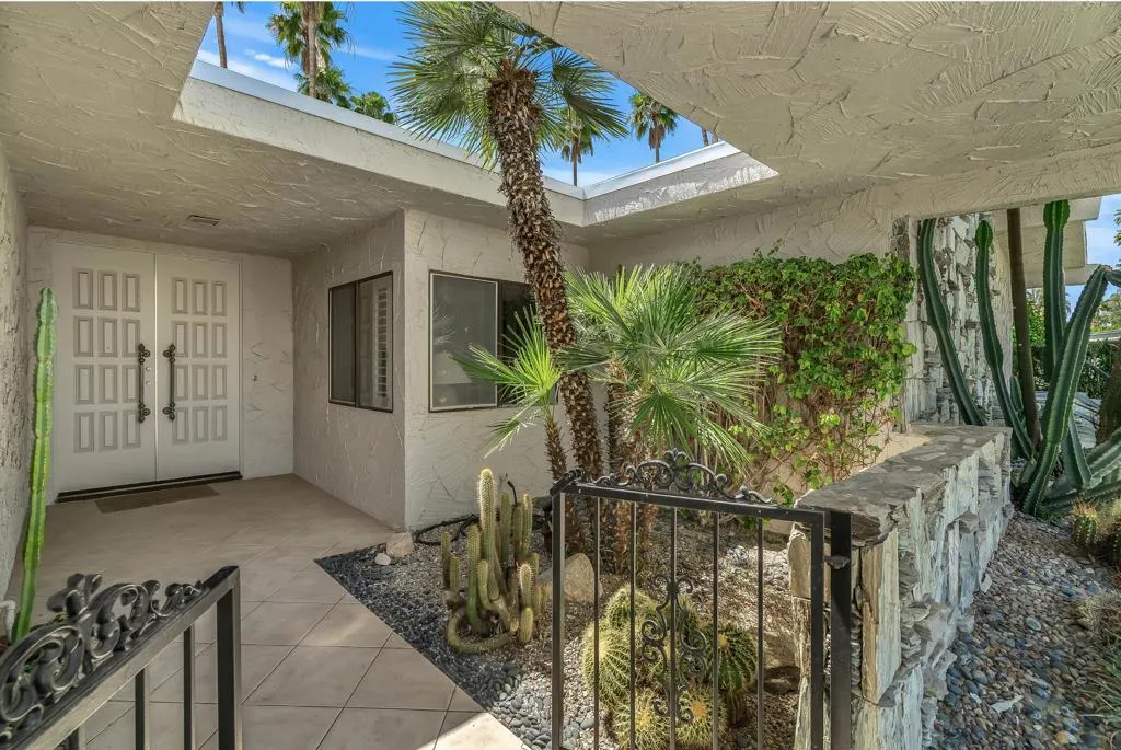 Serving chic mid-century in South Palm Springs' coveted Canyon Estates, this 2,600 sq. ft., 3 bedroom/2.5 bath villa is all about space, style and living your best desert life--with sweeping Mt. San Jacinto views as your backdrop! Step past a private atrium courtyard, through original paneled doors adorned with vintage Regency handles, and into architect Charles Du Bois' signature design--tented ceilings, clerestory windows, and light pouring in from every angle. The original bar, crowned by the architect's signature floating roof is just waiting for your next cocktail hour. Walls of glass open to a large leisure terrace with lush greenbelt and mountain views, plus one of the complex's largest pools just steps away--your own vacation getaway without the crowdsThe kitchen is spacious and inviting, offering abundant cabinetry, generous counter space, and a casual breakfast area, along with a thoughtfully integrated work from home space. The primary suite is a true retreat, featuring multiple closets--including a walk-in--alongside a vanity area and an oversized bathroom adorned with original Mesoamerican-inspired tilework, dual sinks, a soaking tub, and separate shower. Two additional guest rooms are equally well-proportioned, one currently used as a den with a gas fireplace.A newer roof and attached 2 car garage, completes this perfect picture.Life at Canyon Estates is both vibrant and refined. Your HOA fees include cable, Wi-Fi, landscaping, and access to an array of amenities. Meander through lush greenbelts dotted with citrus trees, enjoy 15 pools and 12 spas, or take advantage of tennis, pickleball, and a 9-hole Par 3 executive golf course. The signature clubhouse is a hub for social events and offers a fitness center, library, game room, and a scenic patio overlooking tranquil ponds--creating a true resort-inspired lifestyle in one of Palm Springs' most celebrated communities.