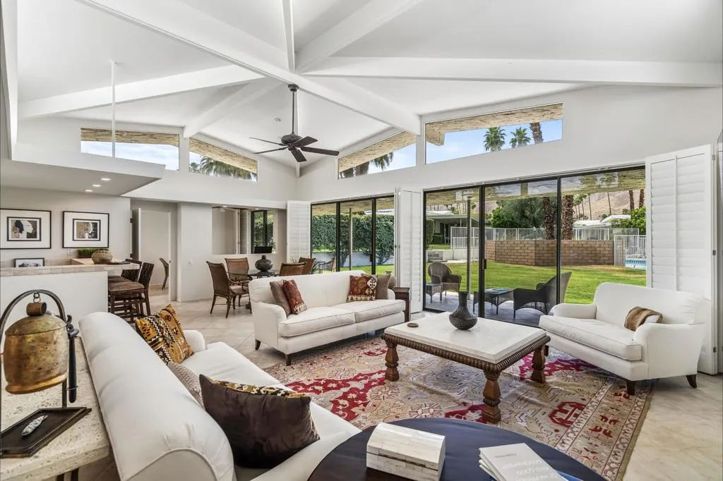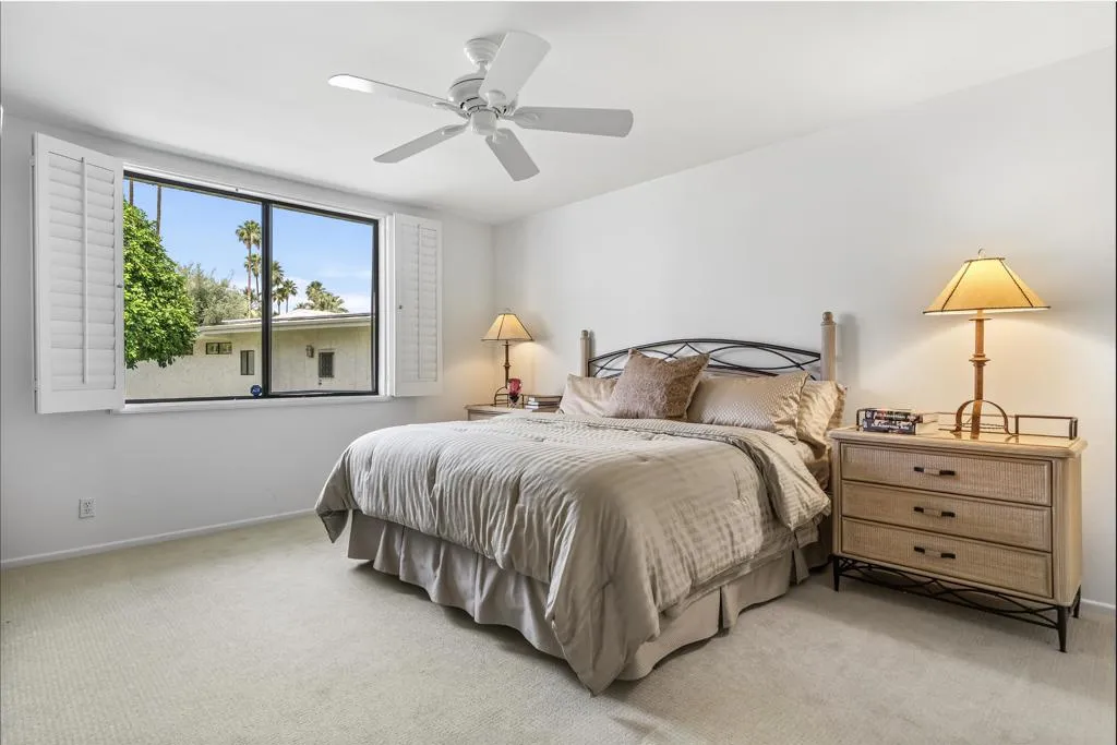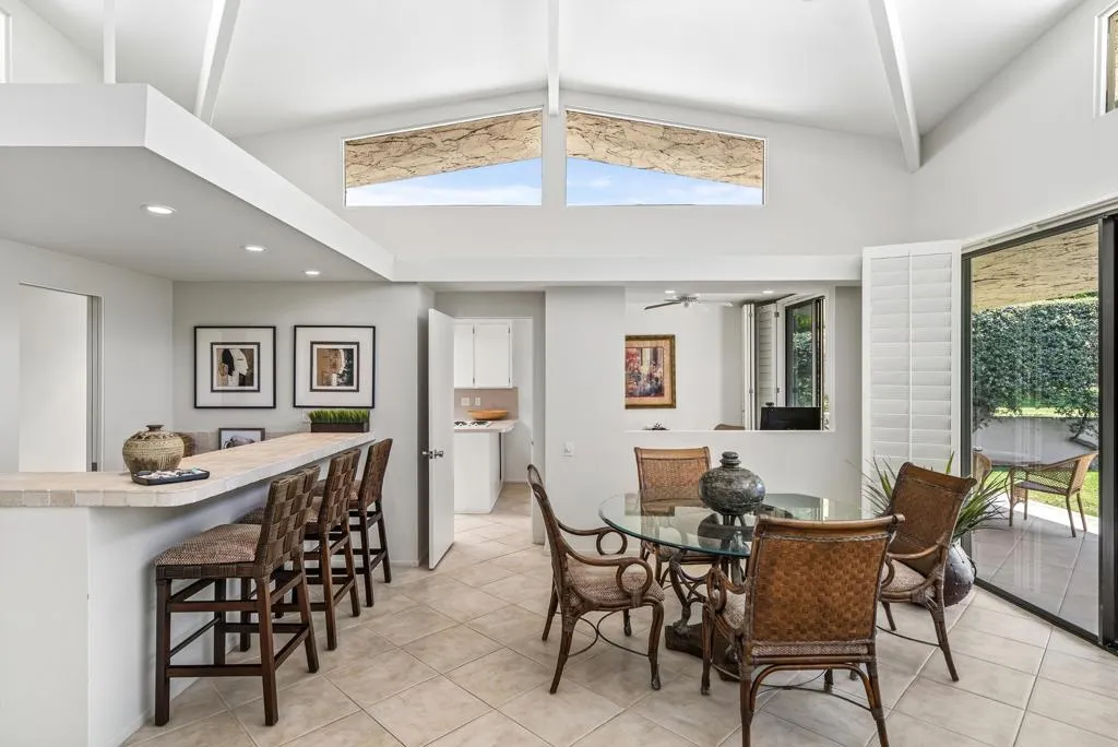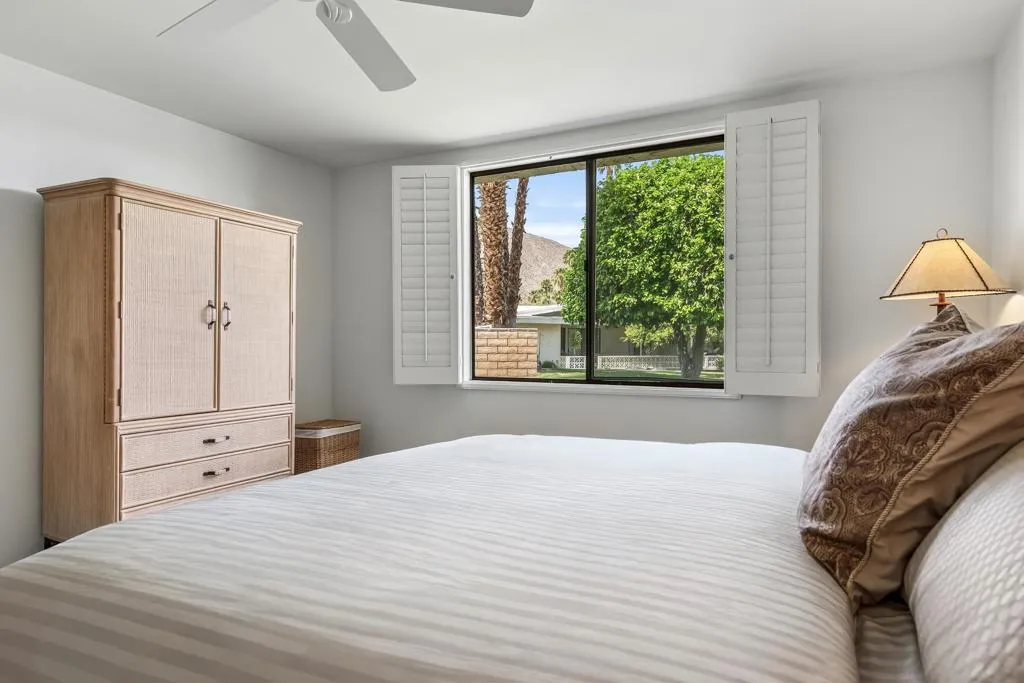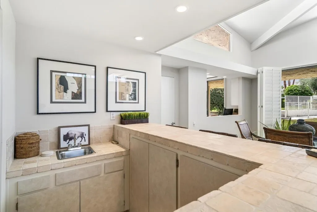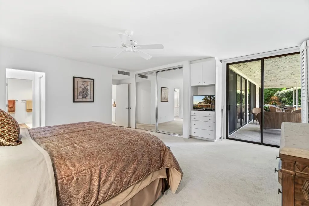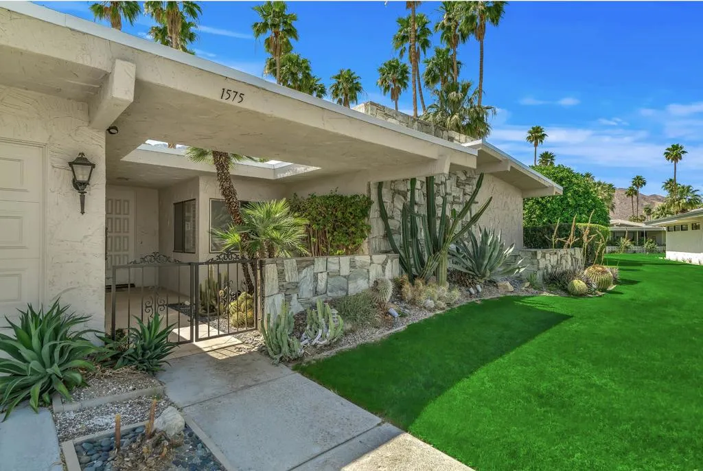 Serving chic mid-century in South Palm Springs' coveted Canyon Estates, this 2,600 sq. ft., 3 bedroom/2.5 bath villa is all about space, style and living your best desert life--with sweeping Mt. San Jacinto views as your backdrop! Step past a private atrium courtyard, through original paneled doors adorned with vintage Regency handles, and into architect Charles Du Bois' signature design--tented ceilings, clerestory windows, and light pouring in from every angle. The original bar, crowned by the architect's signature floating roof is just waiting for your next cocktail hour. Walls of glass open to a large leisure terrace with lush greenbelt and mountain views, plus one of the complex's largest pools just steps away--your own vacation getaway without the crowdsThe kitchen is spacious and inviting, offering abundant cabinetry, generous counter space, and a casual breakfast area, along with a thoughtfully integrated work from home space. The primary suite is a true retreat, featuring multiple closets--including a walk-in--alongside a vanity area and an oversized bathroom adorned with original Mesoamerican-inspired tilework, dual sinks, a soaking tub, and separate shower. Two additional guest rooms are equally well-proportioned, one currently used as a den with a gas fireplace.A newer roof and attached 2 car garage, completes this perfect picture.Life at Canyon Estates is both vibrant and refined. Your HOA fees include cable, Wi-Fi, landscaping, and access to an array of amenities. Meander through lush greenbelts dotted with citrus trees, enjoy 15 pools and 12 spas, or take advantage of tennis, pickleball, and a 9-hole Par 3 executive golf course. The signature clubhouse is a hub for social events and offers a fitness center, library, game room, and a scenic patio overlooking tranquil ponds--creating a true resort-inspired lifestyle in one of Palm Springs' most celebrated communities.