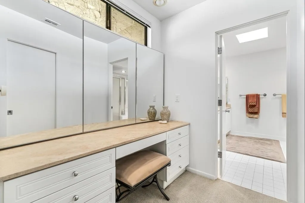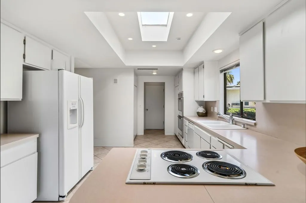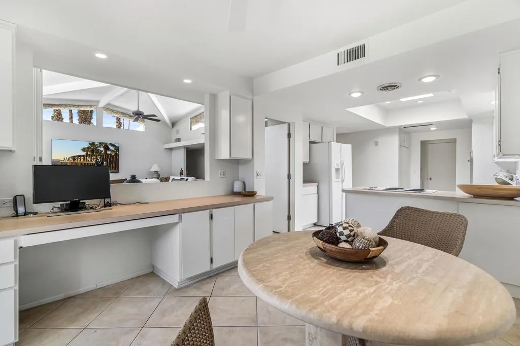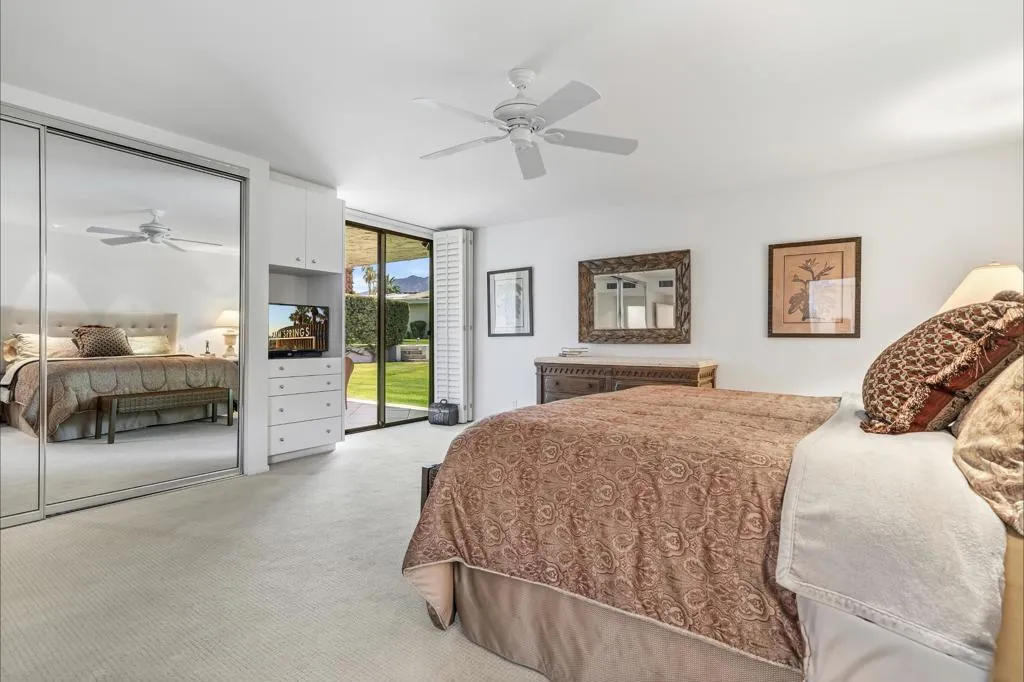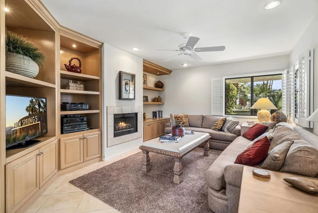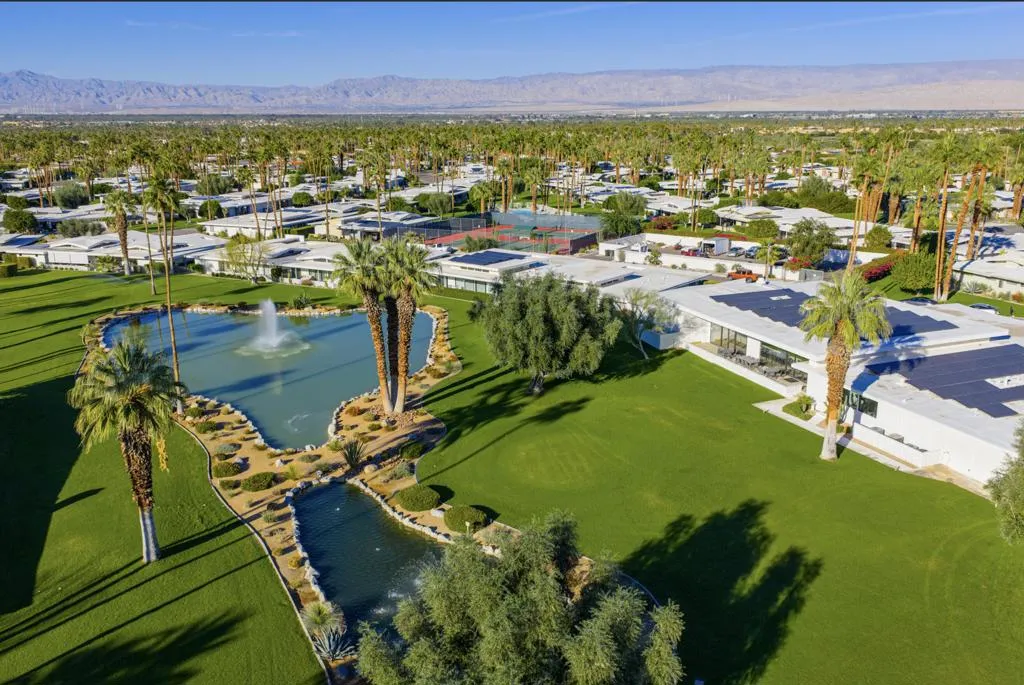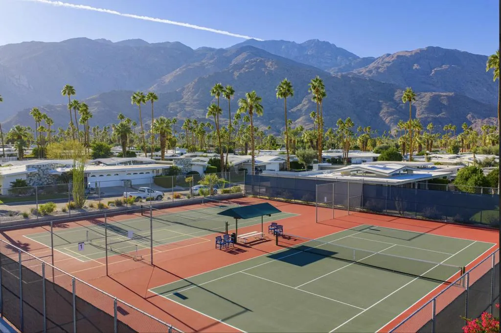 Serving chic mid-century in South Palm Springs' coveted Canyon Estates, this 2,600 sq. ft., 3 bedroom/2.5 bath villa is all about space, style and living your best desert life--with sweeping Mt. San Jacinto views as your backdrop! Step past a private atrium courtyard, through original paneled doors adorned with vintage Regency handles, and into architect Charles Du Bois' signature design--tented ceilings, clerestory windows, and light pouring in from every angle. The original bar, crowned by the architect's signature floating roof is just waiting for your next cocktail hour. Walls of glass open to a large leisure terrace with lush greenbelt and mountain views, plus one of the complex's largest pools just steps away--your own vacation getaway without the crowdsThe kitchen is spacious and inviting, offering abundant cabinetry, generous counter space, and a casual breakfast area, along with a thoughtfully integrated work from home space. The primary suite is a true retreat, featuring multiple closets--including a walk-in--alongside a vanity area and an oversized bathroom adorned with original Mesoamerican-inspired tilework, dual sinks, a soaking tub, and separate shower. Two additional guest rooms are equally well-proportioned, one currently used as a den with a gas fireplace.A newer roof and attached 2 car garage, completes this perfect picture.Life at Canyon Estates is both vibrant and refined. Your HOA fees include cable, Wi-Fi, landscaping, and access to an array of amenities. Meander through lush greenbelts dotted with citrus trees, enjoy 15 pools and 12 spas, or take advantage of tennis, pickleball, and a 9-hole Par 3 executive golf course. The signature clubhouse is a hub for social events and offers a fitness center, library, game room, and a scenic patio overlooking tranquil ponds--creating a true resort-inspired lifestyle in one of Palm Springs' most celebrated communities.