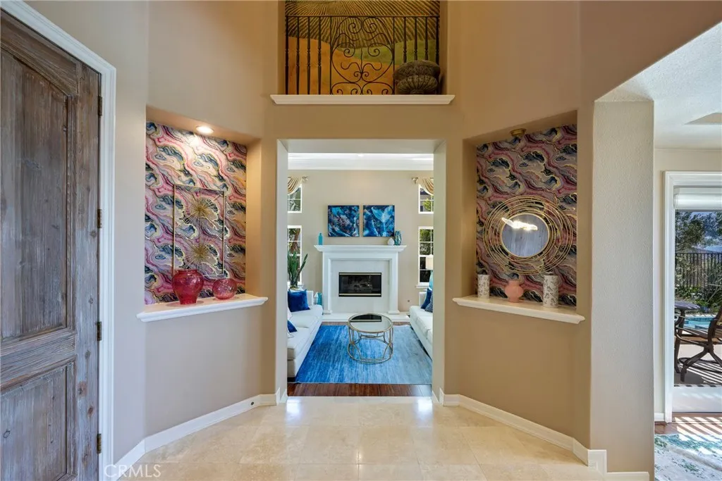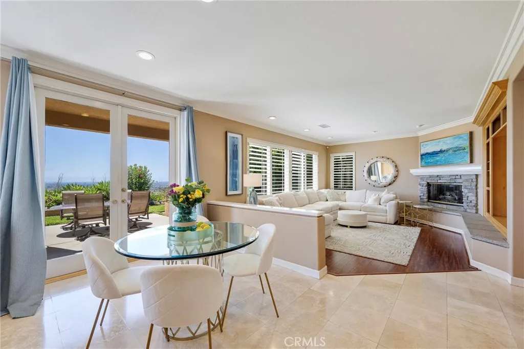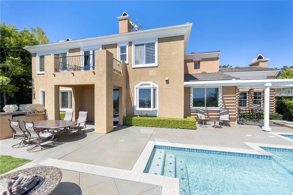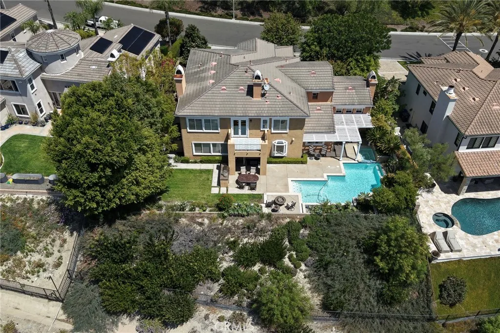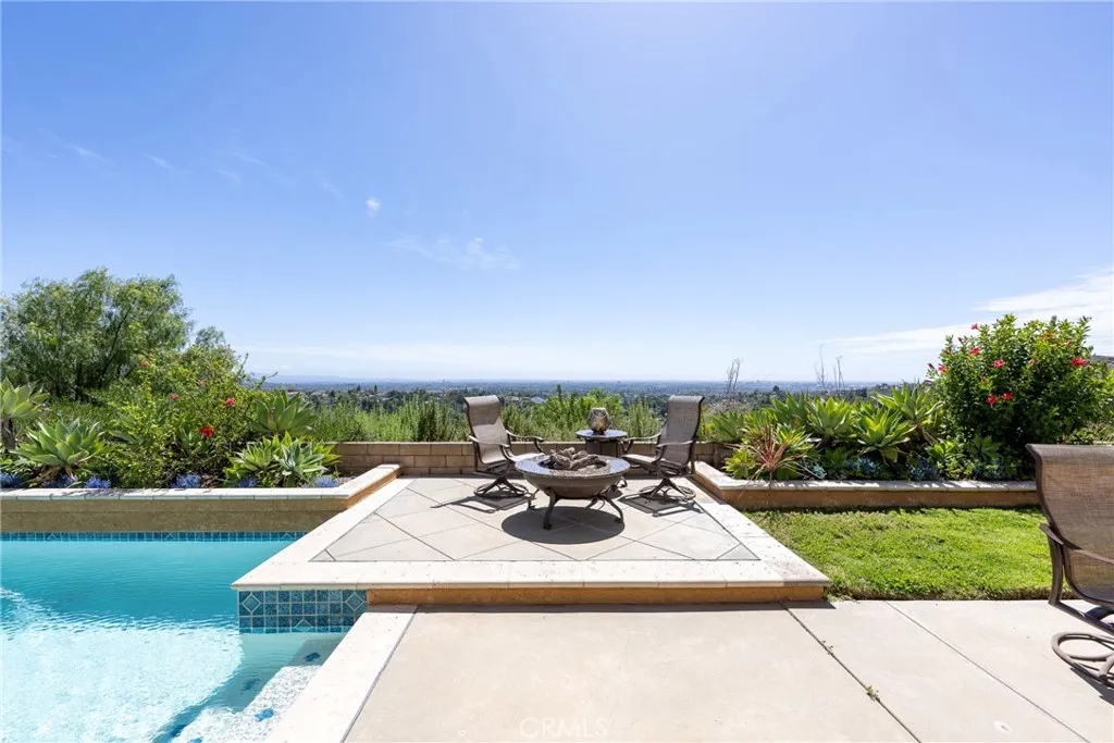 Unobstructed City Lights, Catalina & Ocean VIEWS abound from this exceptional home located in prestigious gate guarded Portofira Estates. The property is Perched on a hill located on a single loaded Street. Enjoy Ocean breezes & spectacular sunsets from your backyard that is suitable for intimate or large-scale entertaining. The Lushly landscaped yard has a saltwater pool and spa and built-in BBQ Island. Enter the property through a private gated Courtyard with Mature trees that leads to the dramatic entry with art niches. Step down to the Living Room with Fireplace & Dining room with French doors leading to the backyard. The gourmet kitchen with Double SS ovens, dishwasher, microwave, 6 burner cooktop, refrigerator, center island & Quartz countertops, large butler's pantry with wine/beverage refrigerator., and walk in pantry, is open to the family room with fireplace. There is a downstairs bedroom suite with a walk-in closet, full bath and ceiling fan. Office with beautiful Built Ins and a glass French door entrance., Large Laundry Room with sink, washer/dryer, full size refrigerator, and plenty of storage. The magnificent gallery hallway leads up the stairway to the luxurious master suite with fireplace, and view deck. The Master Baath has walk in closets, tub, & glass enclosed marble shower. Dual separated vanity areas. There are 3 additional bedrooms upstairs, two with a shared bath, and one with a private full bath. Plantation shutters and Crown Molding throughout. Ceiling Fans in all bedrooms & Office. Wood & Marble flooring Large 4 car garage with built ins and central vac. Meticulously maintained and cared for home. Great area for hiking. The hills in the area are laced with trails that rise to the ridgeline with spectacular views of Orange County and the Ocean. At night the shimmering lights are mesmerizing. Quiet and serene location but Close to Freeway access, entertainment venues, and restaurants.