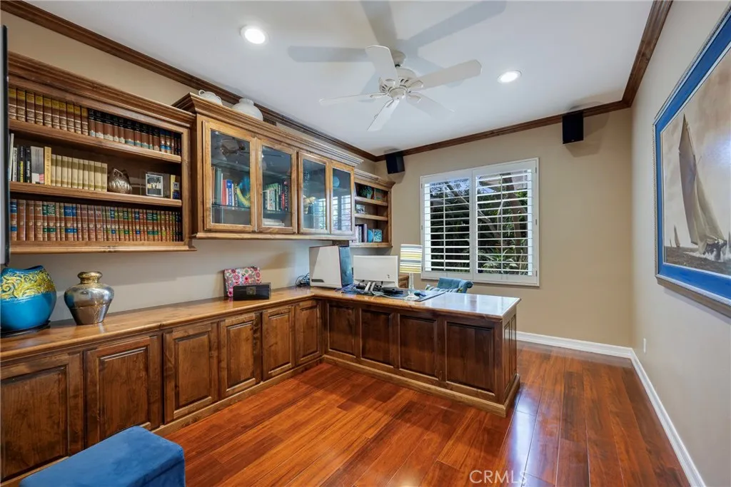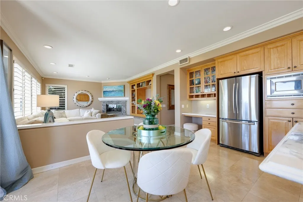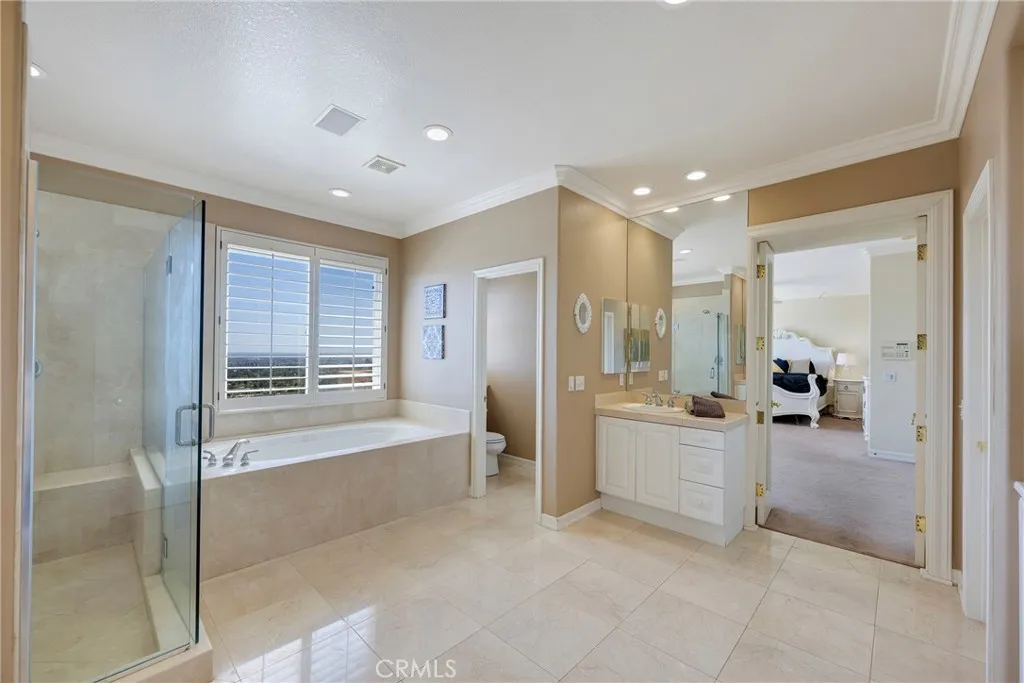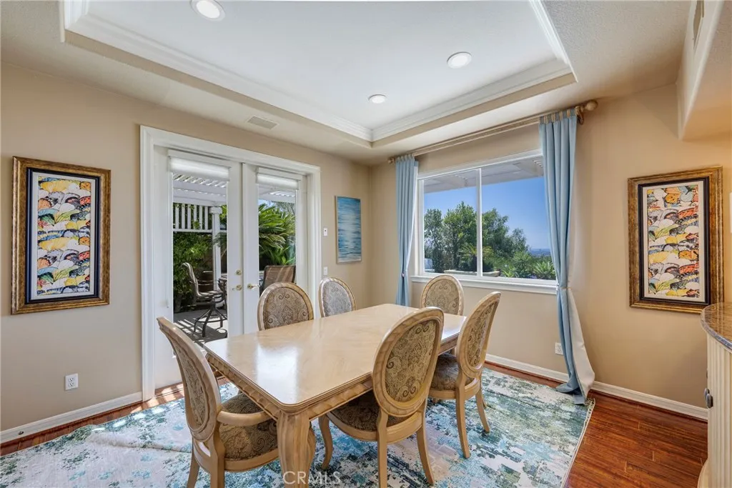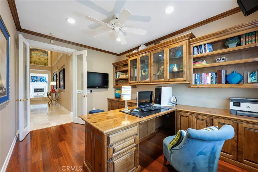 Unobstructed City Lights, Catalina & Ocean VIEWS abound from this exceptional home located in prestigious gate guarded Portofira Estates. The property is Perched on a hill located on a single loaded Street. Enjoy Ocean breezes & spectacular sunsets from your backyard that is suitable for intimate or large-scale entertaining. The Lushly landscaped yard has a saltwater pool and spa and built-in BBQ Island. Enter the property through a private gated Courtyard with Mature trees that leads to the dramatic entry with art niches. Step down to the Living Room with Fireplace & Dining room with French doors leading to the backyard. The gourmet kitchen with Double SS ovens, dishwasher, microwave, 6 burner cooktop, refrigerator, center island & Quartz countertops, large butler's pantry with wine/beverage refrigerator., and walk in pantry, is open to the family room with fireplace. There is a downstairs bedroom suite with a walk-in closet, full bath and ceiling fan. Office with beautiful Built Ins and a glass French door entrance., Large Laundry Room with sink, washer/dryer, full size refrigerator, and plenty of storage. The magnificent gallery hallway leads up the stairway to the luxurious master suite with fireplace, and view deck. The Master Baath has walk in closets, tub, & glass enclosed marble shower. Dual separated vanity areas. There are 3 additional bedrooms upstairs, two with a shared bath, and one with a private full bath. Plantation shutters and Crown Molding throughout. Ceiling Fans in all bedrooms & Office. Wood & Marble flooring Large 4 car garage with built ins and central vac. Meticulously maintained and cared for home. Great area for hiking. The hills in the area are laced with trails that rise to the ridgeline with spectacular views of Orange County and the Ocean. At night the shimmering lights are mesmerizing. Quiet and serene location but Close to Freeway access, entertainment venues, and restaurants.