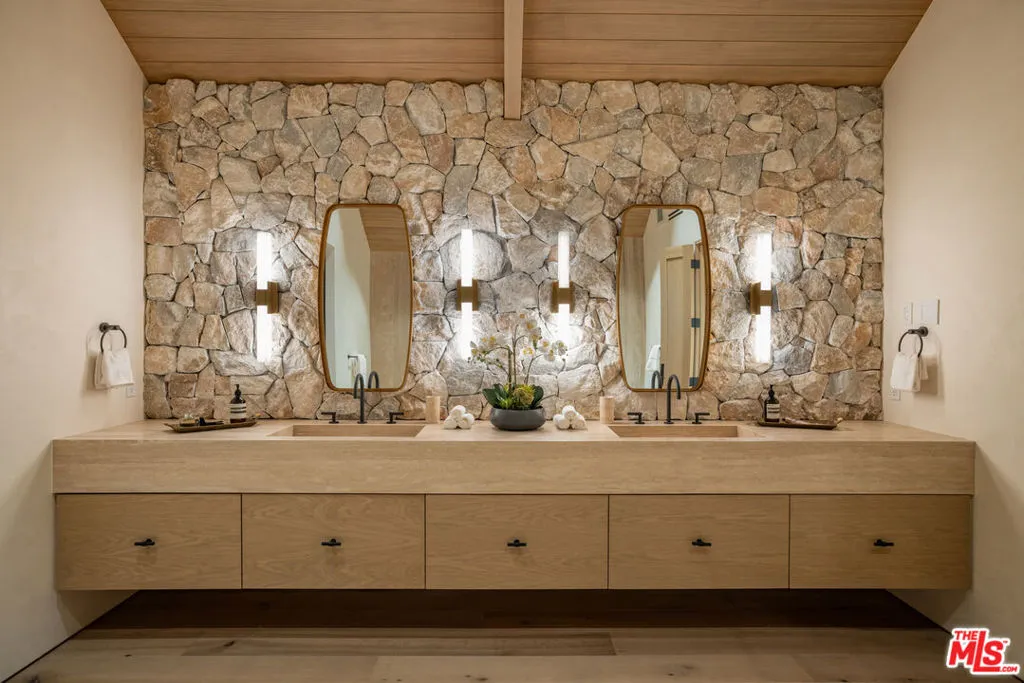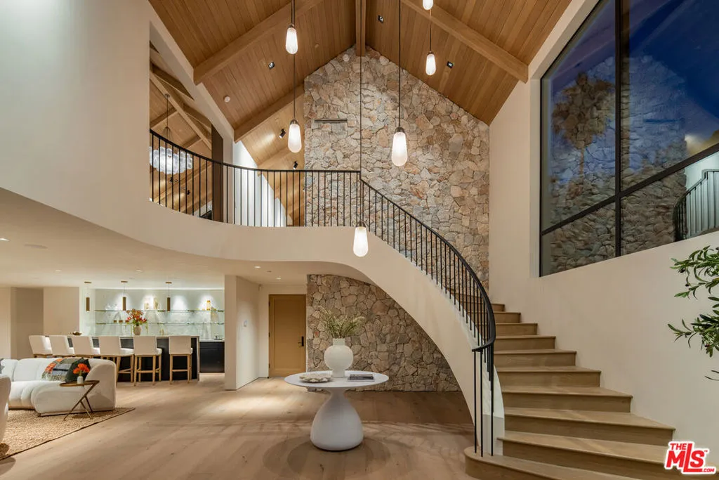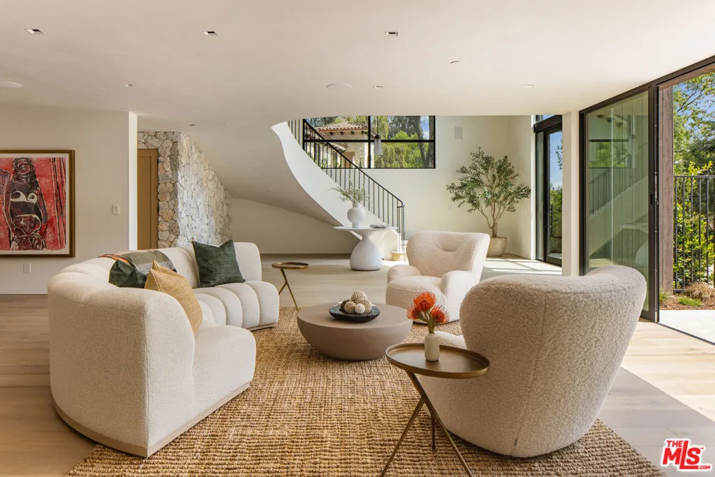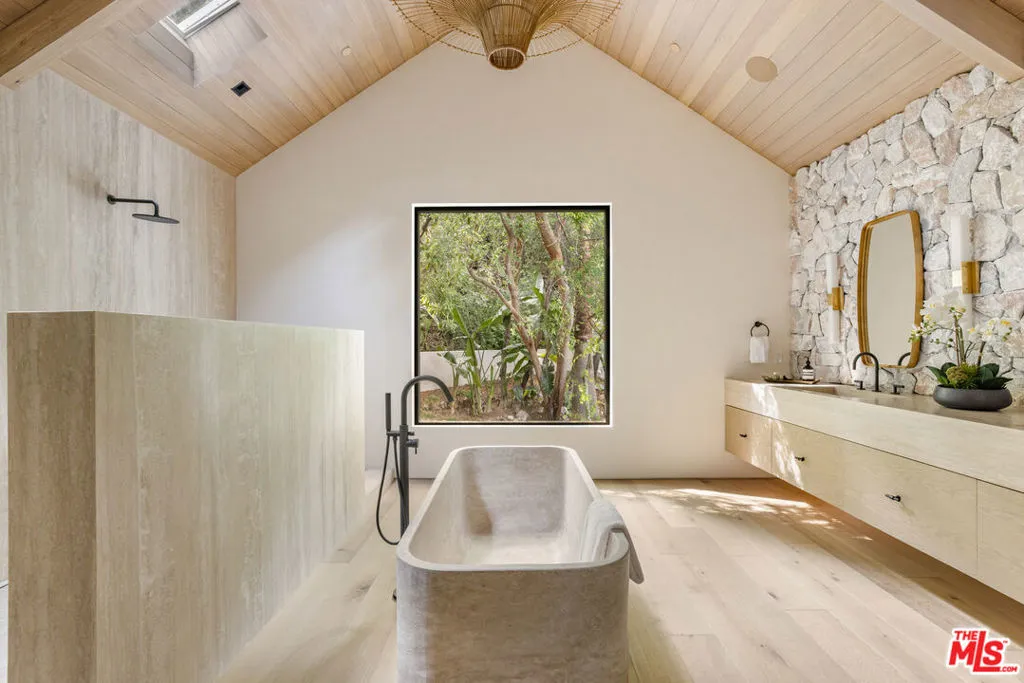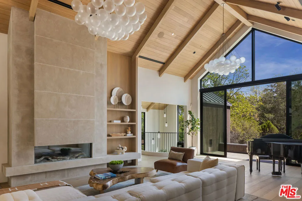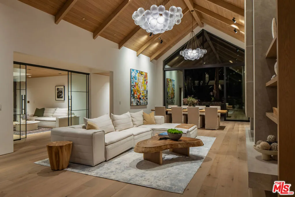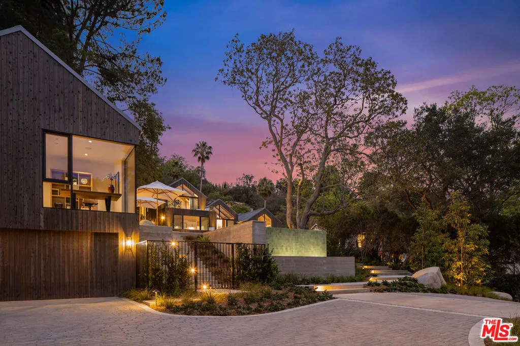 A once-in-a-generation California modern architectural compound spanning over a lushly landscaped acre where scale, design and privacy converge to achieve an extraordinary level of luxury & sophistication in a peaceful setting in the Studio City foothills. Conceived by Koffka/Phakos Design as a series of interconnected pavilions, the newly remodeled and expanded 9800+ SF main residence is defined by its soaring volumes, natural materials and an unwavering commitment to craftsmanship. Hemlock-clad vaulted ceilings, imported stone, designer tile, sculptural light fixtures and walls of glass create a dialogue between structure and setting, blurring the line between indoors and out at every turn. The main living spaces unfold with dramatic yet restrained elegance, conveying a sense of quiet sophistication, anchored by a showcase kitchen of exceptional scale featuring bespoke cabinetry, statement stone surfaces, top-of-the-line appliances and seamless access to multiple entertaining terraces supported by a fully appointed service kitchen. The primary suite is a sanctuary unto itself, positioned to capture treetop vistas and natural light, with a spa level bathroom clad in imported stone and anchored by a hand carved solid travertine soaking tub. Five en suite secondary bedrooms and the living areas throughout echo the same level of material integrity and architectural clarity. The lower-level lounge provides a dedicated environment for large-scale entertaining centered around a generous sunken conversation area featuring a 120-inch flat screen, seven-seat bar, dual powder rooms and a catering kitchen.A newly constructed detached guest house with kitchen, laundry, two bathrooms, sauna & steam shower provides flexibility for rejuvenation, fitness, or extended stays completing a compound that functions as both a private estate and a fully realized lifestyle environment.Fleetwood doors disappear to reveal a true resort environment outside where pool, spa, lounge areas and outdoor dining spaces are woven into the landscape with intention and ease. The grounds themselves are a defining feature expansive, layered, and remarkably private offering a sense of retreat seldom found within city limits. Mature landscaping, fire feature, terraced gardens, an outdoor kitchen with pizza oven, barbecue & bar plus a yoga platform tucked beneath a canopy of trees all create a series of distinct outdoor venues equally suited for grand entertaining and quiet, contemplative moments.Balancing form and function, the property integrates security, fire sprinkler & Crestron smart home systems throughout. Exterior construction features fire-rated DensGlass sheathing, Sho Sugi Ban siding from Nakamoto Forestry and a standing seam steel roof materials thoughtfully selected to enhance resiliency while preserving the home's architectural vision. As demand intensifies for compounds of this scale, design pedigree, and privacy in the Valley just moments from the studios & Ventura Boulevard with seamless access to the Westside this premier estate stands among the area's most significant offerings, where design, setting, and privacy align with the expectations of today's most discerning buyers.