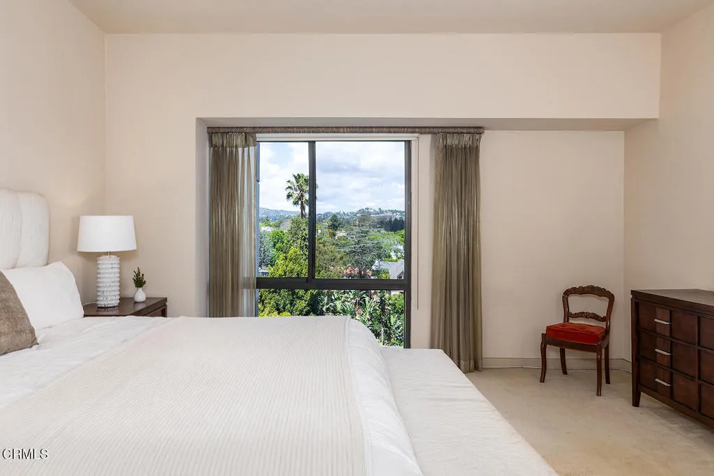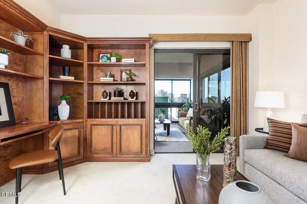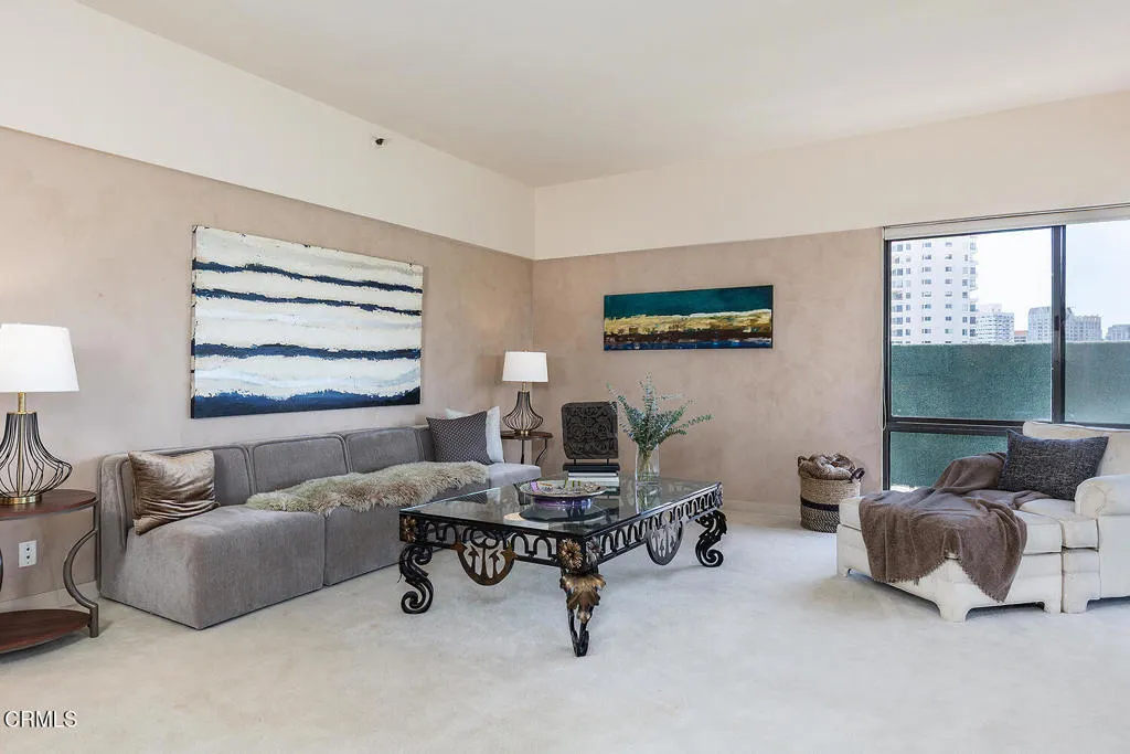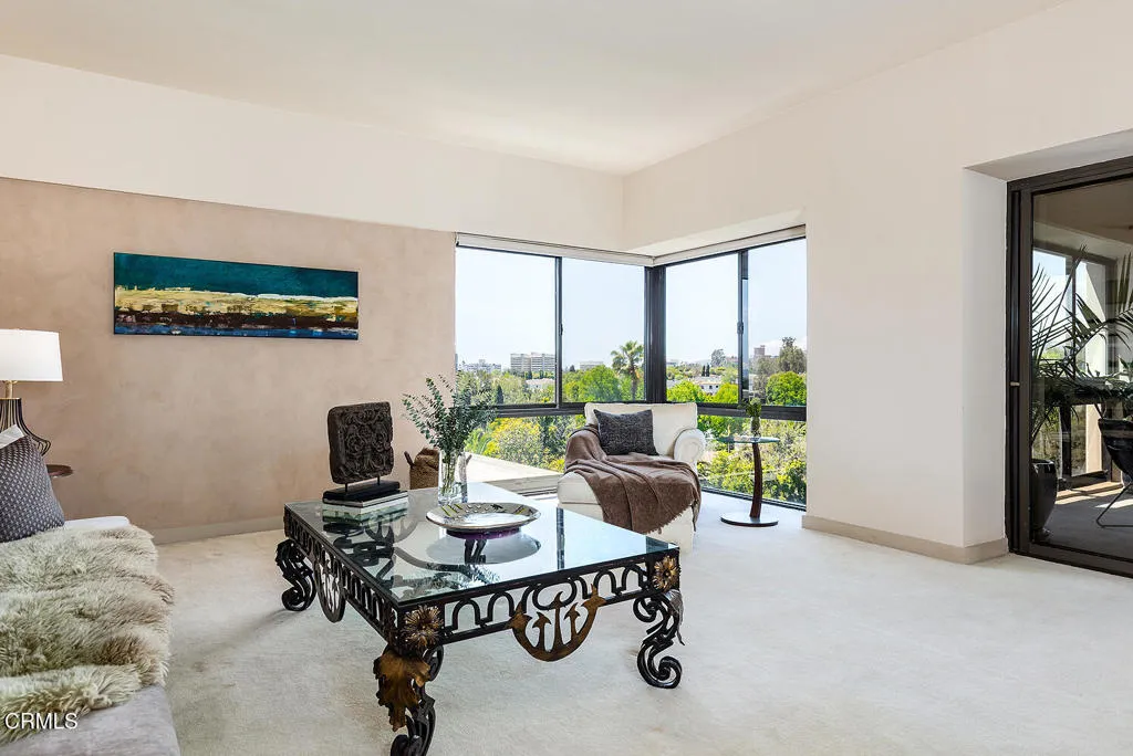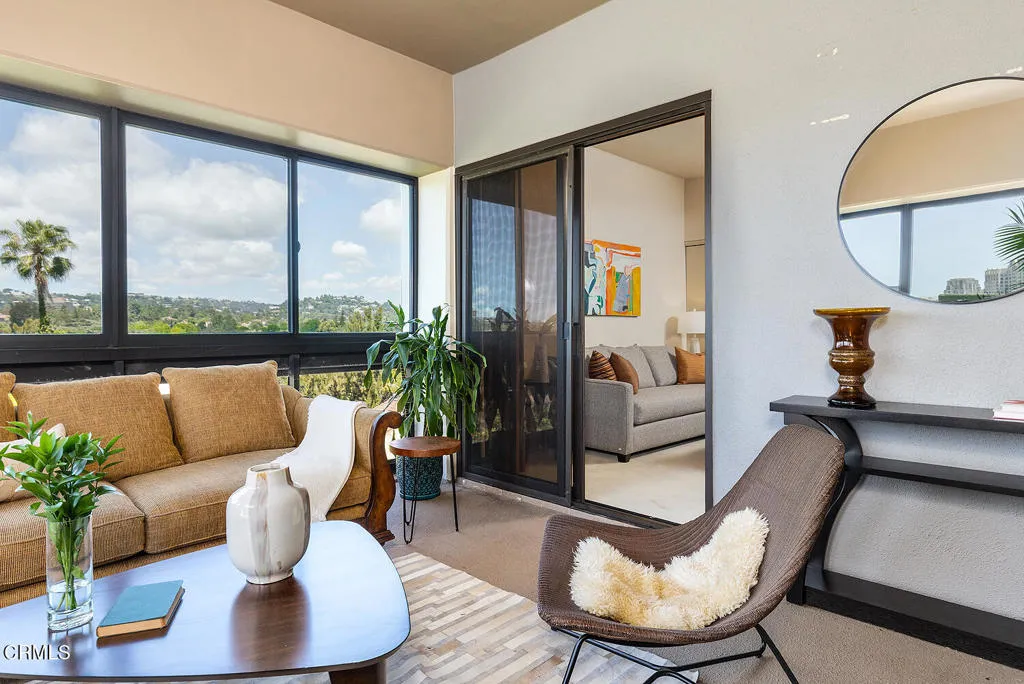 Experience refined high-rise living at The Grand on the Wilshire Corridor. This elegant 6th-floor corner unit residence offers 2 bedrooms and 2 baths across approximately 1,649 square feet, showcasing sweeping north-facing city views in one of Westwood's most coveted full-service buildings near Beverly Hills, UCLA, and Century City. Unit 604's double front doors open to reveal a grand entry hall, with Italian Venetian plaster walls and stone floors introducing this home defined by sophistication and understated luxury. The expansive living and dining areas are framed by dramatic corner windows that meet seamlessly, bathing the interiors in natural light and capturing panoramic skyline vistas. Soft lime-washed walls add warmth and texture, while an enclosed balcony serves as a tranquil extension of the living space: perfect for taking in breathtaking vistas that stretch across the city and extend westward. Here magnificent views unfold into the distance, offering a constantly shifting backdrop from day to night. A stylish wet bar just off the living room, complete with glass shelving, adds a refined touch for entertaining. The kitchen flows effortlessly into the main living area and features a sleek black stone countertop, creating an ideal setting for both intimate living and stylish gatherings. Enhancing year-round comfort and efficiency, the home has been thoughtfully upgraded with a just-installed HVAC system. The primary suite is a serene retreat with generous storage and a spa-inspired bath featuring a marble countertop with dual sinks, complemented by a versatile secondary bedroom and well-appointed guest bath. Built in 1980, The Grand is distinguished by its architectural presence and enduring quality. Residents are welcomed through a striking marble-clad lobby and enjoy a collection of refined amenities including 24-hour concierge and valet service, a fitness center, heated pool and spa, sun deck, and elegant resident lounges. Offering privacy, service, and timeless design, The Grand delivers a truly elevated Los Angeles lifestyle.