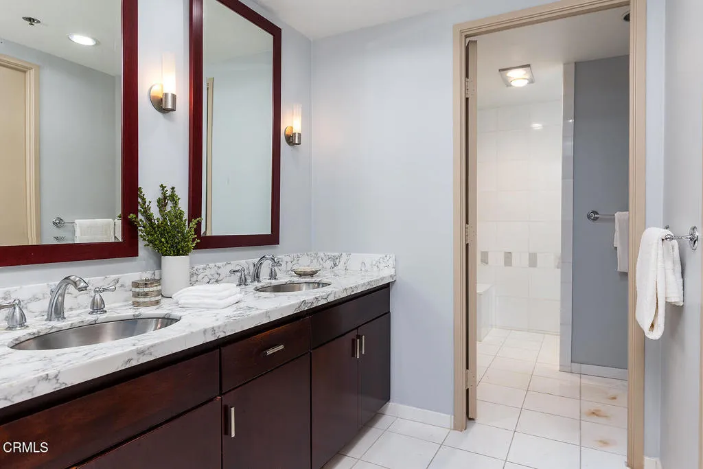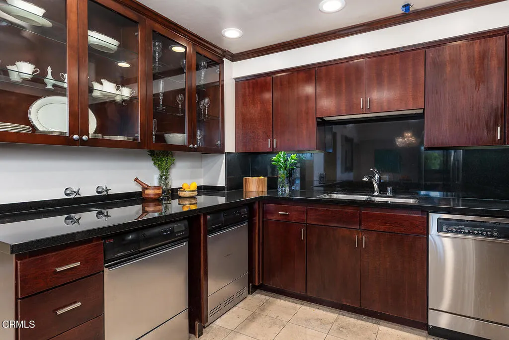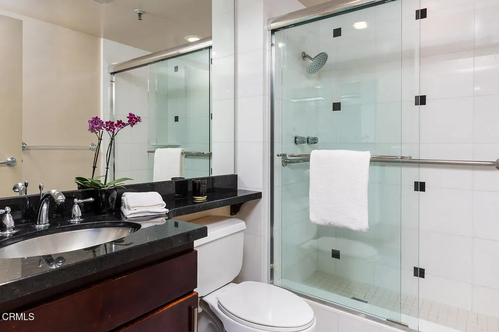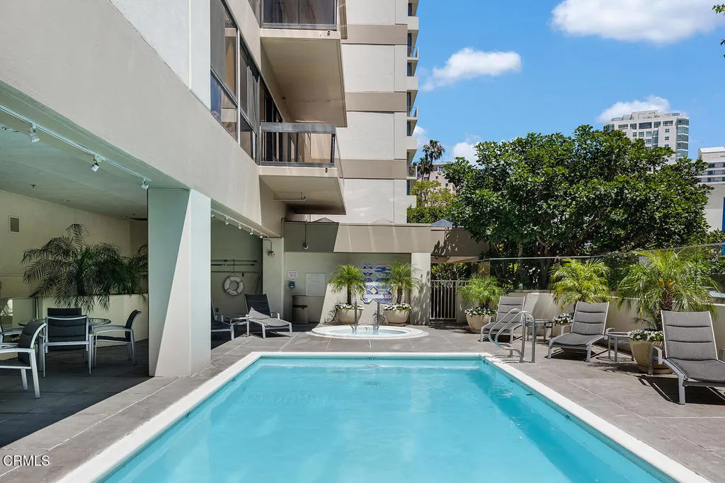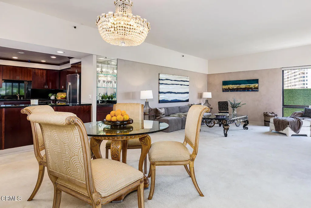 Experience refined high-rise living at The Grand on the Wilshire Corridor. This elegant 6th-floor corner unit residence offers 2 bedrooms and 2 baths across approximately 1,649 square feet, showcasing sweeping north-facing city views in one of Westwood's most coveted full-service buildings near Beverly Hills, UCLA, and Century City. Unit 604's double front doors open to reveal a grand entry hall, with Italian Venetian plaster walls and stone floors introducing this home defined by sophistication and understated luxury. The expansive living and dining areas are framed by dramatic corner windows that meet seamlessly, bathing the interiors in natural light and capturing panoramic skyline vistas. Soft lime-washed walls add warmth and texture, while an enclosed balcony serves as a tranquil extension of the living space: perfect for taking in breathtaking vistas that stretch across the city and extend westward. Here magnificent views unfold into the distance, offering a constantly shifting backdrop from day to night. A stylish wet bar just off the living room, complete with glass shelving, adds a refined touch for entertaining. The kitchen flows effortlessly into the main living area and features a sleek black stone countertop, creating an ideal setting for both intimate living and stylish gatherings. Enhancing year-round comfort and efficiency, the home has been thoughtfully upgraded with a just-installed HVAC system. The primary suite is a serene retreat with generous storage and a spa-inspired bath featuring a marble countertop with dual sinks, complemented by a versatile secondary bedroom and well-appointed guest bath. Built in 1980, The Grand is distinguished by its architectural presence and enduring quality. Residents are welcomed through a striking marble-clad lobby and enjoy a collection of refined amenities including 24-hour concierge and valet service, a fitness center, heated pool and spa, sun deck, and elegant resident lounges. Offering privacy, service, and timeless design, The Grand delivers a truly elevated Los Angeles lifestyle.