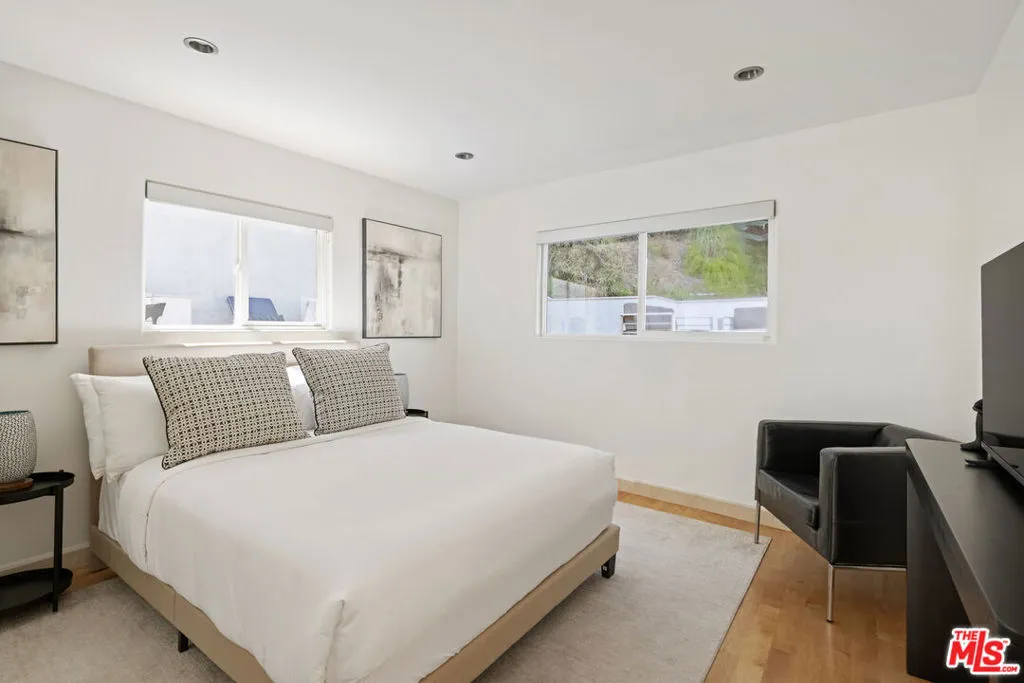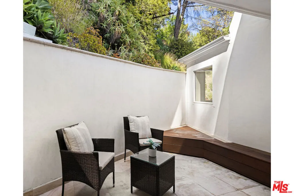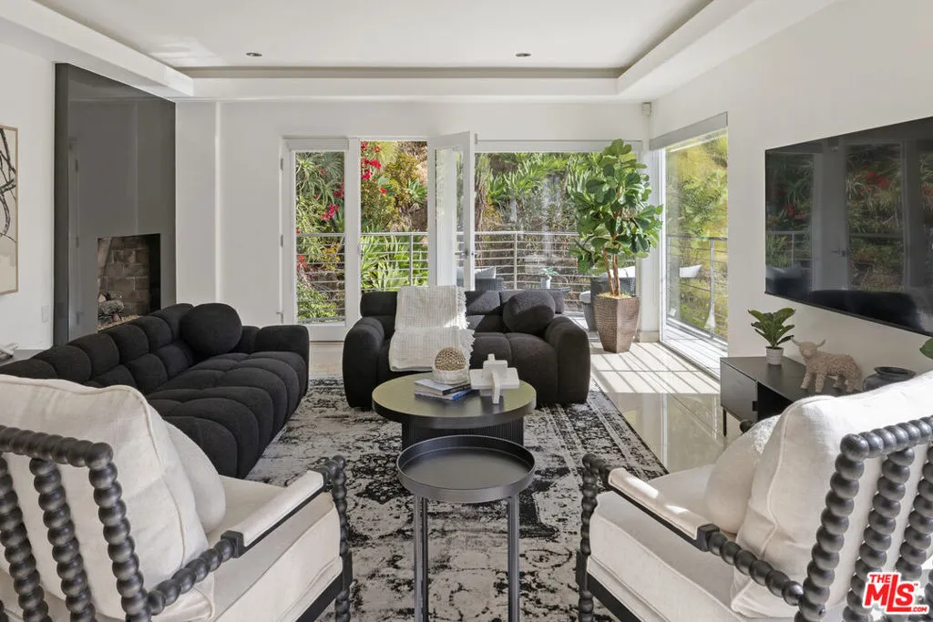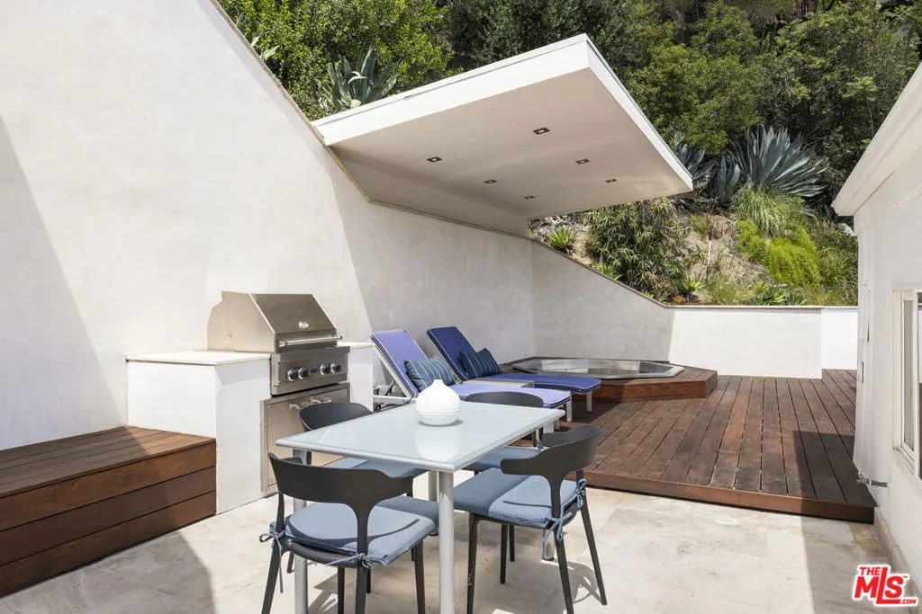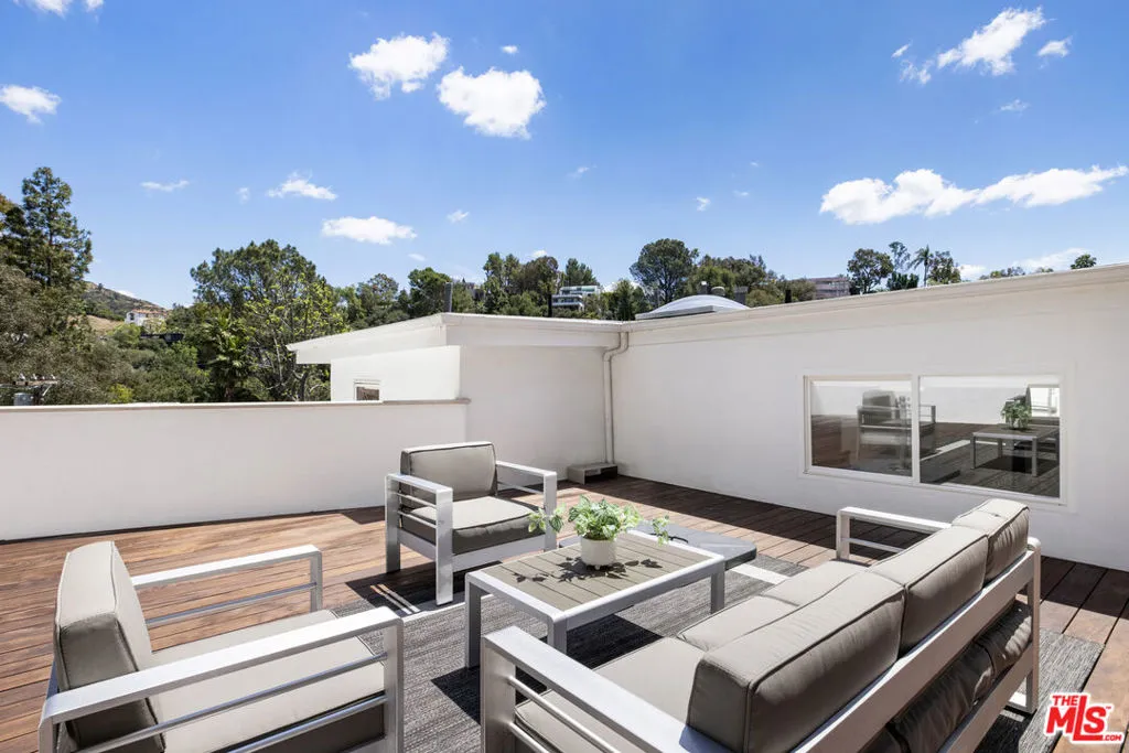 Right under the iconic Hollywood Sign and elevated above the street, this striking modern retreat in Beachwood Canyon is the epitome of Southern California living. This 3-bed, 2-bath home has been tastefully upgraded and offers functionality, sophistication and privacy. A gated secured entry leads to an open concept main floor inviting an abundance of natural light and beautiful canyon vistas. The sunken living room has a modern fireplace and multiple French doors that overlook a peaceful setting. The immaculate contemporary design continues in the dining area and kitchen where dark quartz countertops contrast beautifully with the custom cabinetry, top of the line appliances, and generous counter space with a breakfast bar ideal for culinary enthusiasts and effortless entertaining. The living space extends outdoors to a series of charming decks and terraces. An oversized Brazilian wood rooftop deck is perfect for lounging, dining under the stars, large or intimate gatherings, and the ideal spot for your morning coffee or to recharge after a busy day. For your own spa experience, a perfectly positioned hot tub will melt your stress away. The 3 bedrooms are generously sized, with the primary suite featuring luxurious finishes, a spa-inspired bathroom with walk-in shower and soaking tub, and generous closet space. A second bathroom, a separate laundry room, and ample covered parking complete this architectural home. Beautiful stone and wood flooring throughout elevate everyday living with style. Beachwood Village, Griffith Park trails, Hollywood and Iconic landmarks are just minutes away. This peaceful Hollywood Hills residence offers a grand lifestyle in one of Los Angeles's most storied neighborhoods.