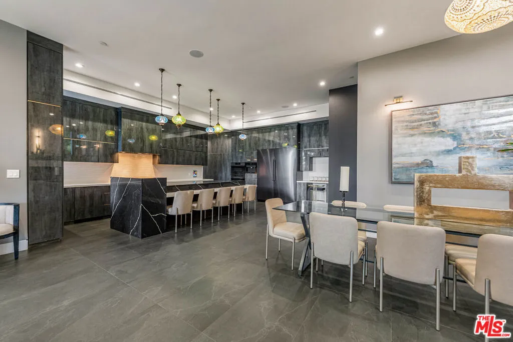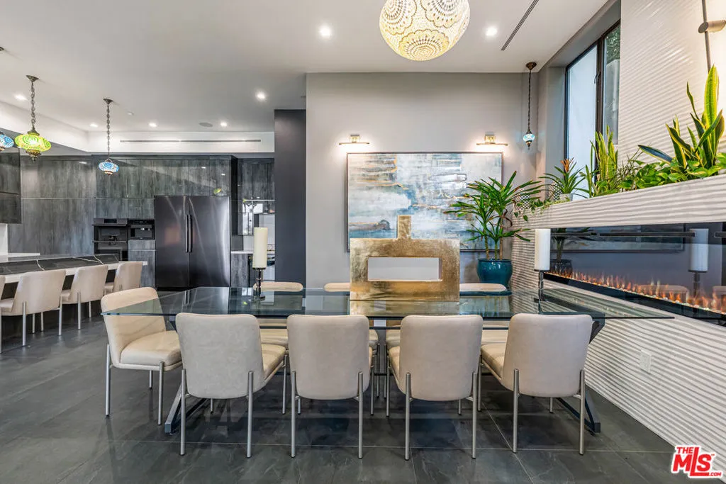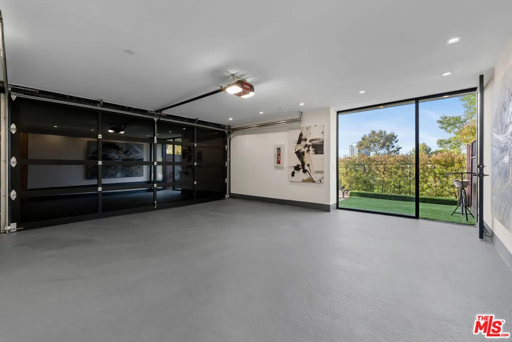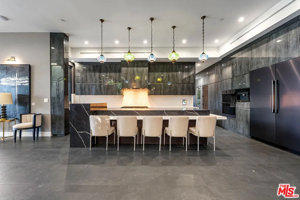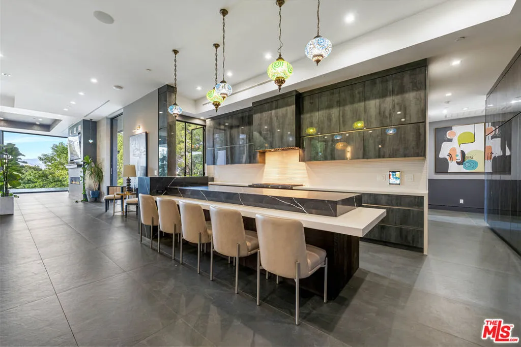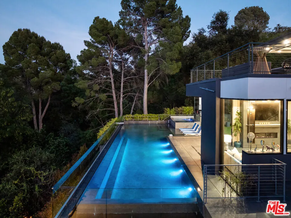 A spectacular gated compound retreat situated on a quiet cul-de-sac above the prestigious Hollywood Hills, the "Skyline Estate" is a newly constructed 6-bedroom, 7-bath designer residence by Alon Zakoot, offering approximately 5,700 square feet of cool, modern design with refined European finishes. A long private driveway leads to this stunning entertainer's estate which boasts sweeping panoramic views spanning the city skyline, mountains, and iconic landmarks including Universal Studios with its Harry Potter castle and the Hollywood Sign. A dramatic double-height entry introduces the home, flowing into expansive open-concept living spaces designed for seamless indoor-outdoor living. The living room is defined by a striking seamless corner of retractable glass doors, opening completely to frame sweeping views and connect directly to the impressive infinity-edge pool. The chef's kitchen is appointed with premium Dacor appliances, a waterfall island, wine refrigeration, and a built-in Miele espresso system, complemented by custom cabinetry and imported Moroccan lighting. Select Venetian plaster walls add subtle texture and depth throughout the interiors. The upper level is anchored by the primary suite, featuring dual walk-in closets plus an additional third closet, a wraparound private balcony, and a spa-inspired bath with dual vanities, a spacious jetted tub, rain shower, and an indoor-outdoor shower. Two additional bedroom suites offer sliding walls of retractable glass that open to a patio with outdoor lounge seating. An upstairs family room with a generous terrace and fire pit provides an ideal setting for taking in sweeping city views or catching some fireworks from Universal Studios. Outdoor spaces are designed for both scale and comfort, highlighted by a 65-foot infinity-edge pool with Baja shelf seating, an oversized spa, multiple lounge areas, and a rooftop deck with outdoor kitchen and fire pit. Additional features include a fully integrated smart home system controlled via iPad, Sonos surround sound, a comprehensive security system with cameras, elevator access, an impressive outdoor entertaining space with built-in projector, a basketball hoop for sport court-style recreation, and multiple terraces. On-site parking for up to 10 cars, along with a separate legal ADU/guest quarters, completes the property. Ideally located just minutes from major studios, hiking trails, and the best of Hollywood, this residence embodies elevated California living.