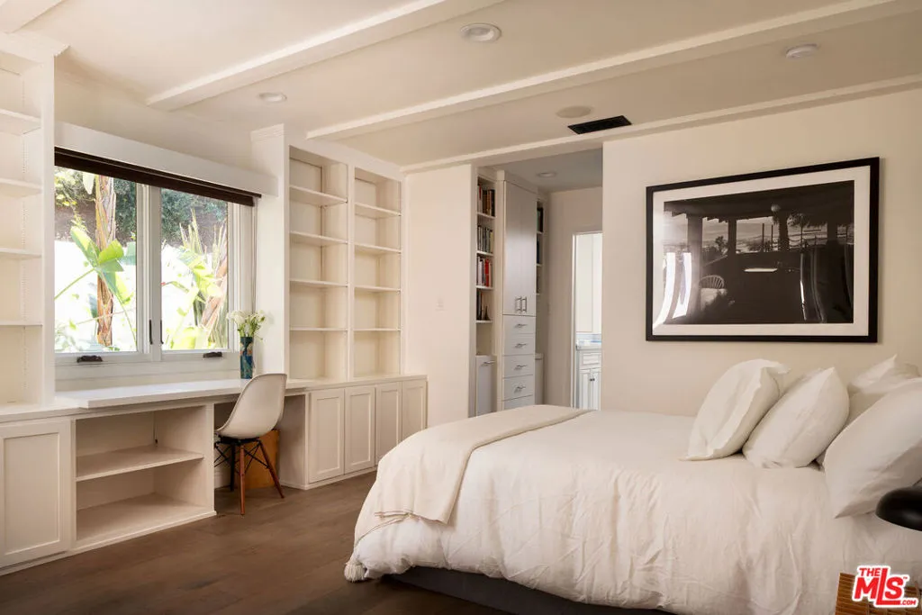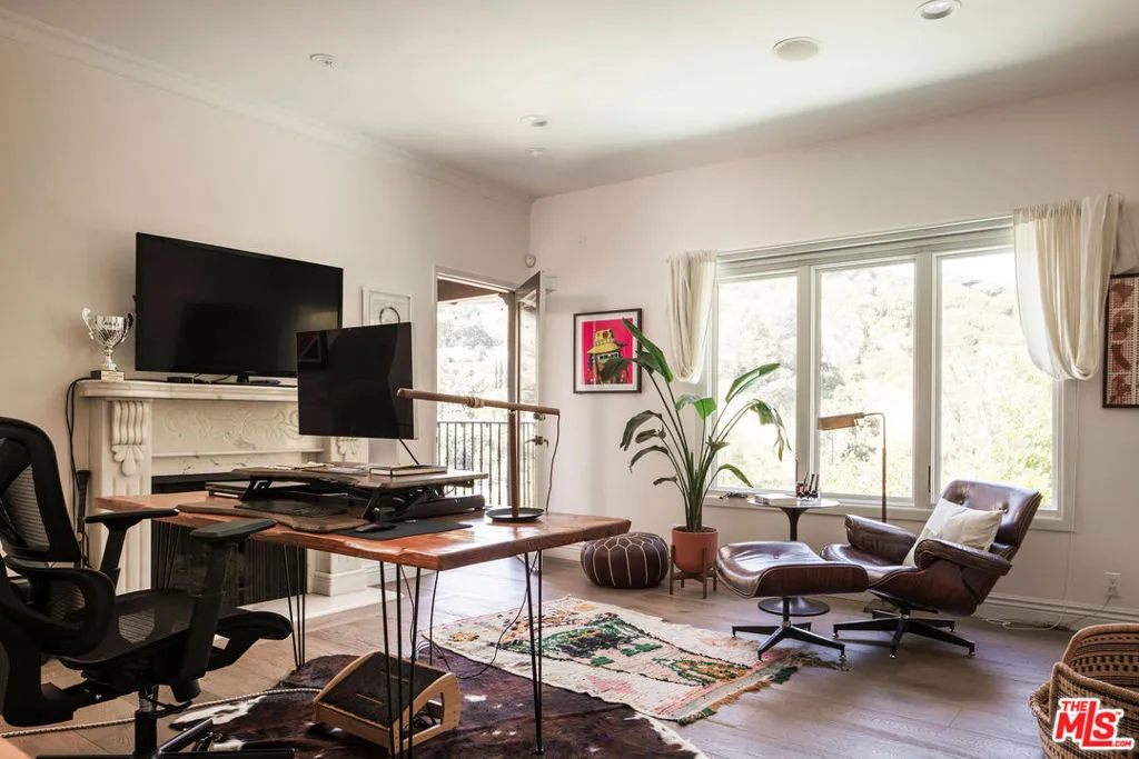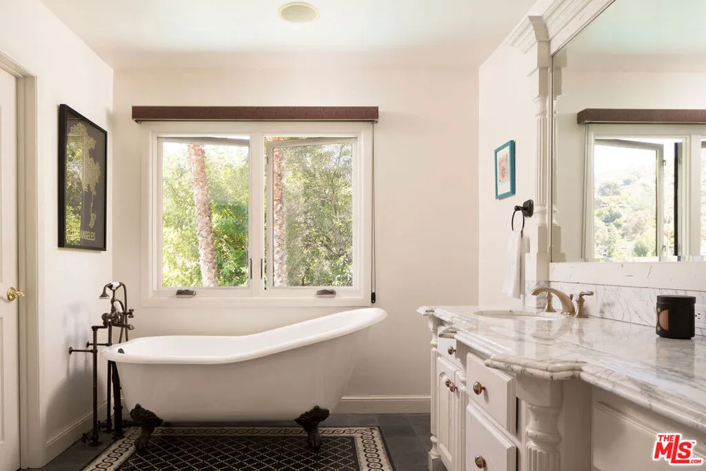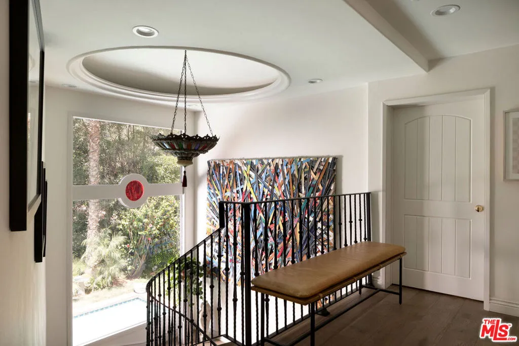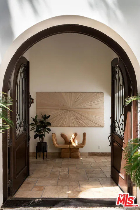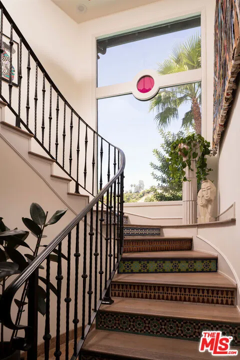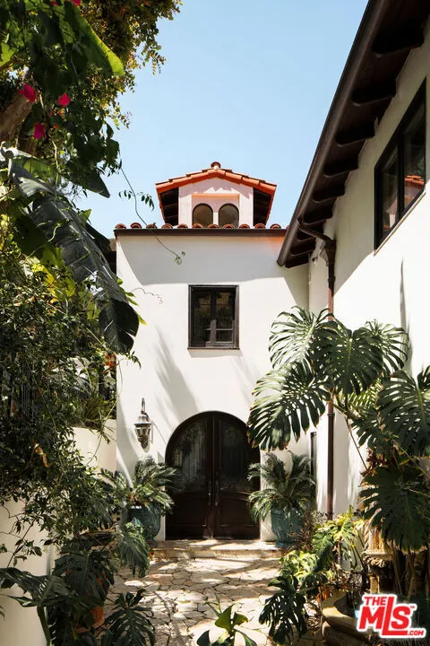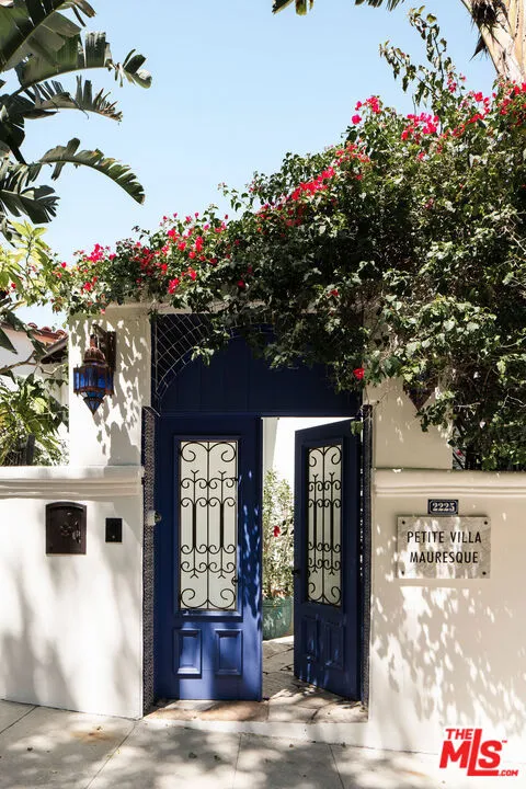 HOLLYWOOD HILLS EST. 1954 - Petite Villa Mauresque - A Moroccan-inspired sanctuary above the city. There are places you discover on your travels that never quite let go ... tucked down an unmarked street, glimpsed through an archway, felt before you fully understand them. Petite Villa Mauresque is that place. Built in 1954 with an almost obsessive attention to detail, it has the rare quality of feeling elevated, inspiring and utterly welcoming. It begins at street level, where glass fronted double doors framed by zellige tiles, open onto a private world. A lush courtyard spills over with color and drama from the vibrant bougainvillea to the fountain surrounded by monstera plants, all made more magic by the dappled light through the trees above. Arched doors wait at the far end of the courtyard and as you push through them, you're greeted by a double height entryway with another fountain that immediately lets you know that you've stumbled into something special. Past the fountain, through the foyer, you see the light flooding in from the floor to ceiling windows that retract entirely, dissolving the line between inside and out, and the canyon opens up before you. The living room and kitchen coexist warmly, seamlessly. The kitchen island stretches wide, framing a view of the pool and the canyon beyond even the mundane act of cooking is elevated here. Outside, a verdant grass yard runs to the edge of the pool, mere steps from the living room. A stone-clad courtyard with a built-in outdoor kitchen invites long dinners under the night sky. A standalone, vibrantly tiled fireplace anchors the view, perfectly framing the canyon that unfolds behind it. A sport court in the corner of the property completes the grounds. A private guest suite with an ensuite bath sits discretely on the man floor. The french doors of the elegant dining room open on two sides to the courtyard. The room feels equally at home for a candlelit dinner or a slow Sunday morning. The polo inspired lounge off the foyer is where the home reveals its most theatrical self. Another elegantly tiled fireplace, doors leading to the outside, a space designed for lingering. Through a separate door, you'll find a temperature controlled wine cellar capable of storing a formidable collection. The curved stairway, intricate with tile work, rises past an oversized stained glass window that looks out onto the pool, and whose geometry and color stop you mid-step. Upstairs you'll find dual primary suites, each with their own balcony and fireplace. The eastern primary is extraordinary: light enters from every direction, clerestory windows adorn the raised ceiling above a separate seating area that makes the space feel more like a private hotel suite than a bedroom. The bath, tucked into its own nook, is positioned beside a large picture window that frames the canyon like a painting. A separate steam shower features stained glass windows that casts a wash of ethereal pink light. Two additional generously sized bedrooms with ensuite bathrooms, along with a laundry room, round out the upper floor. Set high in the Hollywood Hills, this estate offers true privacy the city's energy reduced to a distant hum, visible but untouchable. And yet everything that Hollywood has to offer lies just minutes away. Some homes are beautiful. Petite Villa Mauresque is unforgettable.