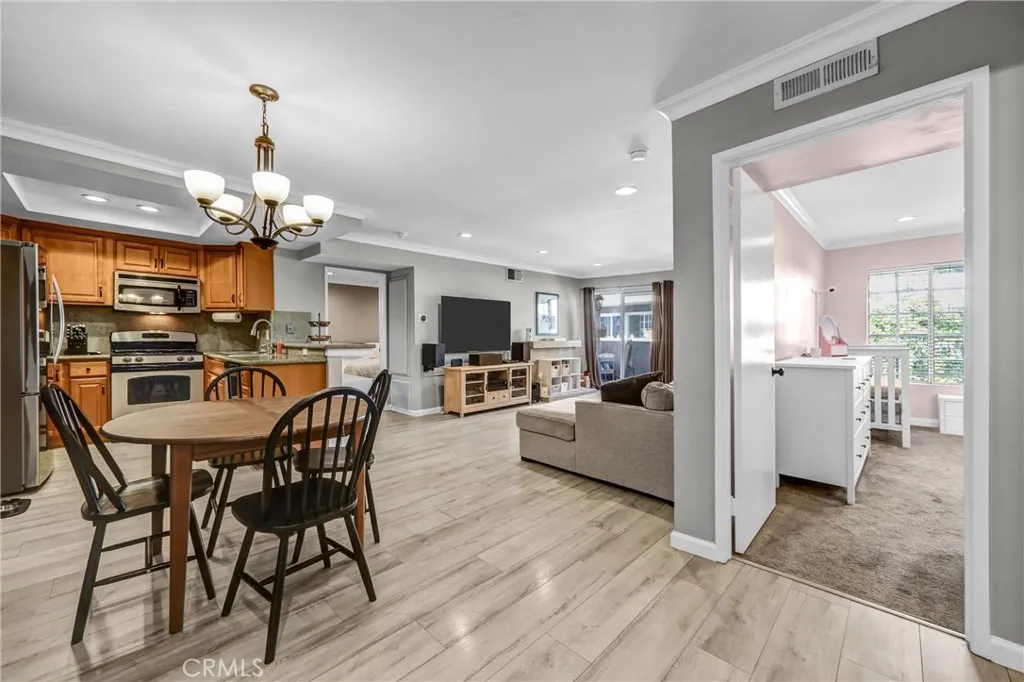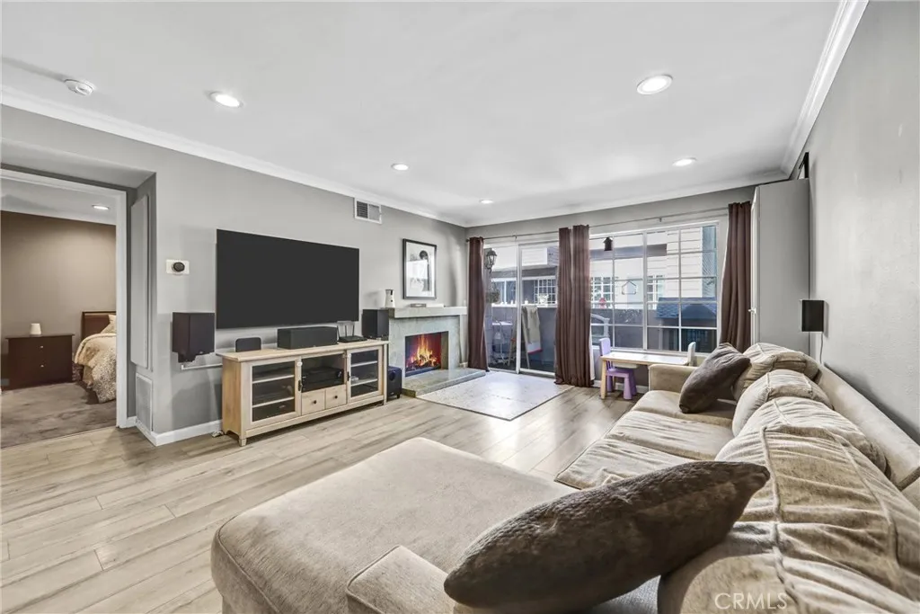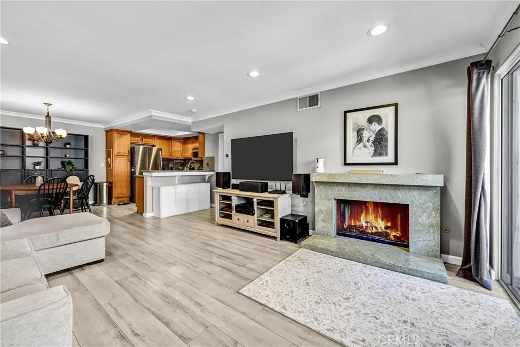 Light, bright, and inviting, this beautifully maintained 1,021 sq. ft. condo is located in the highly sought-after Keswick Villas community. The spacious layout features two large bedrooms, including a primary suite with its own ensuite bathroom, while the secondary bedroom is conveniently located next to a full bathroom; ideal for guests or family. The fully equipped kitchen offers stainless steel appliances, modern cabinetry, and upgraded countertops. Notably, the dishwasher, refrigerator, washer, dryer, and central A/C have all been replaced within the last six years, adding valuable modern updates throughout the home. Additional highlights include wood-like laminate flooring in the living room, recessed lighting throughout, and a full-sized laundry room inside the unit with built-in shelving and a linen closet. The unit also includes two assigned tandem parking spaces. Step outside to your private balcony overlooking the community, or go downstairs and enjoy resort-style amenities including a sparkling pool and in-ground spa. Ideally situated on a charming tree-lined street, this home is just moments from shopping, dining, and everyday conveniences. Please note: The owner believes the fireplace is in working condition but has never personally used it, and all images featuring the fireplace have been digitally enhanced.