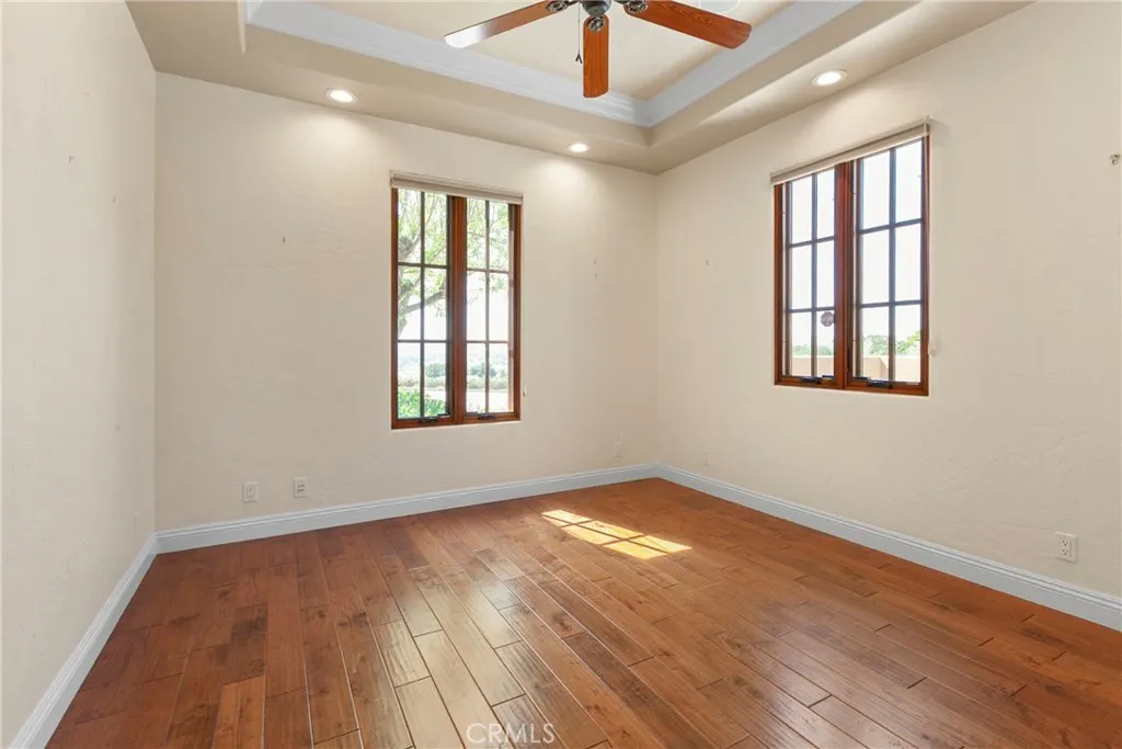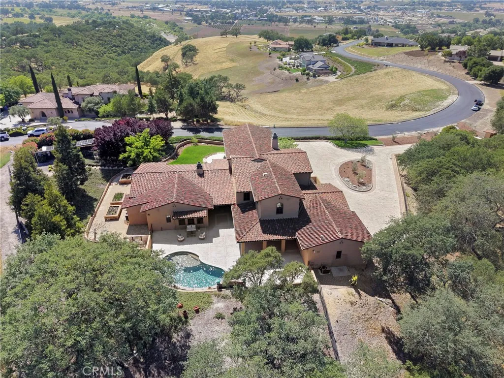 Set behind the gates of Santa Ysabel Ranch Estates, this nearly 5,000± sq. ft. residence embodies timeless Mediterranean-inspired architecture, blending refined craftsmanship with elegant, old-world character. The entry opens to a grand foyer introducing soaring ceilings, graceful archways, and rich architectural detailing throughout. The main living space is truly extraordinary, evoking the feel of a European palazzo. With its expansive proportions, soaring ceilings, and striking architectural details, it offers a sense of volume and elegance rarely found in residential homes—perfect for both everyday living and large-scale entertaining. Travertine flooring, exposed wood beams, and a statement fireplace, while a dramatic arched window frames picturesque views and some of the most amazing sunsets. The floor plan flows effortlessly from the living area to a formal dining room with a built-in bar, and into a well-appointed chef’s kitchen. The kitchen features premium appliances, including a 6-burner Viking range with pot filler, Sub-Zero refrigeration, a warming drawer, and custom cabinetry complemented by granite countertops and a generous center island with prep sink. The main level also includes a private office, powder room, laundry room, and an elegant primary suite retreat. The spacious primary suite offers vaulted ceilings, a fireplace, and tranquil views, along with a spa-inspired bathroom complete with dual vanities, soaking tub, custom walk-in shower, and expansive dual walk-in closets. Upstairs, two well-appointed guest suites provide comfort and privacy, including one featuring a charming Romeo and Juliet balcony overlooking the front grounds. Outdoor living features a solar-heated pool, custom water feature, and a detached casita with private entrance and en-suite bath—ideal for guests or extended stays. The grounds are thoughtfully designed with a textured concrete patio, ambient lighting, raised garden beds, and mature landscaping that complements the home’s Mediterranean aesthetic. Additional features include four HVAC systems, a three-car garage with upgraded flooring, and abundant storage, along with an additional storage room/workshop adjacent to the garage. Residents of Santa Ysabel Ranch Estates enjoy the benefits of one of the area’s most exclusive communities, offering a gated setting with 24/7 security, scenic walking trails, tennis courts, and a serene, private environment just minutes from town.