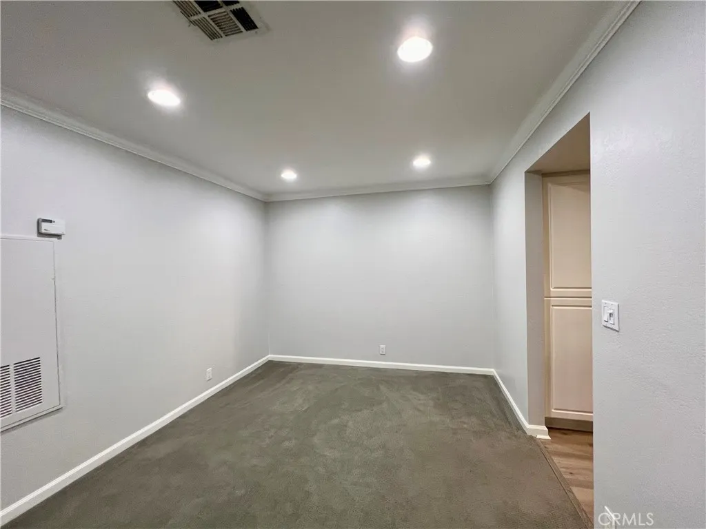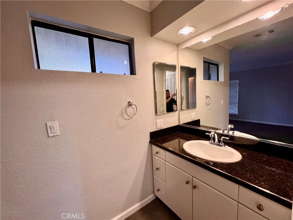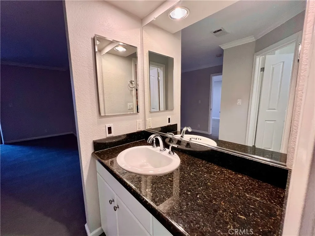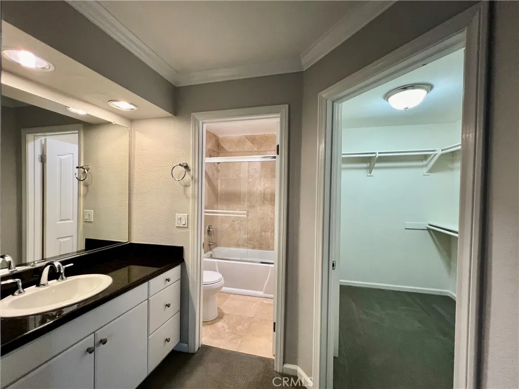 Beautiful and spacious 2-bedroom, 2-bath gated condo located in the desirable Bella Tierra community of Laguna Hills. Conveniently close to schools, parks, shopping, freeways, and toll roads. This inviting home features newer plush carpet in the living room, dining room, and both bedrooms, along with laminate flooring in the entry, kitchen, and bathrooms. The extra-large primary suite offers a sliding door to the patio, walk-in closet, and private remodeled bathroom with granite countertops. The second bedroom also features its own private remodeled bathroom with granite countertops, walk-in closet, and patio slider. The living and dining areas showcase crown molding, a ceiling fan, and a cozy fireplace with mantel. Enjoy the oversized private balcony off the living room, perfect for relaxing in the fresh air and afternoon sun. The kitchen includes stainless steel appliances and granite countertops. Full-size washer and dryer are conveniently located in the balcony laundry closet. A huge private lockable storage space adjacent to the front door is included. Washer, dryer, and refrigerator are included. No pets allowed.