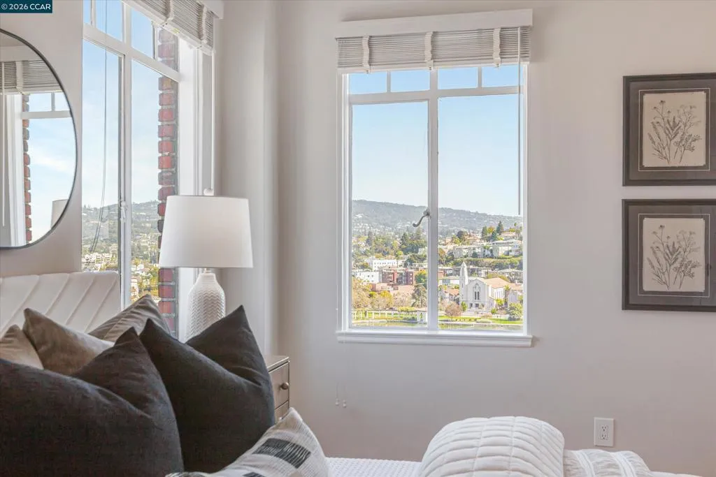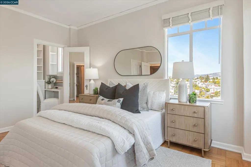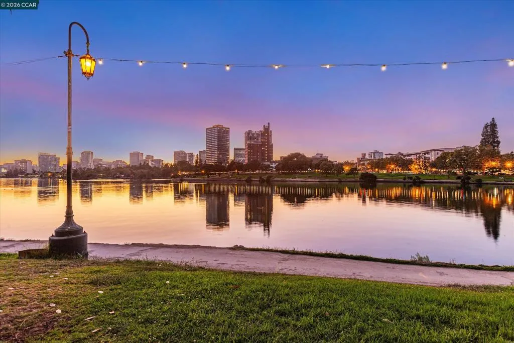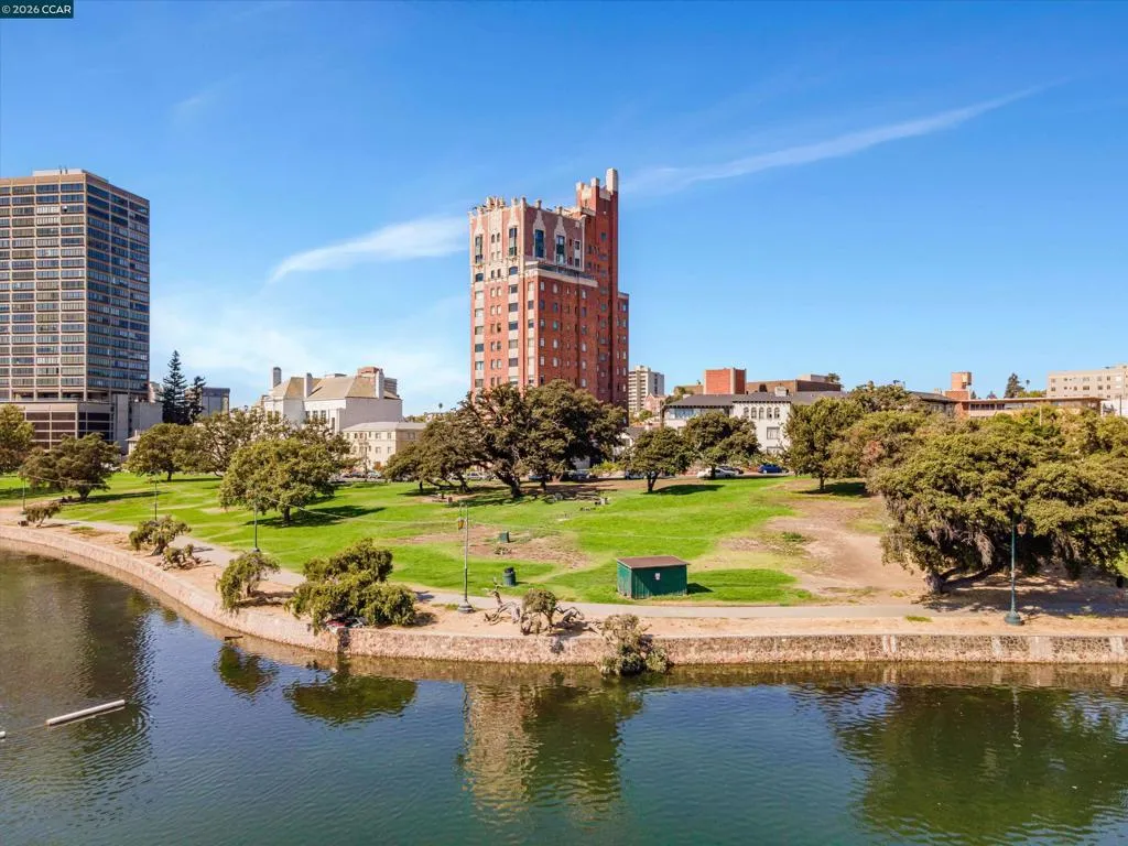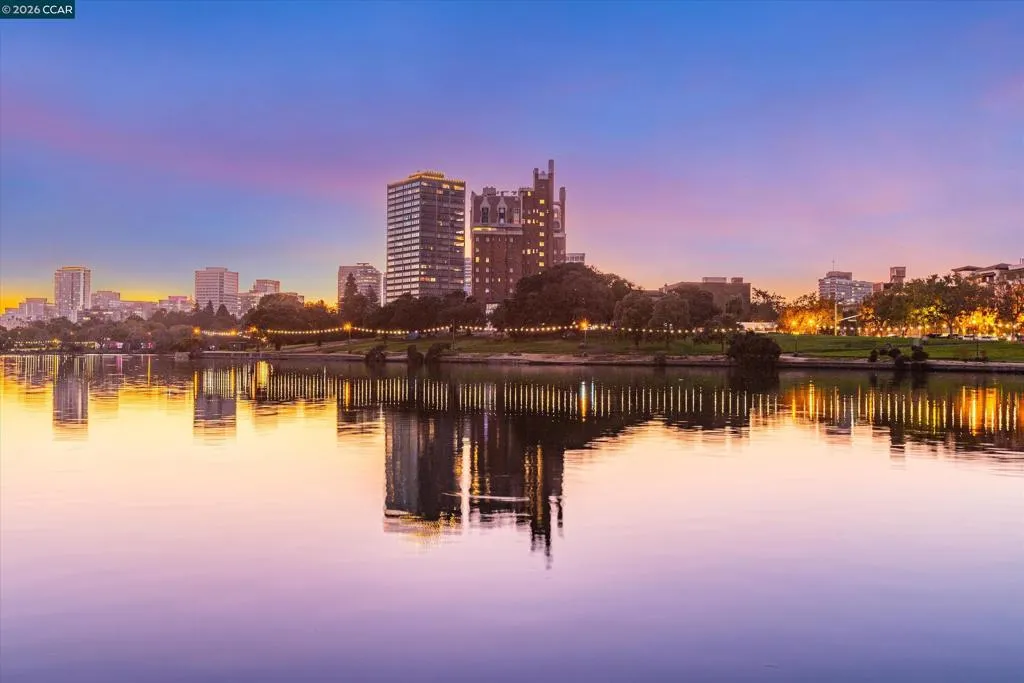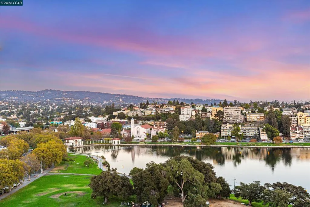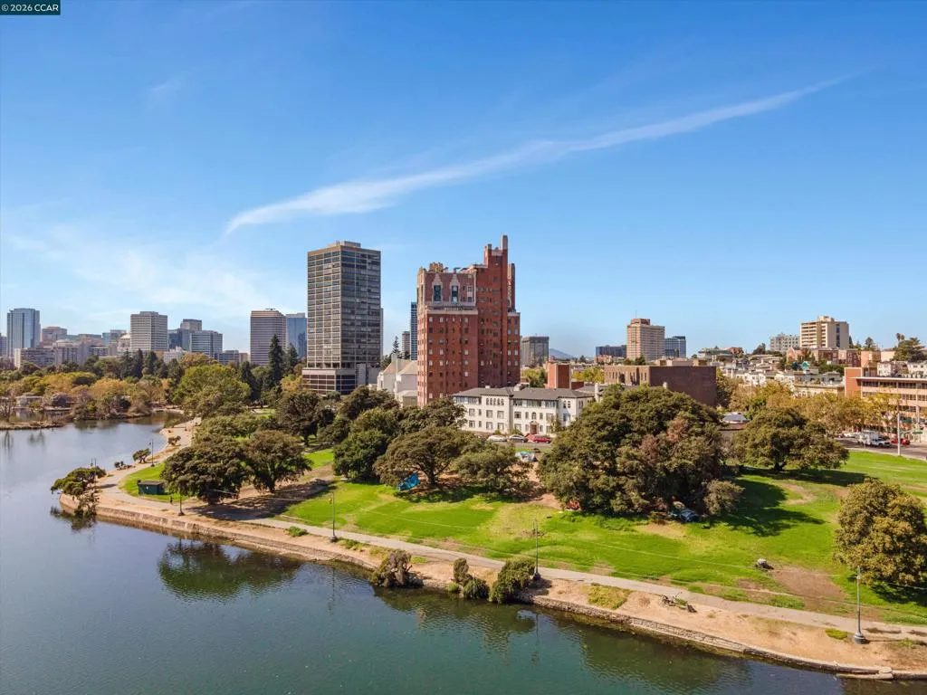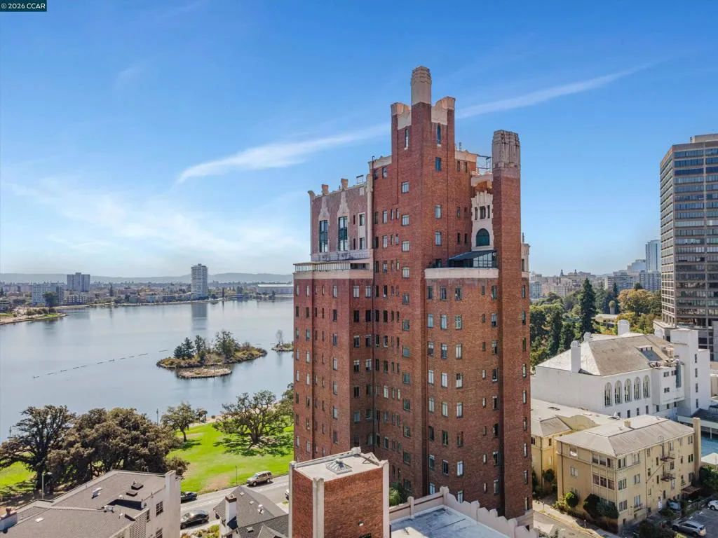 Welcome to the iconic Bellevue-Staten—an architectural gem designed by renowned architect Herman C. Baumann in timeless Art Deco style. Completed in 1929, this historic landmark has long been a defining presence on Oakland’s skyline. This gracious corner residence captures sweeping views of Lake Merritt, the surrounding park, vibrant downtown lights, and the rolling Oakland hills. Expansive living spaces offer the perfect balance of comfort and sophistication, ideal for both everyday living and entertaining. The beautifully renovated Scandinavian-style kitchen features stainless steel appliances, sleek slab countertops, generous cabinetry, and a charming coffee nook—perfect for enjoying morning light and serene views. The light-filled bedroom showcases stunning city and lake vistas and includes two closets, one thoughtfully designed with custom organizers. A fully upgraded bathroom offers a spa-like feel with a walk-in shower, textured tile, and heated floors. Throughout the home, timeless details such as vintage crown molding, parquet wood floors, built-in cabinetry, arched doorways, and soaring 9-foot ceilings add warmth and character. Residents enjoy full-service amenities including a 24-hour doorman, valet service, secure package handling, internet, utilities, and laundry—all covered by the HOA. With an exceptional 96 Walk Score, you’re just moments from dining, shopping, entertainment, the Farmers Market, Children's Fairyland, Lakeside Park Garden Center, museums, and downtown Oakland. Listed on the National Register of Historic Places and benefiting from the Mills Act, this home offers the rare advantage of reduced property taxes—an exceptional opportunity to own a piece of Oakland history. Views: Downtown