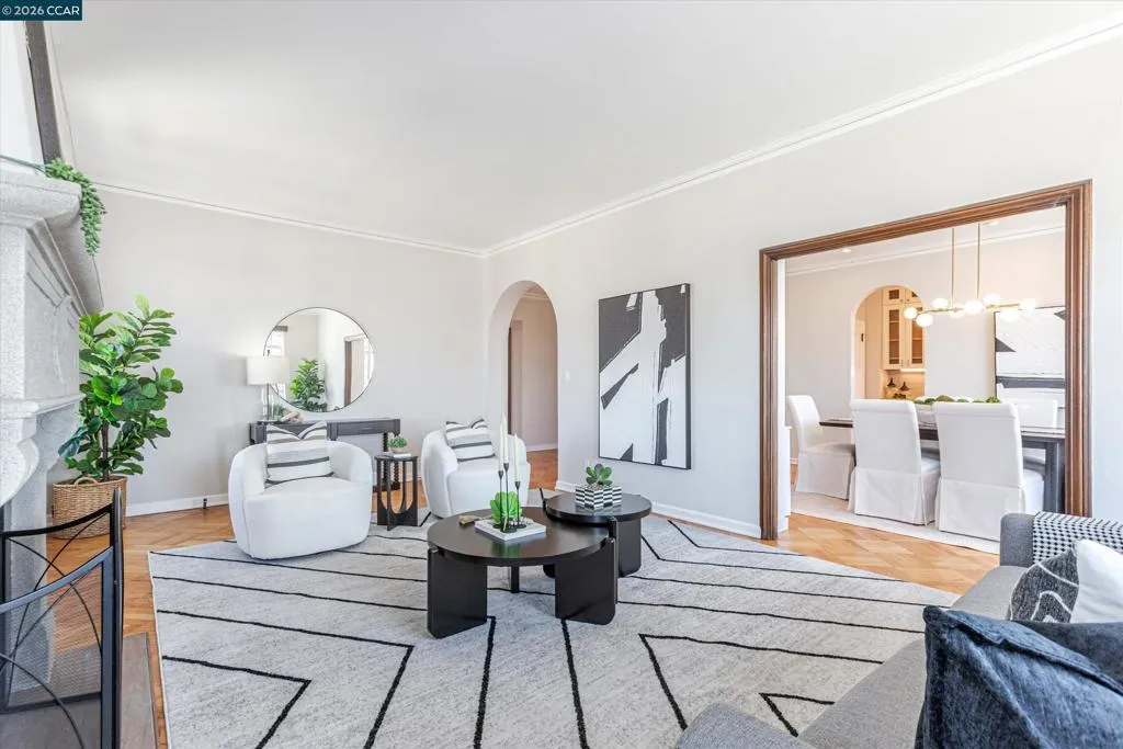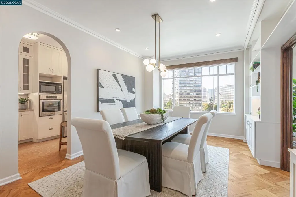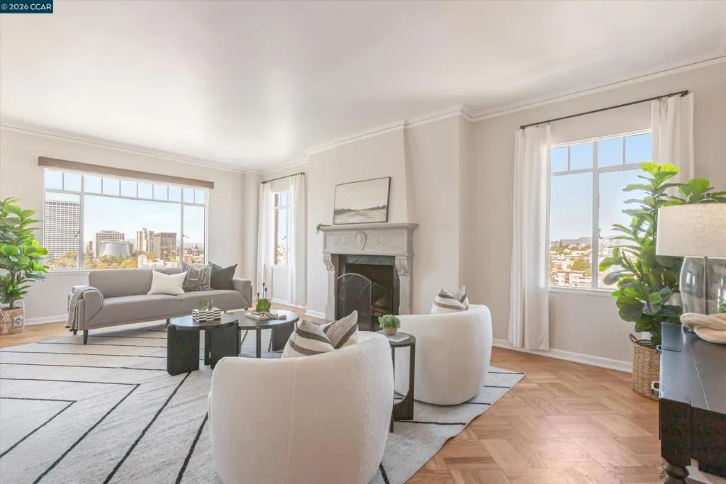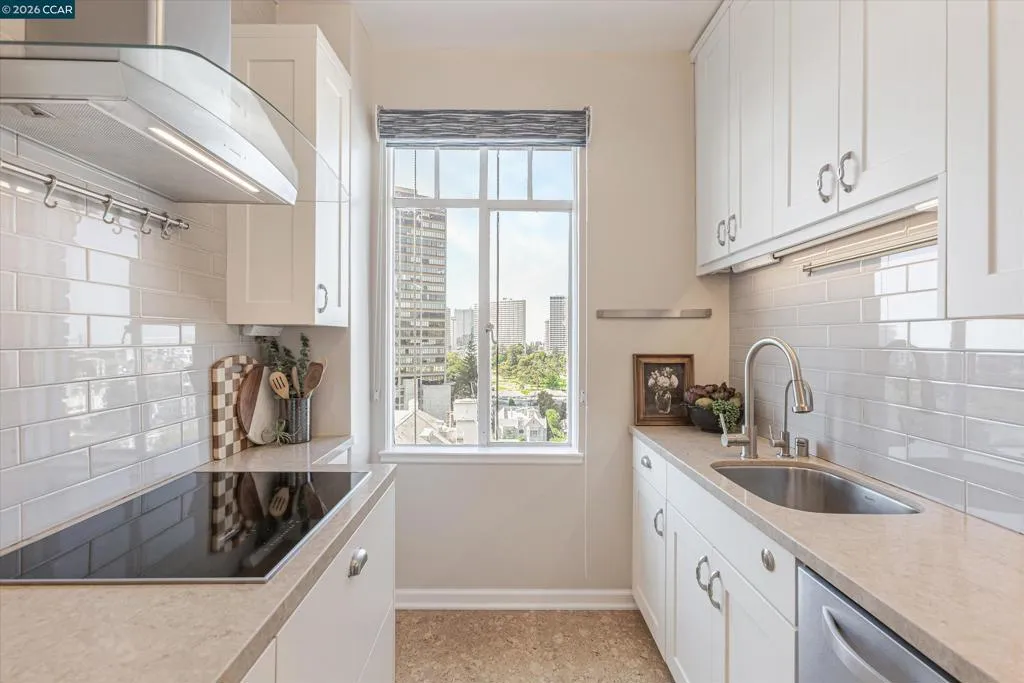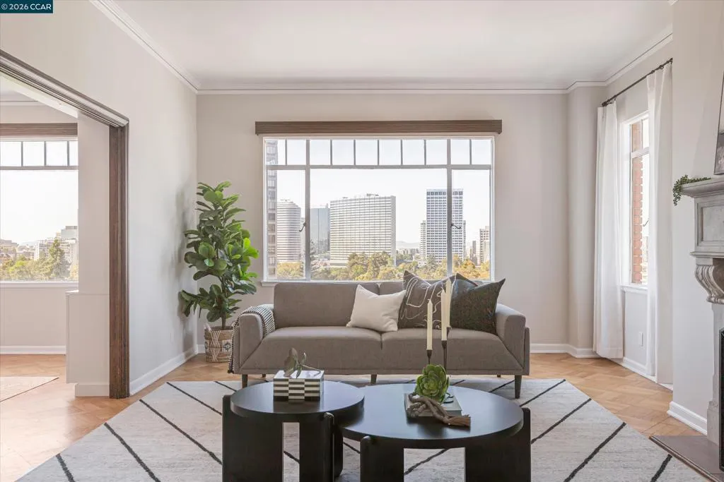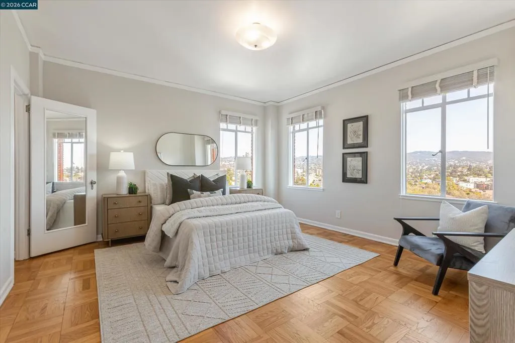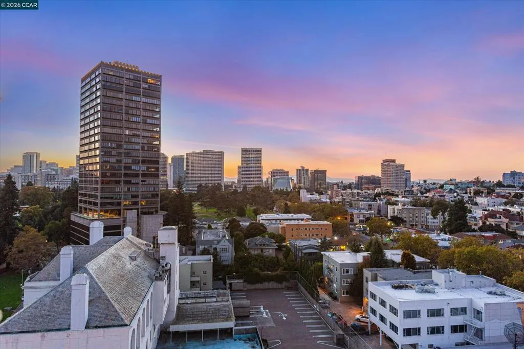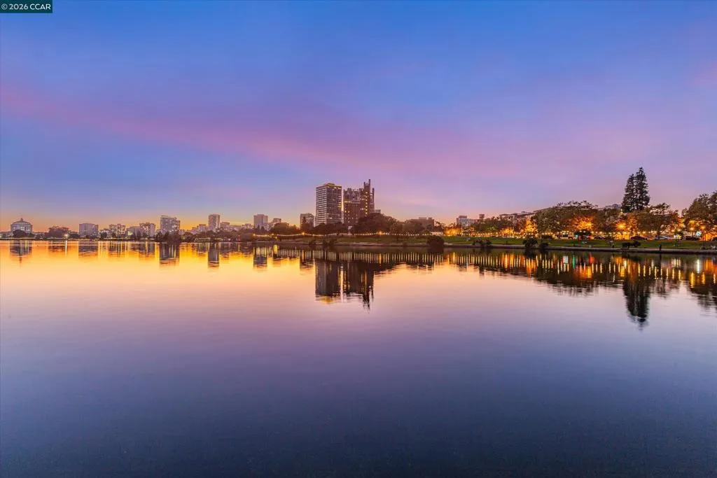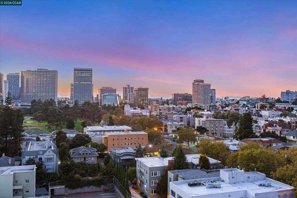 Welcome to the iconic Bellevue-Staten—an architectural gem designed by renowned architect Herman C. Baumann in timeless Art Deco style. Completed in 1929, this historic landmark has long been a defining presence on Oakland’s skyline. This gracious corner residence captures sweeping views of Lake Merritt, the surrounding park, vibrant downtown lights, and the rolling Oakland hills. Expansive living spaces offer the perfect balance of comfort and sophistication, ideal for both everyday living and entertaining. The beautifully renovated Scandinavian-style kitchen features stainless steel appliances, sleek slab countertops, generous cabinetry, and a charming coffee nook—perfect for enjoying morning light and serene views. The light-filled bedroom showcases stunning city and lake vistas and includes two closets, one thoughtfully designed with custom organizers. A fully upgraded bathroom offers a spa-like feel with a walk-in shower, textured tile, and heated floors. Throughout the home, timeless details such as vintage crown molding, parquet wood floors, built-in cabinetry, arched doorways, and soaring 9-foot ceilings add warmth and character. Residents enjoy full-service amenities including a 24-hour doorman, valet service, secure package handling, internet, utilities, and laundry—all covered by the HOA. With an exceptional 96 Walk Score, you’re just moments from dining, shopping, entertainment, the Farmers Market, Children's Fairyland, Lakeside Park Garden Center, museums, and downtown Oakland. Listed on the National Register of Historic Places and benefiting from the Mills Act, this home offers the rare advantage of reduced property taxes—an exceptional opportunity to own a piece of Oakland history. Views: Downtown