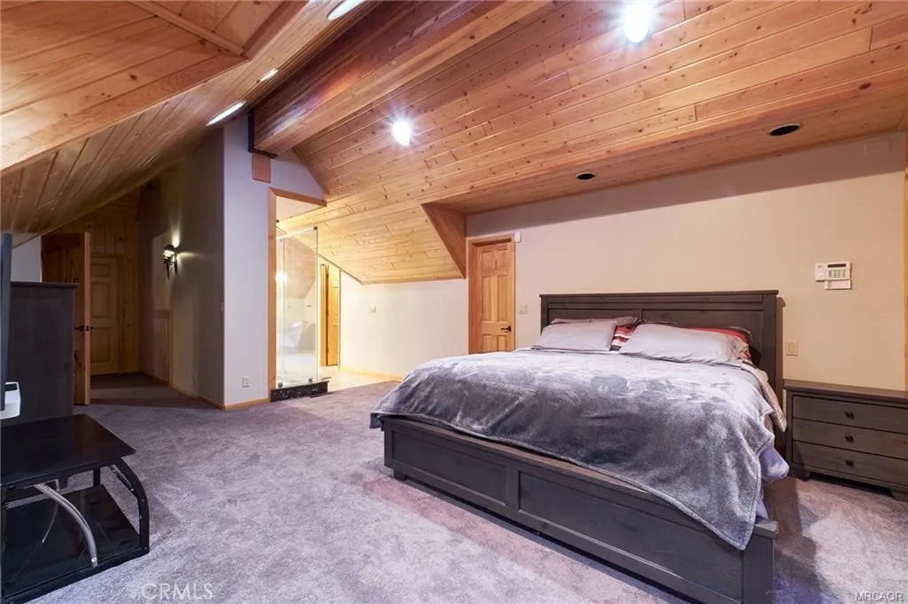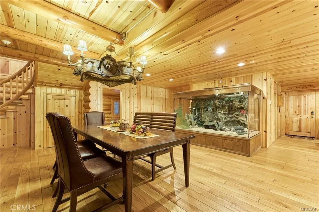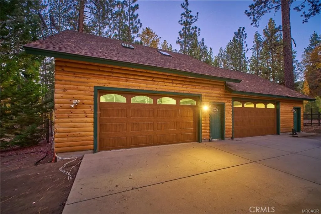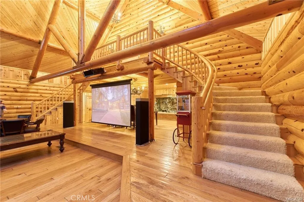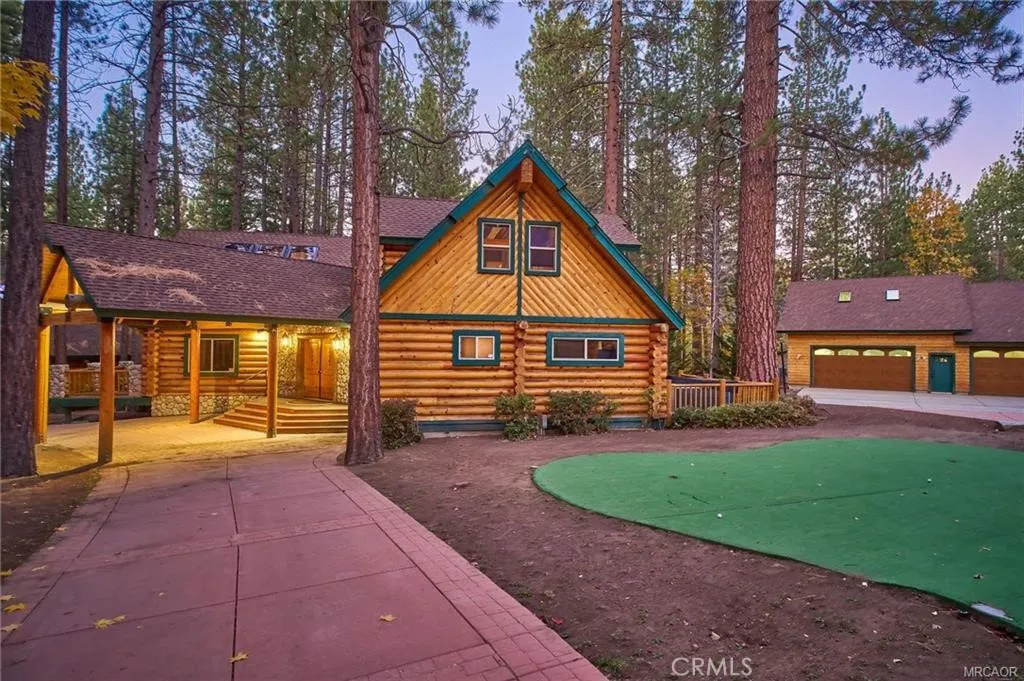 Iconic dual-cabin mountain estate on 1.14 acres with 7,162 sq ft of total living space in one of Big Bear's most desirable neighborhoods. A dual gated entry leads to two beautifully crafted full log-style homes surrounded by lush forest. Cabin One features a porte-cochère, open living and dining area with stone fireplace, wood flooring, and a large kitchen with stainless steel appliances, stone counters, pantry, and laundry. Main level includes two ensuite bedrooms and a guest 1/4 bath. Upstairs offers a huge ensuite primary bedroom with dual vanities, glass shower, stand-alone tub, water closet, and an upper den. Cabin Two showcases a dramatic dual staircase leading to an upper-level ensuite primary with an 8-person jacuzzi, walk-in shower, dual vanities, and water closet. Main level includes an additional ensuite bedroom, a spacious great room with stone fireplace, and formal dining. Kitchen with stainless appliances, stone counters, pantry, and laundry room. Exterior amenities , lush landscaping, five entertainment decks, a three-hole putting green, and an oversized garage previously used as a training facility for professional fighters . A rare mountain compound offering luxury, space, and a true escape and variety of possible uses.