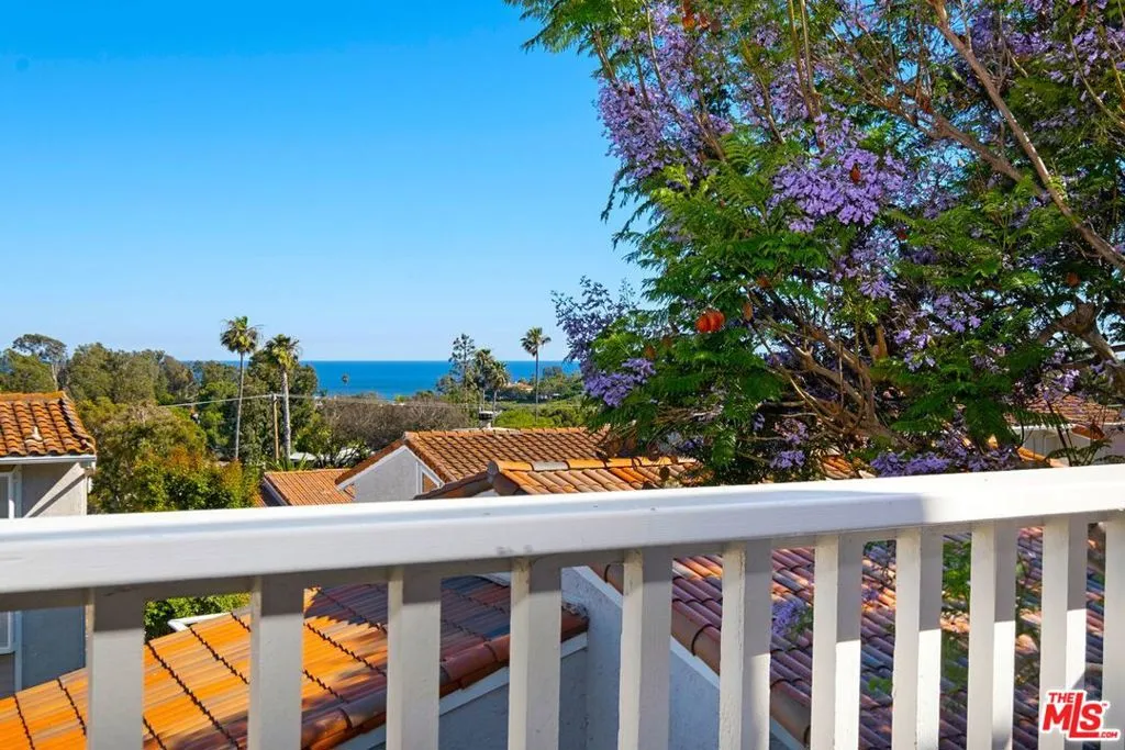 Guard gated Malibu Villas townhouse with ocean views and 2 bedrooms & 2.5 bathrooms. Stylish finishes including high beam ceilings, hardwood floors, art deco counters, newer appliances, washer/dryer & a decorative fireplace. Ocean view from the sunshine filled primary suite with balcony, high ceilings, huge closet, separate tub/shower and dual sinks. California indoor/outdoor living with a center atrium off kitchen and dining room, and a private front patio. Direct entrance from the 2 car garage with storage and washer/dryer. This meticulously maintained community offers a pool, spa, sundeck, sauna and clubhouse. Residents of Malibu Villas enjoy being across the street from the famous Paradise Cove Beach/ Cafe and central to Point Dume Village, Zuma Beach, Trancas Country Market, hiking trails and Pepperdine University.