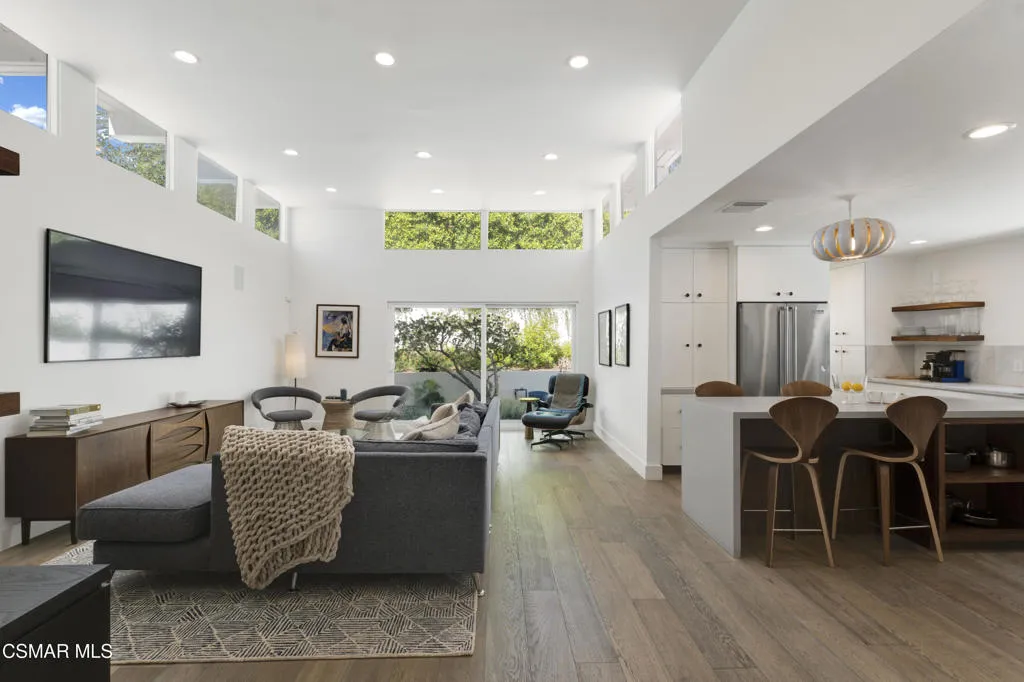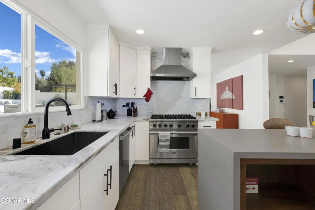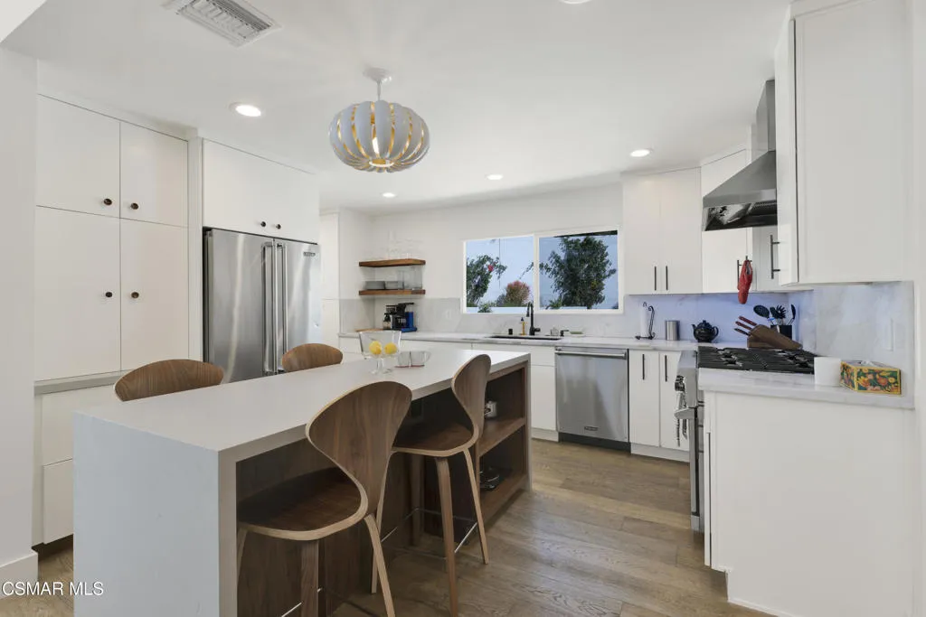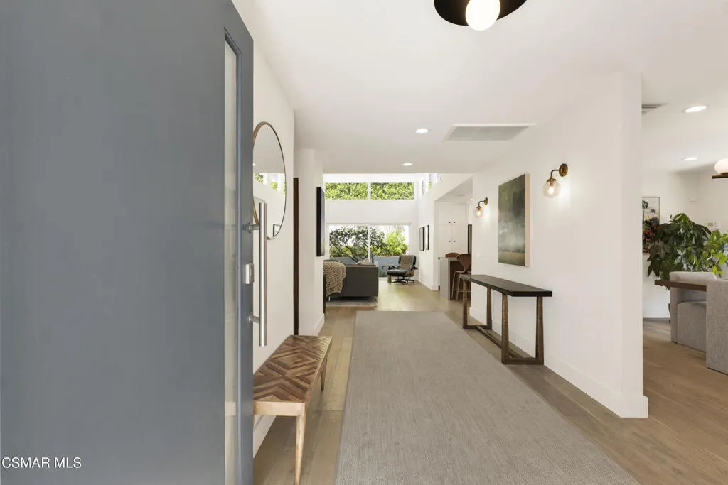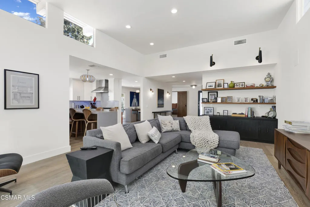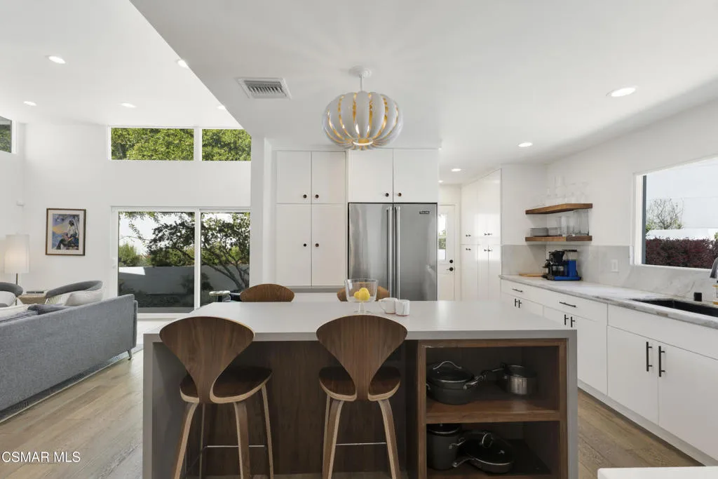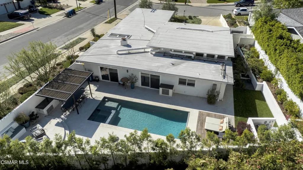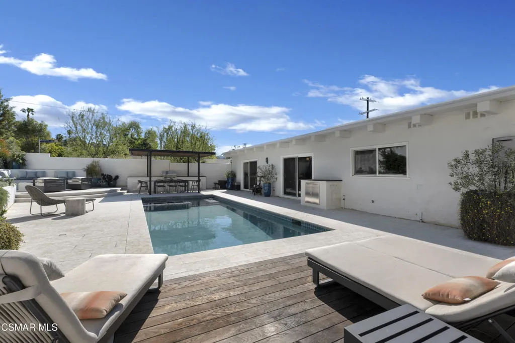 Stunning one story Mid- century completely remodeled, corner single story home! You are welcomed into an elegant, light and bright living room with high ceilings & recessed lighting. Beautifully upgraded kitchen with a new island that features stone/waterfall top and walnut components and new cabinets throughout. All the bathrooms have been beautifully remodeled with custom vanities, toto toilets, new lighting and more. All of the interior doors have been upgraded to new solid core walnut with new hardware. This home also features, new A/C ducting, new roof, copper plumbing, beautiful wood floors, a new tankless water heater, and a nicely manicured backyard. A brand new custom pool with an auto-recessed built in cover was just completed. Enjoy the lovely outdoors with new sandstone paver decking, a firepit and sitting area and a built in bbq unit. Located south of the boulevard and minutes to the 'Commons' in Calabasas. Less than 15 miles from the beach and close to great schools. Great location! No HOA fees! Don't let this one go!