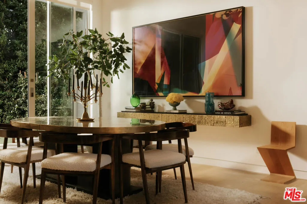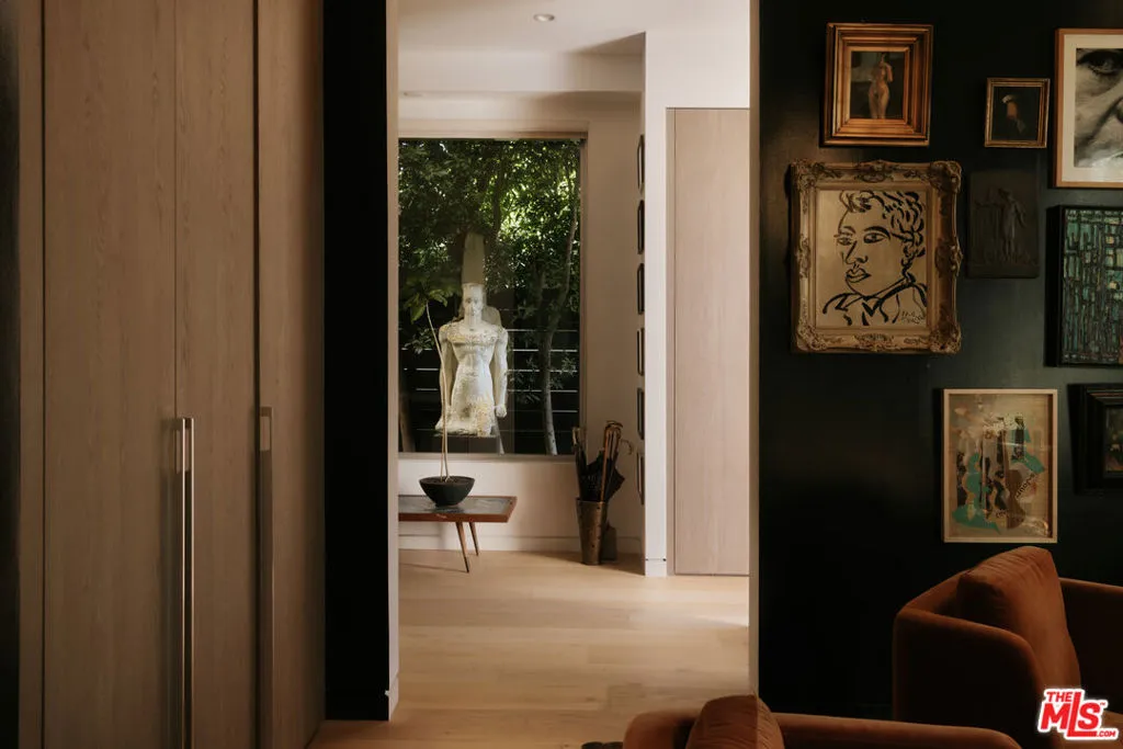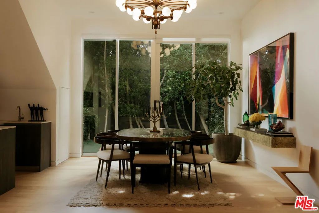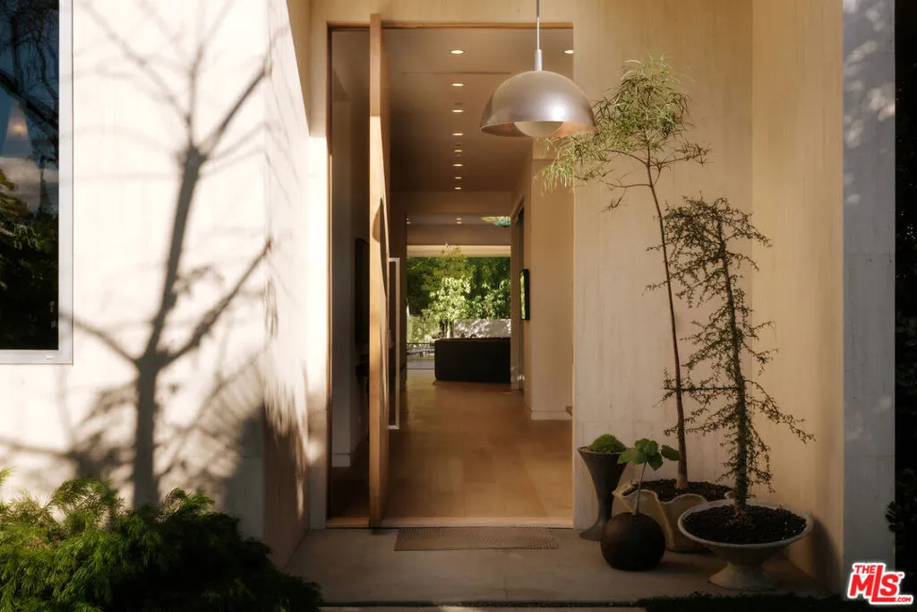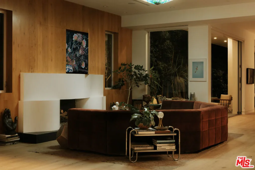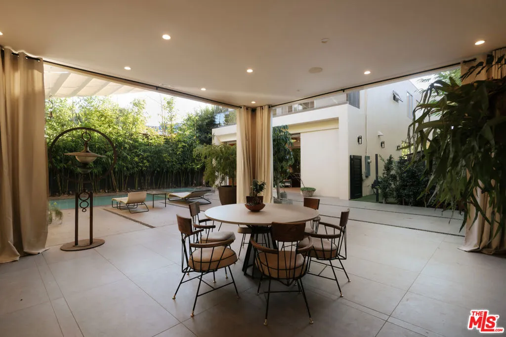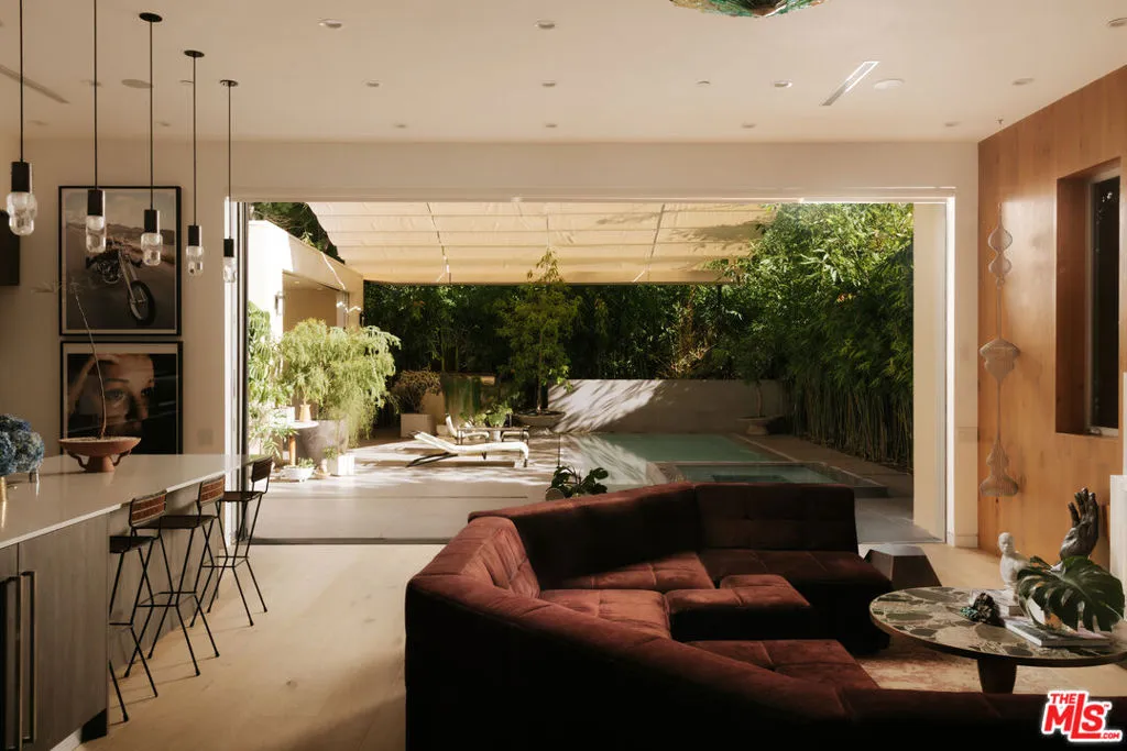 A Brazilian-inspired contemporary hideaway: Fully reimagined for refined and turnkey living, reminiscent of a private boutique hotel. Spanning nearly 4,000 square feet with four bedrooms and five baths, this West Hollywood residence sits on one of the neighborhood's largest lots, positioned mid-block on a coveted cul-de-sac. Walkable to premier shopping and dining, yet quietly set behind mature landscaping, the home offers exceptional privacy and serenity. Eleven-foot ceilings and expansive pocket doors create seamless indoor-outdoor living, filling the interiors with natural light. The family room features custom oak paneling, an integrated media wall, bespoke fireplace, and an imported mid-century chandelier from a historic Italian hotel. Oak millwork and curated lighting including pieces by Carlo Nasson continue throughout, establishing a warm, organic modern aesthetic. Envisioned with meaningful attention to detail rather than for resale. The kitchen is treated as an architectural statement with sculptural Italian pendants, a plumbed built-in coffee system, and premium Miele appliances. The primary suite is a private retreat with custom oak paneling, a built-in upholstered bed, tailored drapery, vintage Italian chandelier, suspended ethanol fireplace, and an additional custom closet. Outdoor grounds feel resort-like with layered hedges, specimen trees, bamboo, a zero-edge pool, spa, and cabana. Motorized shades provide the utmost privacy and break from the LA sun while using an architectural esthetic that can be retracted easily by remote. Brand new Control 4 automation, solar, tankless systems, and integrated audio complete this exceptional offering. Gated and secure with ample parking for 4 cars. Nothing else like it available in this prime location.
