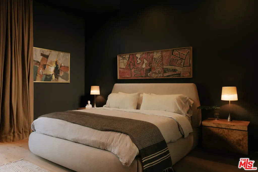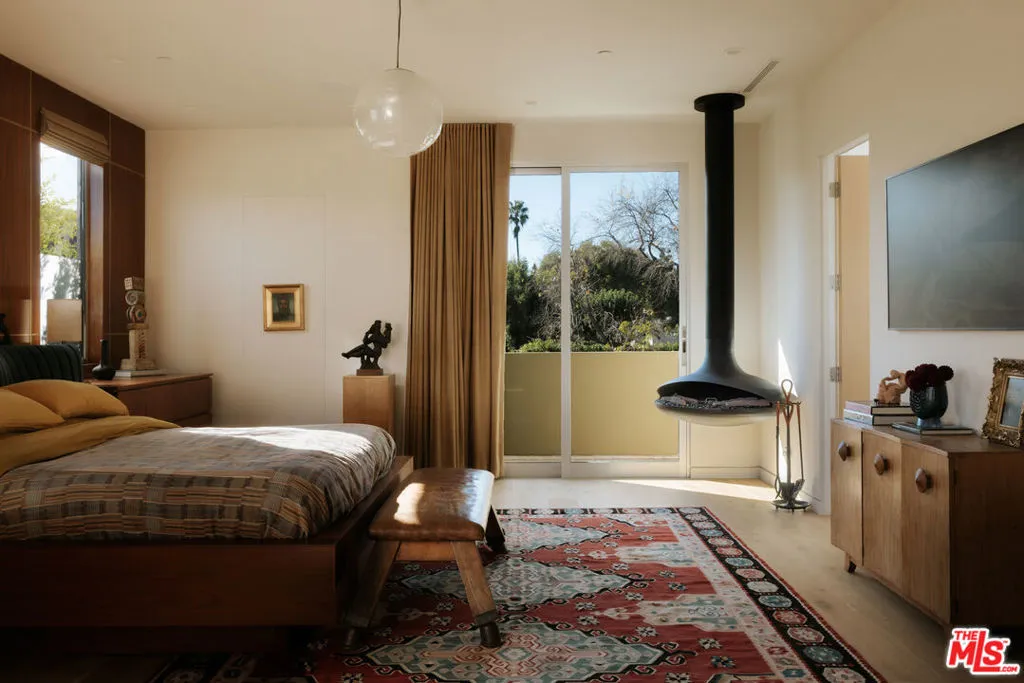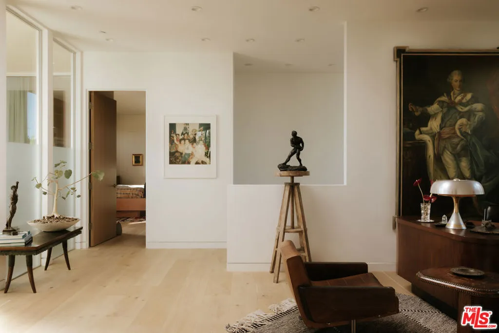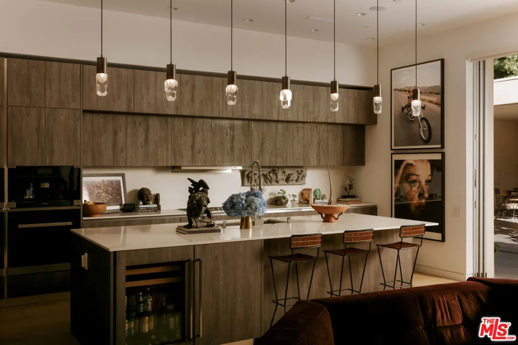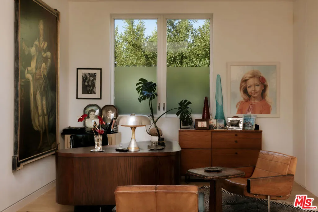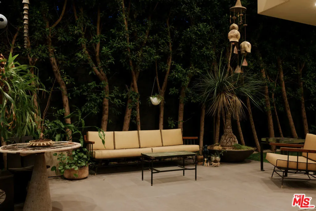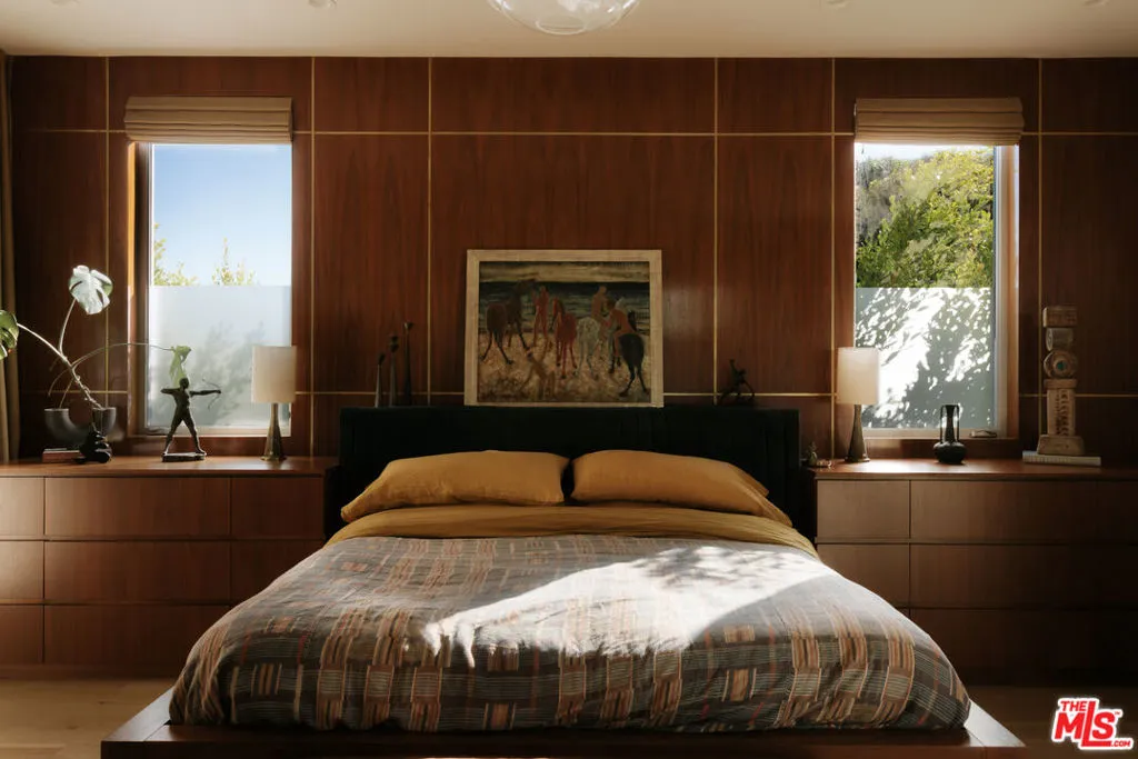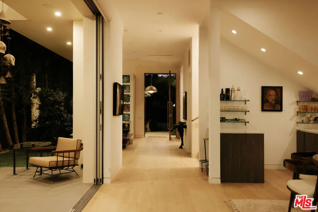 A Brazilian-inspired contemporary hideaway: Fully reimagined for refined and turnkey living, reminiscent of a private boutique hotel. Spanning nearly 4,000 square feet with four bedrooms and five baths, this West Hollywood residence sits on one of the neighborhood's largest lots, positioned mid-block on a coveted cul-de-sac. Walkable to premier shopping and dining, yet quietly set behind mature landscaping, the home offers exceptional privacy and serenity. Eleven-foot ceilings and expansive pocket doors create seamless indoor-outdoor living, filling the interiors with natural light. The family room features custom oak paneling, an integrated media wall, bespoke fireplace, and an imported mid-century chandelier from a historic Italian hotel. Oak millwork and curated lighting including pieces by Carlo Nasson continue throughout, establishing a warm, organic modern aesthetic. Envisioned with meaningful attention to detail rather than for resale. The kitchen is treated as an architectural statement with sculptural Italian pendants, a plumbed built-in coffee system, and premium Miele appliances. The primary suite is a private retreat with custom oak paneling, a built-in upholstered bed, tailored drapery, vintage Italian chandelier, suspended ethanol fireplace, and an additional custom closet. Outdoor grounds feel resort-like with layered hedges, specimen trees, bamboo, a zero-edge pool, spa, and cabana. Motorized shades provide the utmost privacy and break from the LA sun while using an architectural esthetic that can be retracted easily by remote. Brand new Control 4 automation, solar, tankless systems, and integrated audio complete this exceptional offering. Gated and secure with ample parking for 4 cars. Nothing else like it available in this prime location.