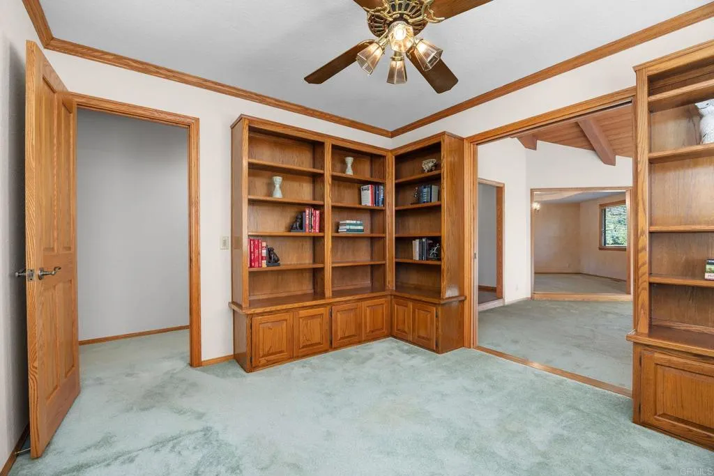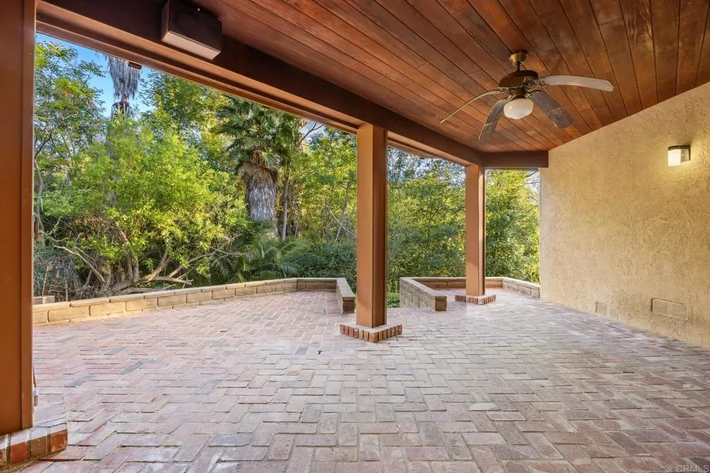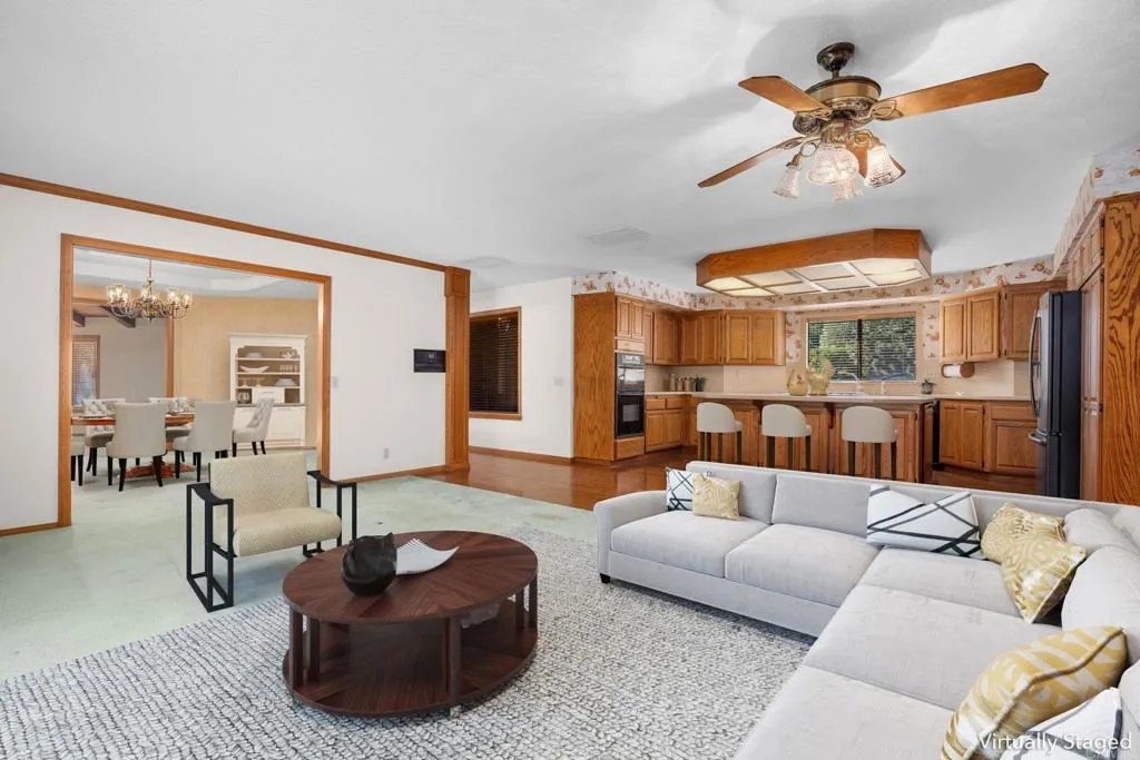 Set on an expansive private half acre lot, this extraordinary ranch-style home offers timeless character and remarkable flexibility. Built by the current owner in 1986 with quality finishes and thoughtful design, the home makes a memorable first impression with manicured landscaping, a circular driveway, mature trees, and a welcoming covered front porch. Inside, the formal entry opens to a spacious living room anchored by a gas fireplace with brick hearth and mantel, natural wood pitched ceilings, and windows that bring in beautiful light. The living room flows to a generous formal dining room, while a built-in library with pocket doors offers a quiet retreat or home office. The kitchen and family room are the heart of the home, connected in an open design ideal for everyday living and entertaining. The family room features built-in cabinetry, while the spacious kitchen offers a large center island with cooktop, beverage refrigerator, drawer microwave, double ovens, refrigerator, pantry, abundant storage, and a picture window overlooking the front yard and circular drive. Sliding doors extend this central living area to a large private balcony, creating true indoor-outdoor living surrounded by mature greenery. Beneath the balcony, a covered patio with an inground spa adds an additional outdoor retreat, complemented by garden areas, fruit trees, mature growth, and a creek tucked behind the home. The bedroom wing includes two secondary bedrooms, one with a built-in desk, a shared hallway bathroom, spacious laundry room, and a comfortable primary suite with walk-in closets and an ensuite bath with dual sinks, sunken tub, and step-in shower. Additional amenities include a powder room, mudroom with storage, two-car garage with cabinetry, and a whole-house water conditioner. Below the primary residence, the expansive basement functions as its own versatile secondary space. Not included in the listed livable area, this bonus level offers more than 1,600 square feet of workspace and storage, plus a refreshed game room, full bathroom, built-on sunroom, covered patio access, and a second driveway. Convenient to shopping, dining, parks, schools, and hiking trails, this one-of-a-kind property invites comfort, creativity, and possibility.