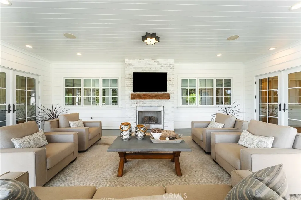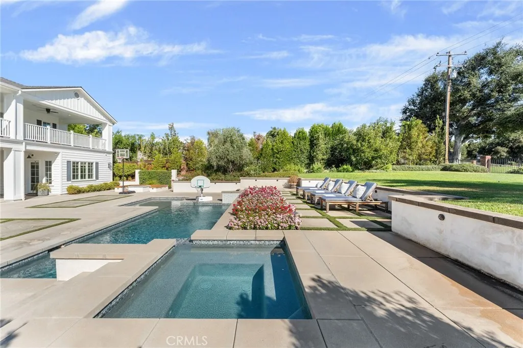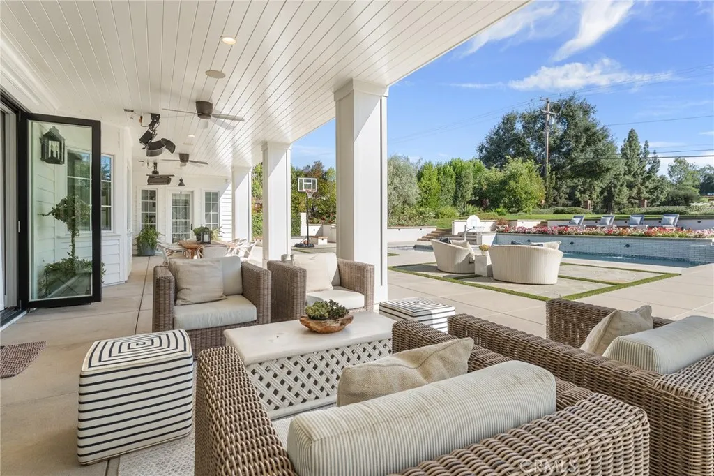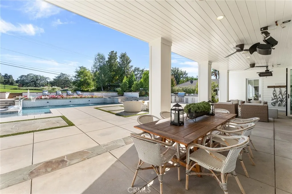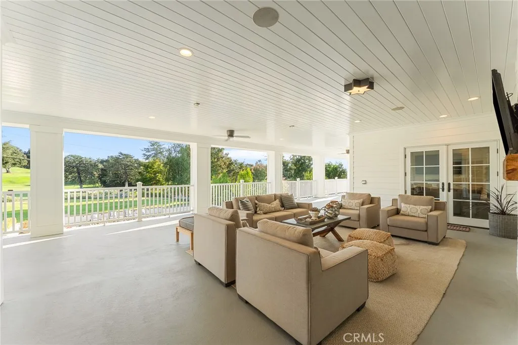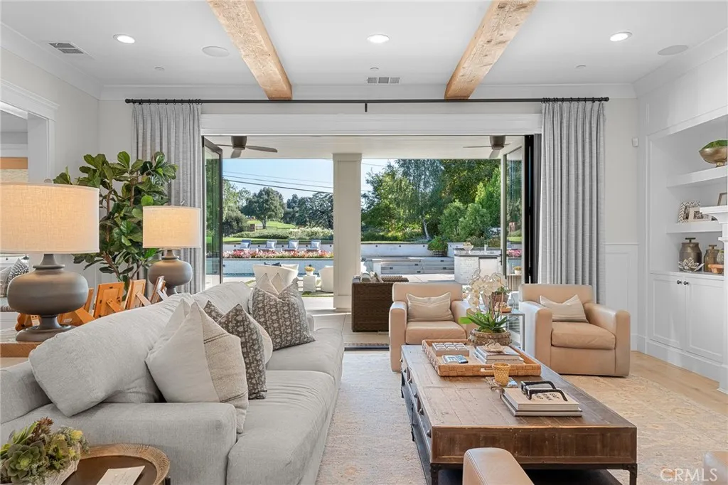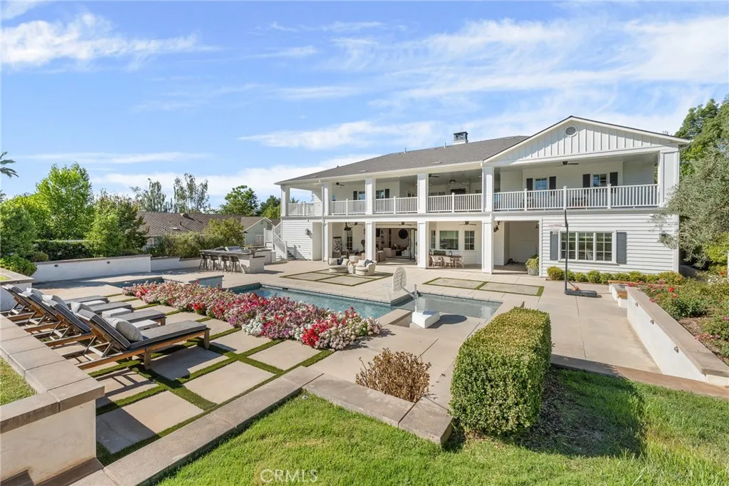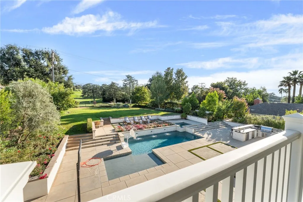Set along the 12th green of Redlands Country Club, this custom-built 2017 residence offers a rare blend of timeless East Coast architecture and modern California living. With sweeping golf course and mountain views, the home is designed to embrace its setting at every turn. A welcoming front porch and Dutch door open to an airy, open-concept layout where the kitchen, family room, and outdoor spaces connect seamlessly. The chef’s kitchen is both refined and functional, featuring an oversized marble island, professional-grade appliances, farmhouse sink, and a charming breakfast nook. Expansive accordion doors open to a resort-inspired backyard overlooking the fairway—complete with a covered patio, pool and spa, firepit, BBQ island, and generous lawn. The setting offers both privacy and picturesque views rarely found. The main level includes two bedrooms, including a private guest suite with direct outdoor access. Upstairs, a spacious loft anchors two ensuite bedrooms, a gym (optional sixth bedroom), and a luxurious primary retreat with private terrace, fireplace, dual walk-in closets, and a spa-like bath. Additional highlights include a detached office with half bath, upstairs laundry, mudroom off the garage, and a 3-car tandem garage. A distinctive offering where architecture, comfort, and an exceptional golf course setting come together.